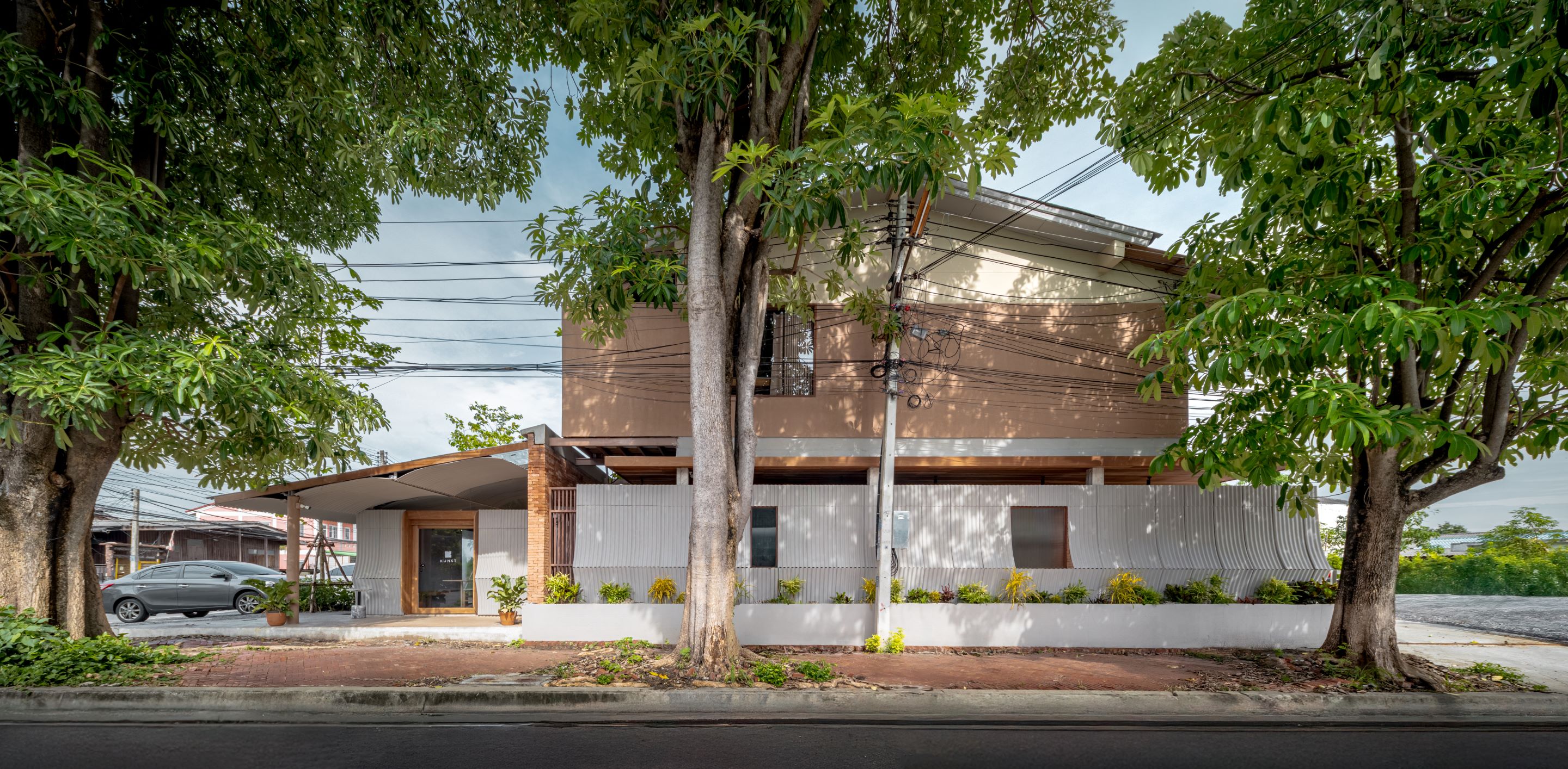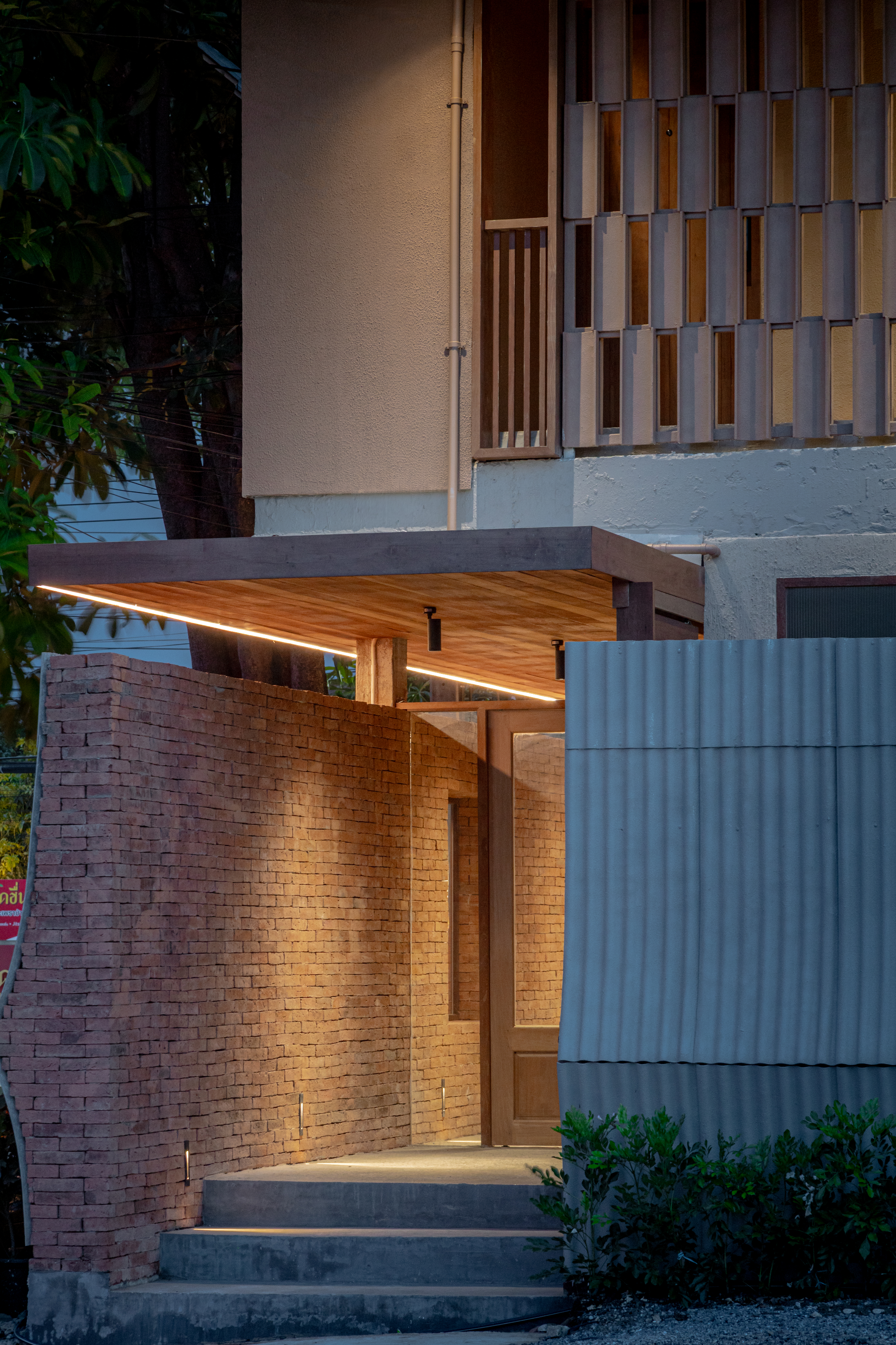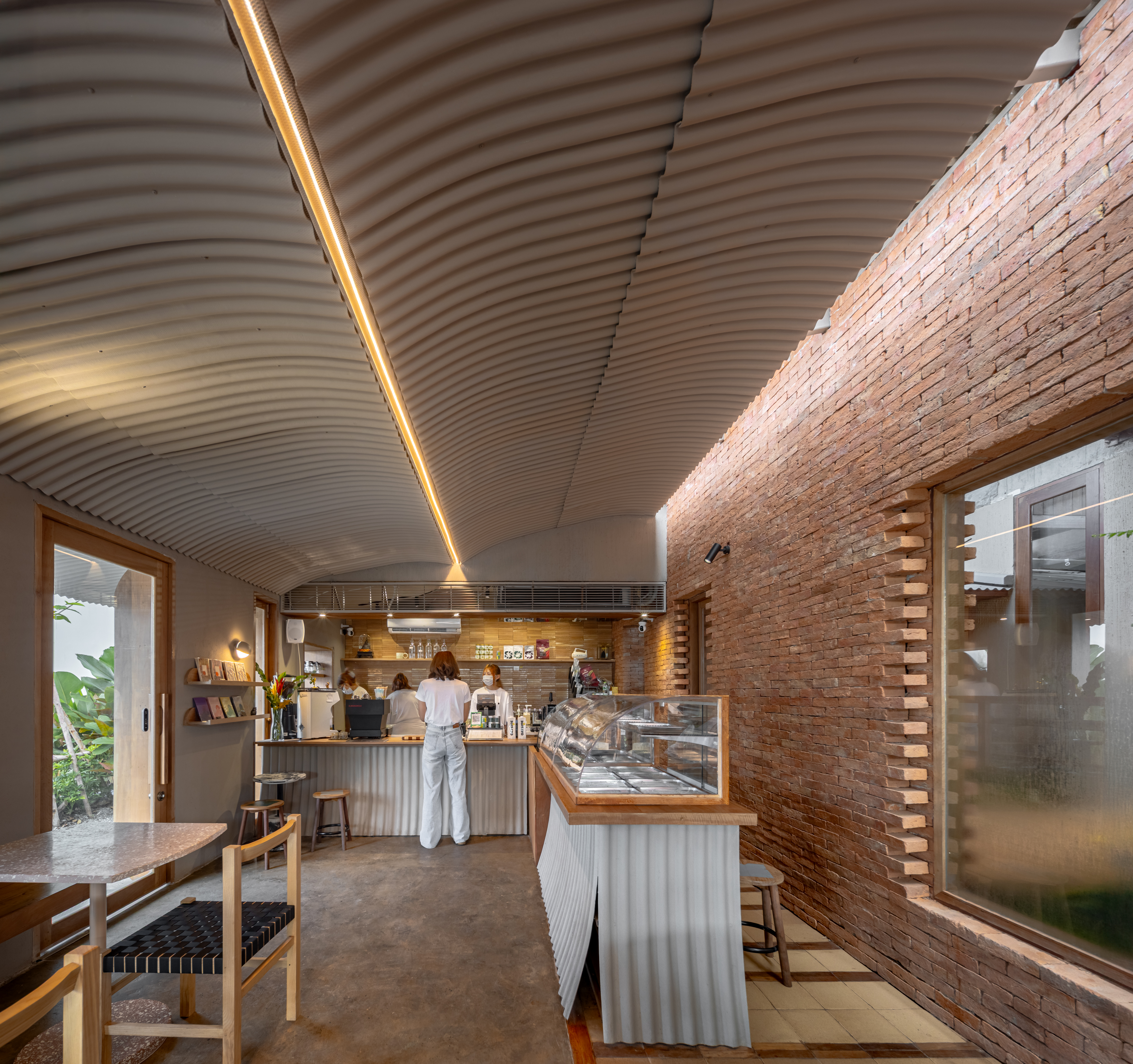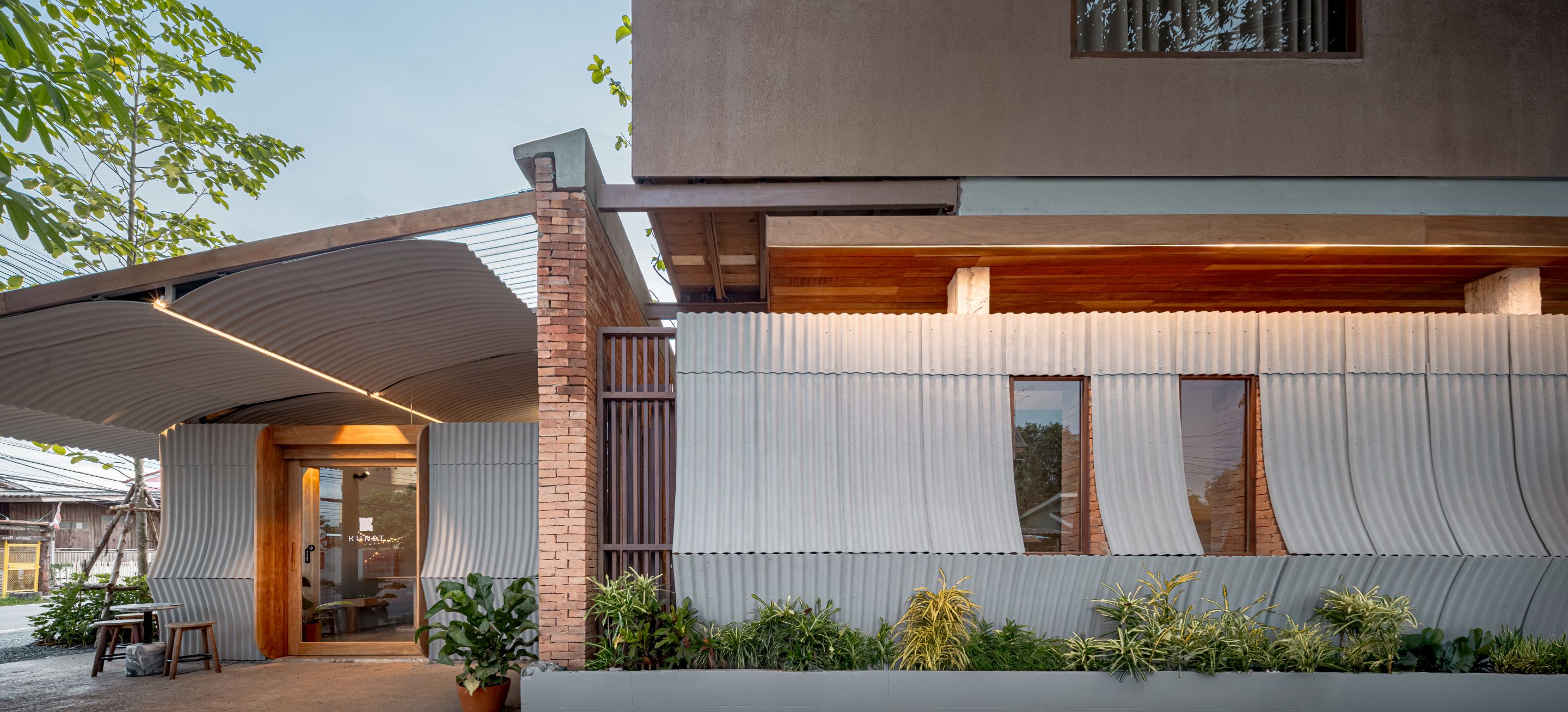 디자인은 아유타야의 일상적 건축에서 차용한 이미지와 재료에서 출발한다. 전통 가옥 처마에서 흔히 볼 수 있는 작은 곡선의 골함석 지붕재가 대표적이다. 이 재료는 지붕이 아닌 파사드, 천장, 경계벽의 마감재로 새롭게 사용되며, 단순한 기능을 넘어 역사와 기억, 의도를 담아내는 서사적 장치로 확장됐다.