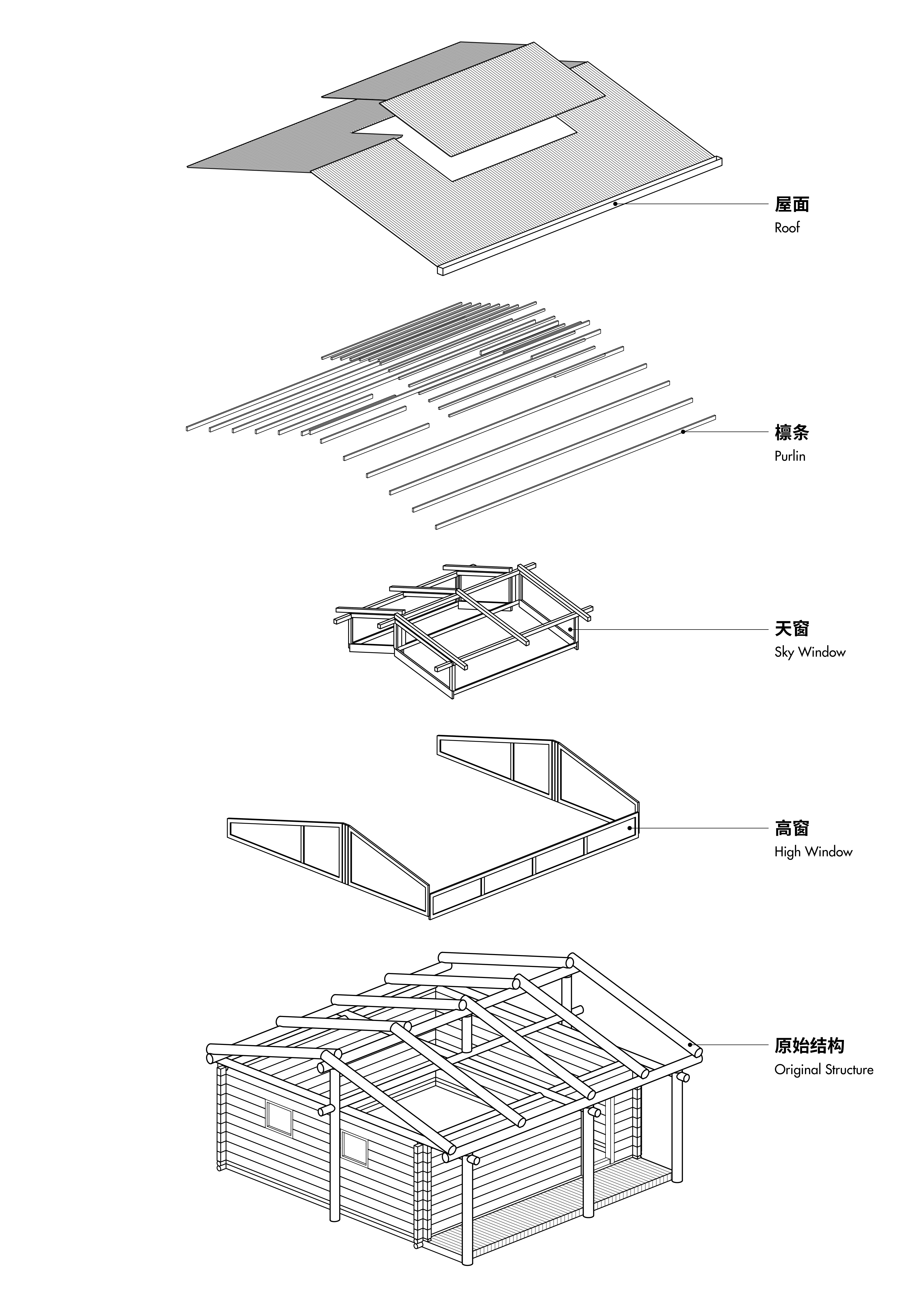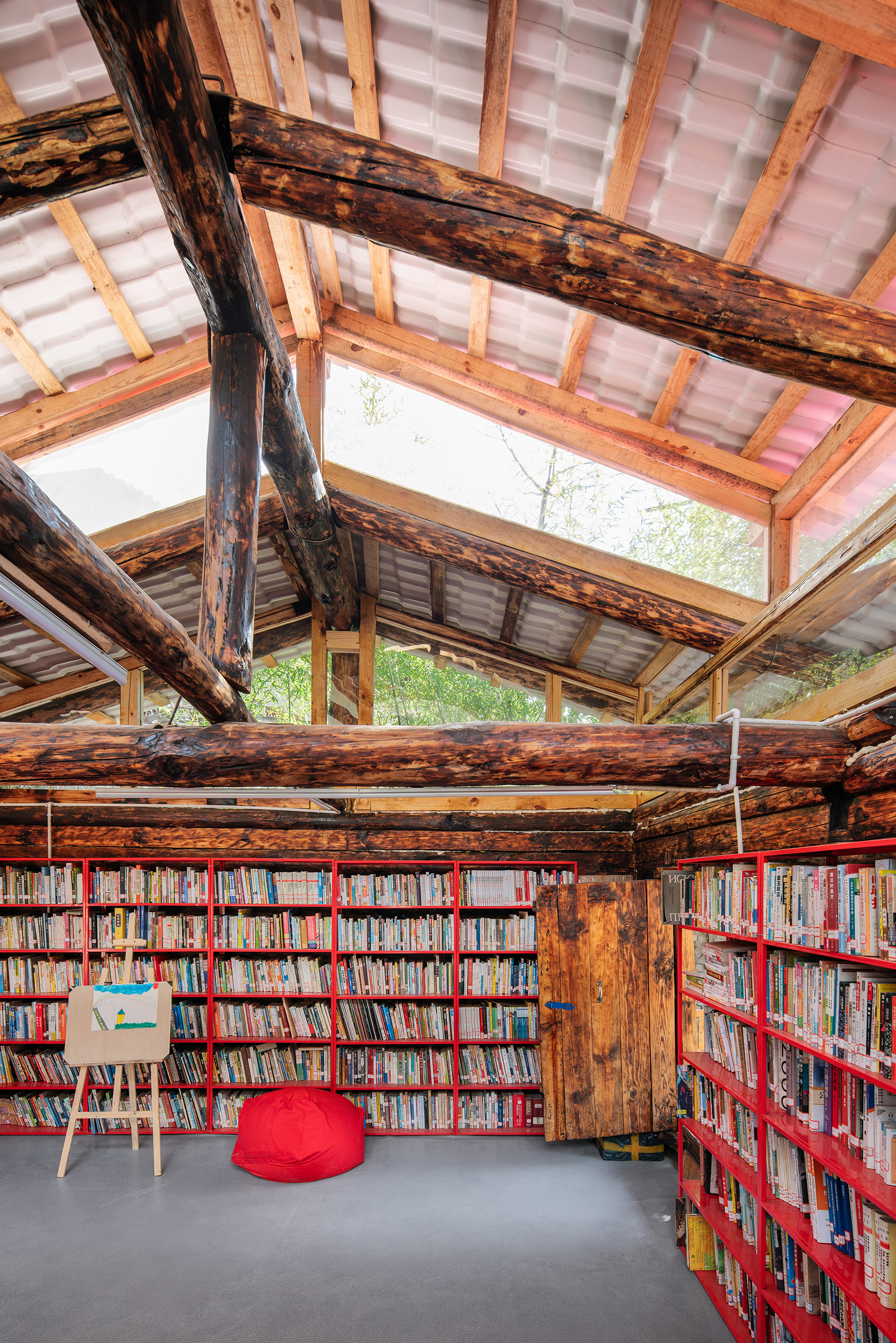 이번 리모델링은 6만 위안(한화 약 1,100만 원)이라는 극히 제한된 예산과 2주라는 짧은 시공 기간 속에서 진행됐다. 건축가는 기존 목조 구조의 상태가 양호하다는 점에 착안해, 후대에 추가된 벽과 천장을 걷어내고 원형 공간을 회복했다. 이를 통해 5×5m 크기의 유연한 열람실을 확보하고, 지붕 아래 그레이 스페이스도 다시 살아났다. 필요 없어진 중심 기둥은 철거하고, 기존 가로보에는 시력 보호용 LED 조명을 설치했다.