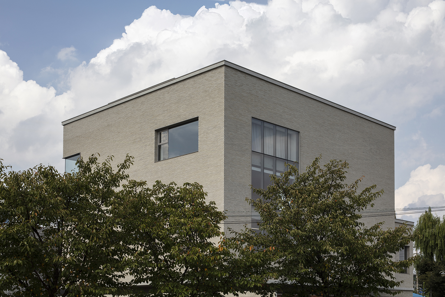 플래그쉽 스토어는 브랜드를 표현하는 집합체가 되어야 하기에 스테이모어라는 브랜드를 반영 할 수 있는 외부 마감재를 고민하였다. 스테이모어에서 제품에 사용하는 주요 재료를 공유받아 색감과 질감을 파악하고 최종적으로 회색을 띄는 미색의 거친 벽돌과 노출콘크리트, 목재를 선정 하여 브랜드 이미지가 건축물에 투영되도록 하였다. 주재료인 벽돌은 너무 깨끗하지 않은, 이색과 질감이 있는 점토질 벽돌로 계획하여 넓은 입면이 따뜻한 덩어리로 보이도록 하였다. 또한 건축물의 규모에도 불구하고 단독주택과 같이 최대한 낮게 깔리는 매스로 읽히도록 건축의 입면을 따라 콘크리트 띠를 두르고 벽돌의 질감을 나누어 건축물의 수평성을 강조하였다. 1층의 입면은 내부가 들여다보이는 창이 없기 때문에 온전한 벽으로 느껴진다. 보행자가 가장 가까이 마주하는 면에 촉감을 자극하고 보행의 즐거움을 주기 위해서 바닥에서부터 1층 상단의 띠까지 벽돌을 반으로 쪼개 시공하여 질감을 극대화하였고 1층 입면이 끝나는 지점에 있는 대문은 목재로 마감하고 전면에 보행자가 볼 수 있는 작은 조경을 두었다.