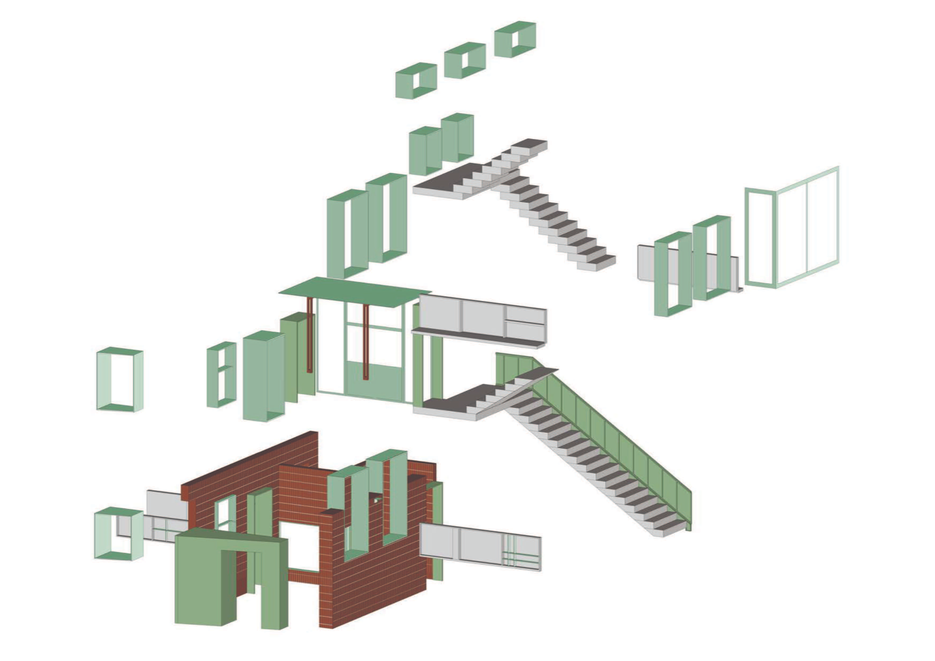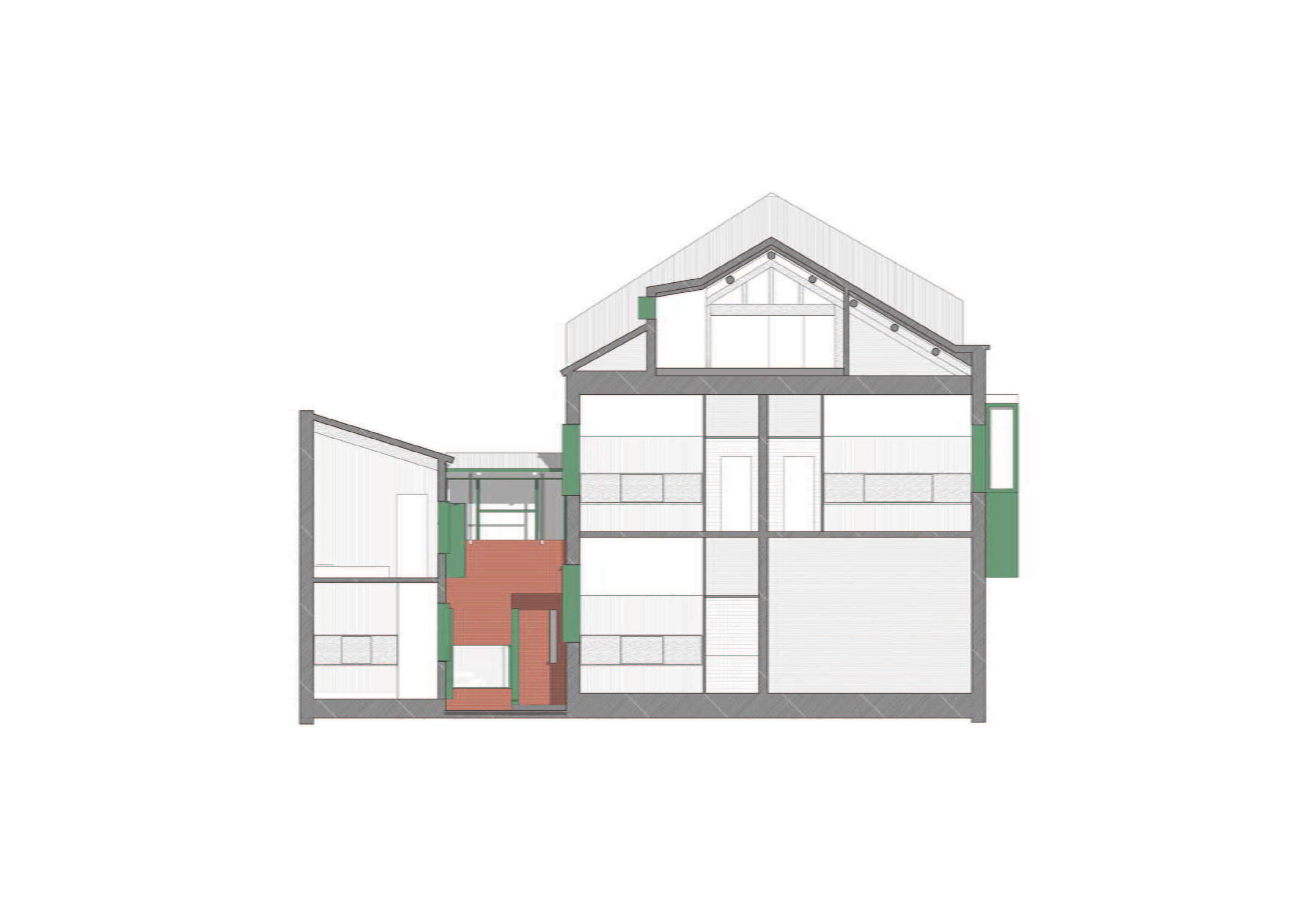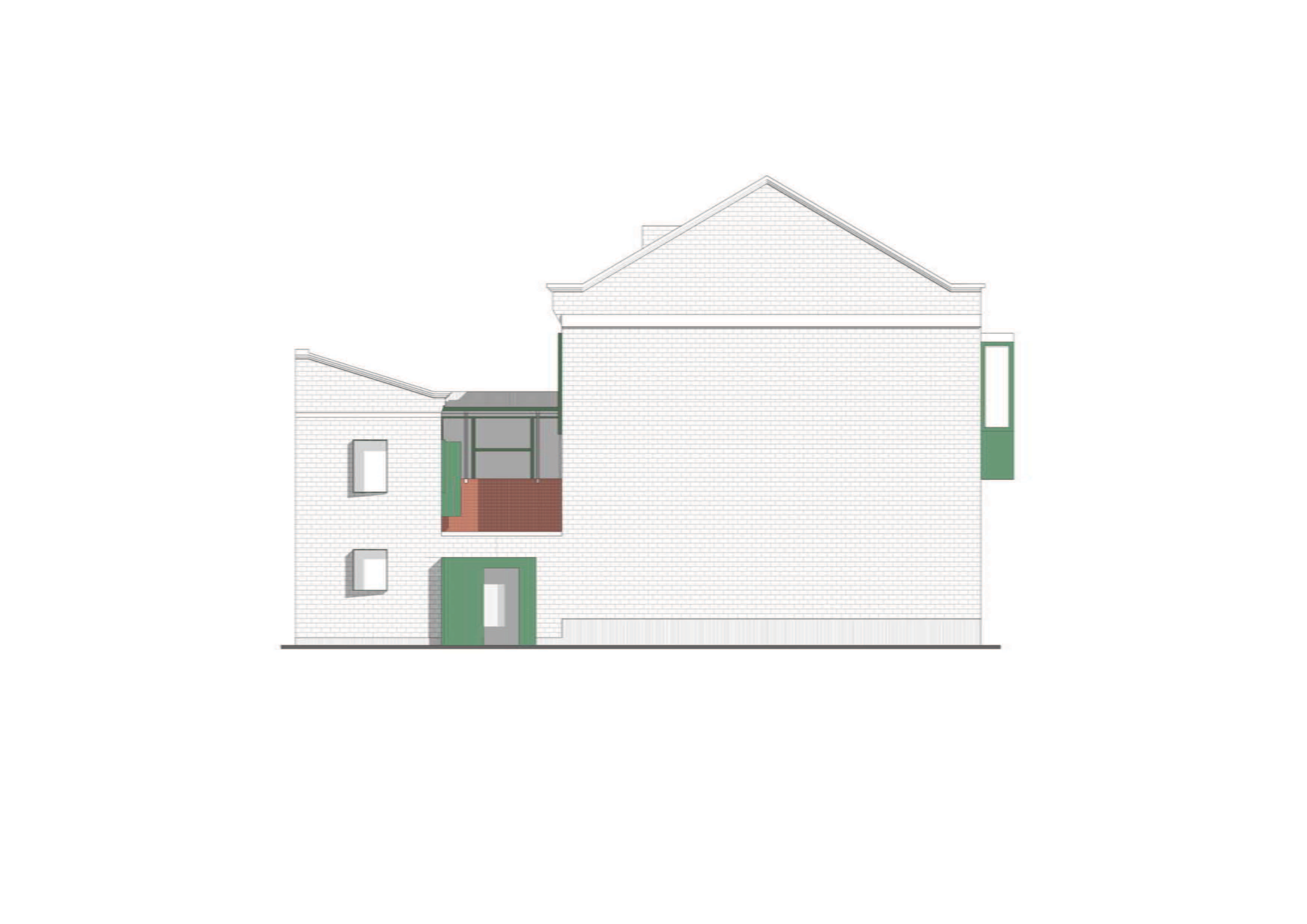 신구 벽돌을 병치해 재료의 대비와 연속성을 보여주었고, 창 덮개 시스템은 사용 경계를 넘어서는 새로운 공간 이미지를 만들었다. 짙은 녹색 알루미늄 패널로 마감한 창 덮개는 중정에 부유하는 듯한 상태를 연출했으며, 모든 창과 문은 내부와 외부의 경계로서 색과 재료를 통해 공간과 역사의 관계를 강조했다. 간결하고 순수한 기본 형태로 기존 건물에 개입하는 태도는 역사에 대한 존중이자 형식적 절제였다. 2층 테라스는 원래 지붕 형태를 이어가면서 목구조 처마 공간을 만들어 중정과의 교류 가능성을 넓혔다.