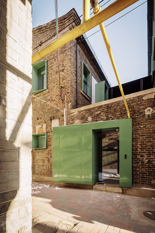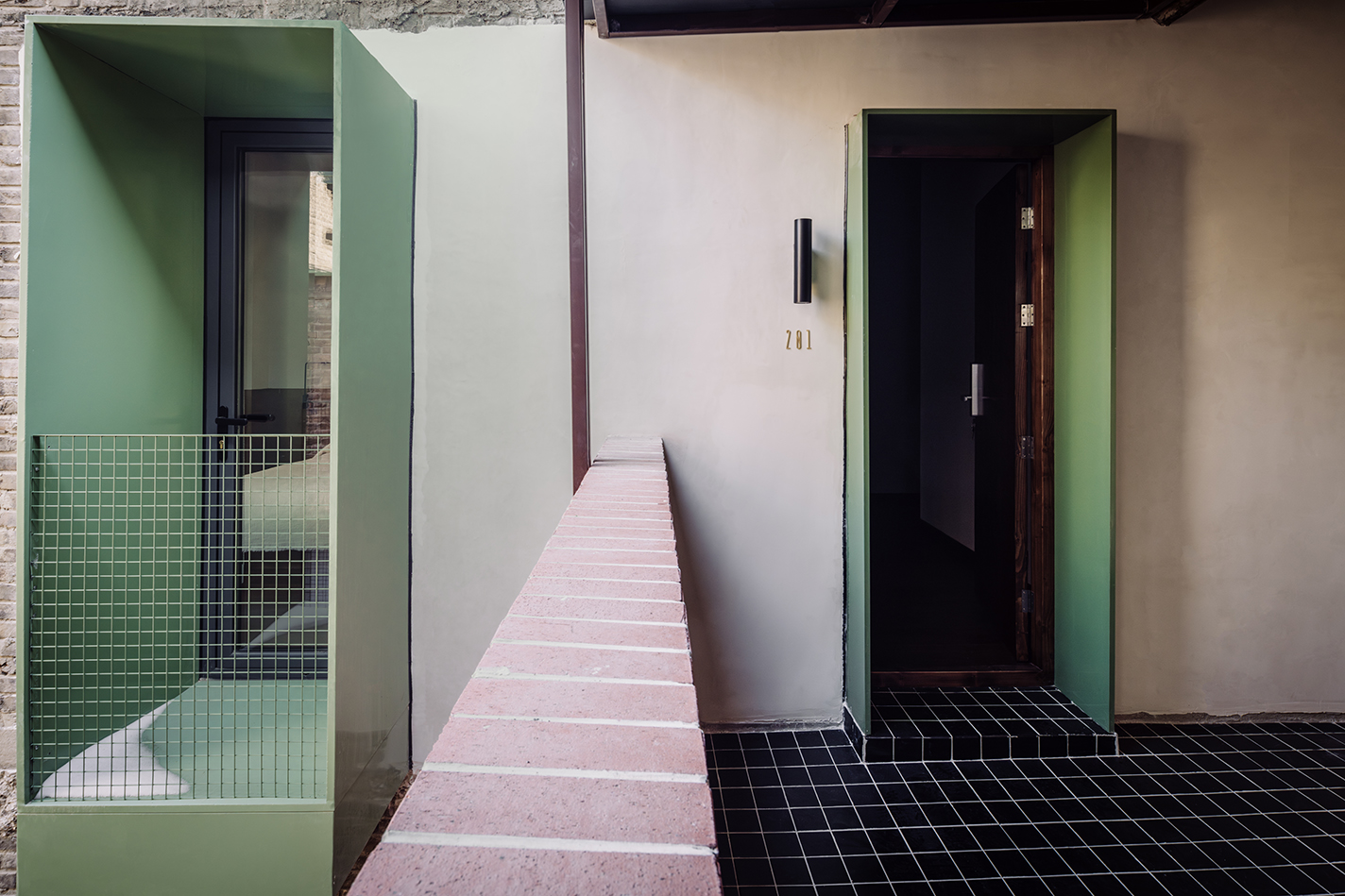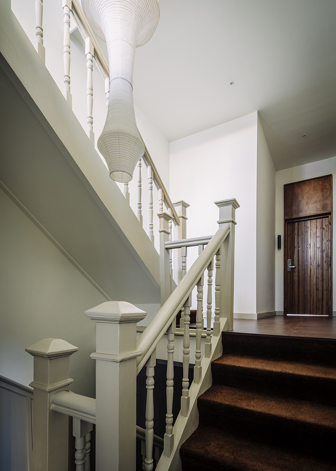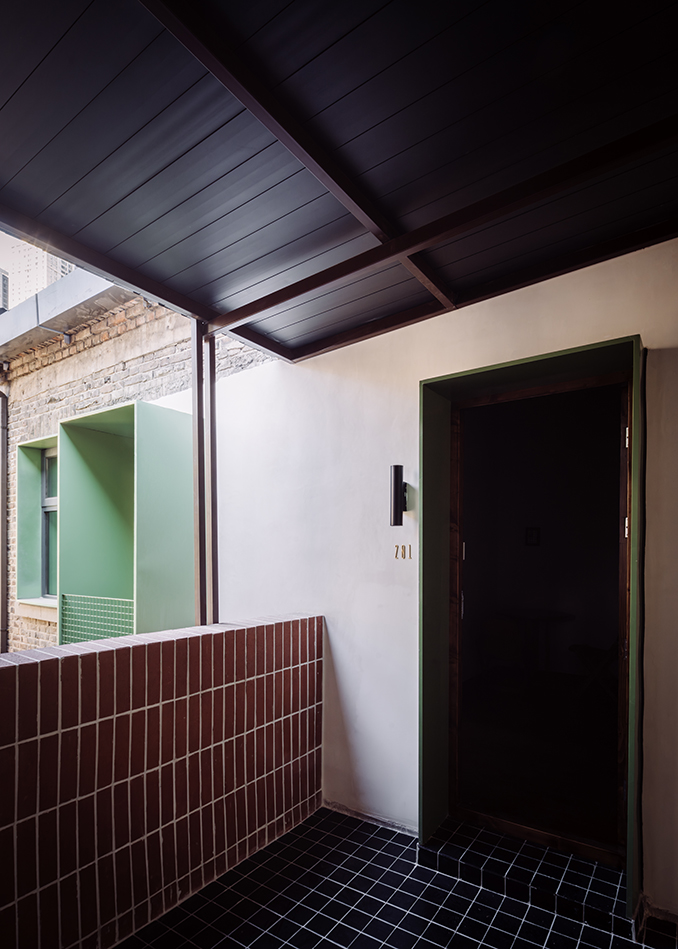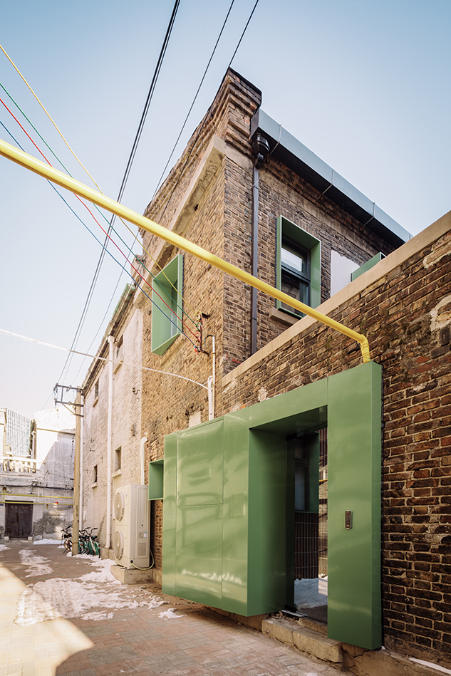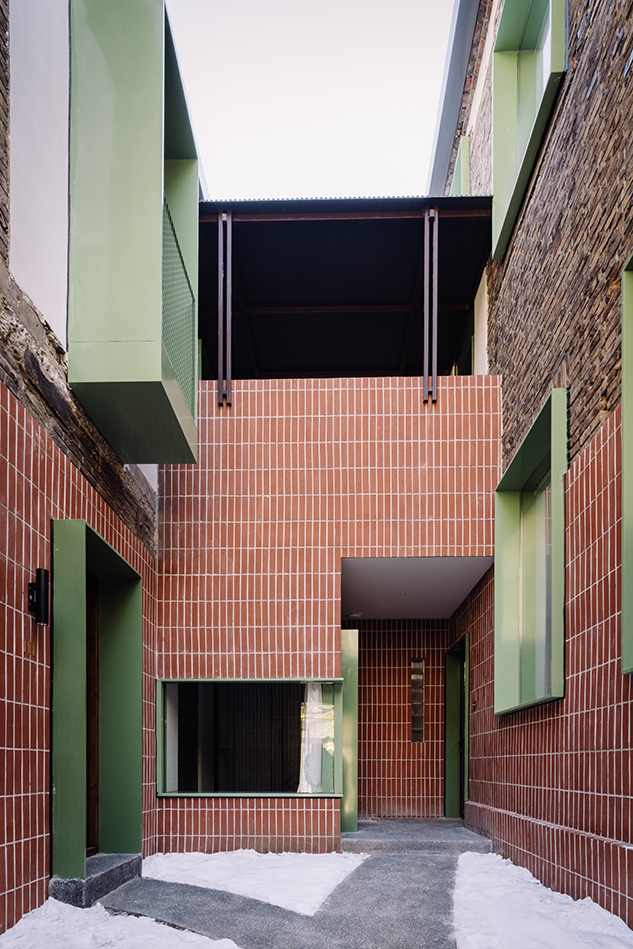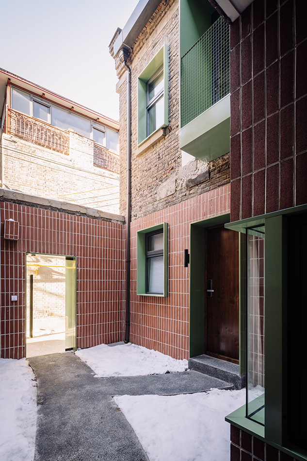 주 출입구는 돌출된 매스를 도입해 좁은 가로환경 속에서 입구를 강조하고, 동시에 기계·전기 설비를 감싸는 기능을 했다. 이 대비되는 매스감은 입구 중정 내부로도 이어졌다. 구 조계지 주거단지를 연상시키는 방식으로, 프로젝트는 오래된 건물 속 역사적 단서를 환기시키며 평범한 건물에서 특별함을 드러내고자 했다.