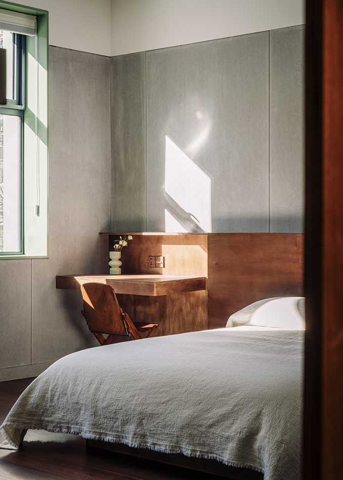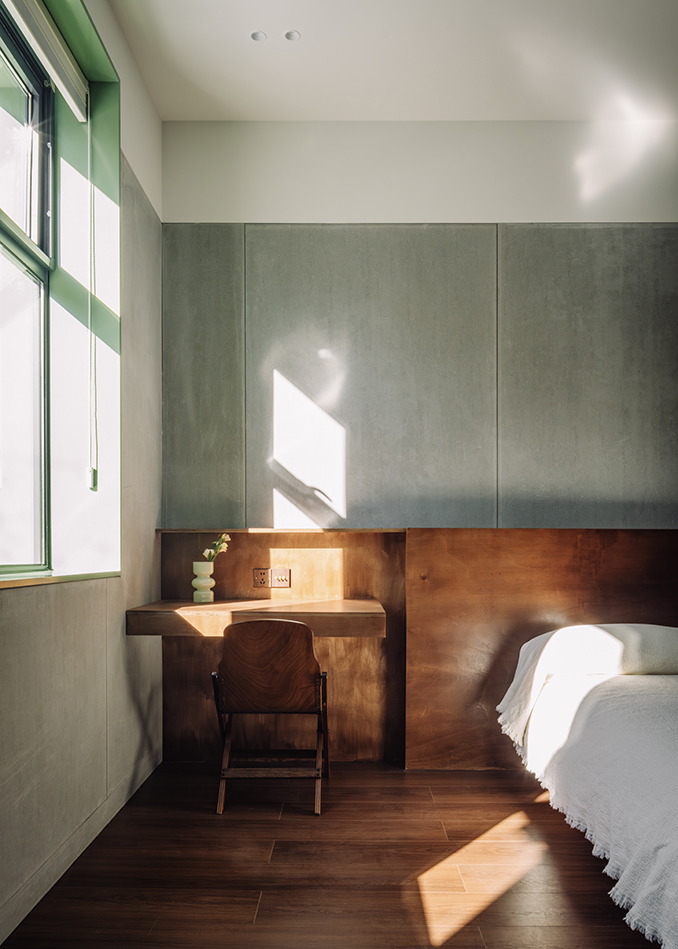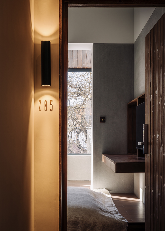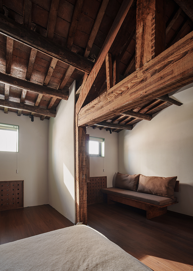 객실은 시멘트 패널을 그대로 마감재로 사용해 생활 공간을 단순화했으며, 일부 지붕 구조는 노출 상태로 남겼다. 3층은 어수선한 기존 구조를 가리지 않고 매듭 위치와 공용 공간 기능에 맞춰 재구성했다. 가구는 합판 가구 조합으로 기능을 충족하면서 전체적 단순한 분위기에 어울렸다.