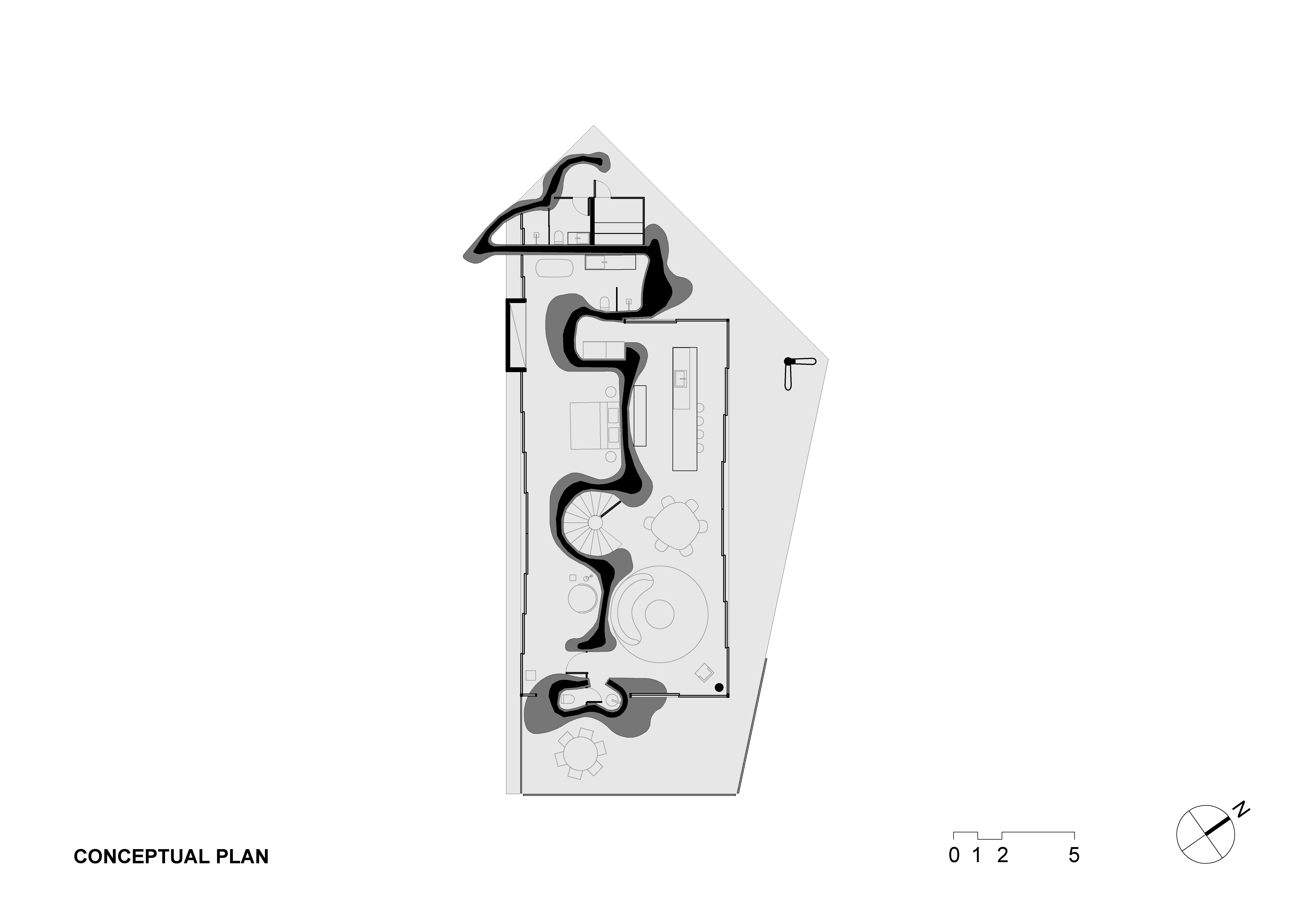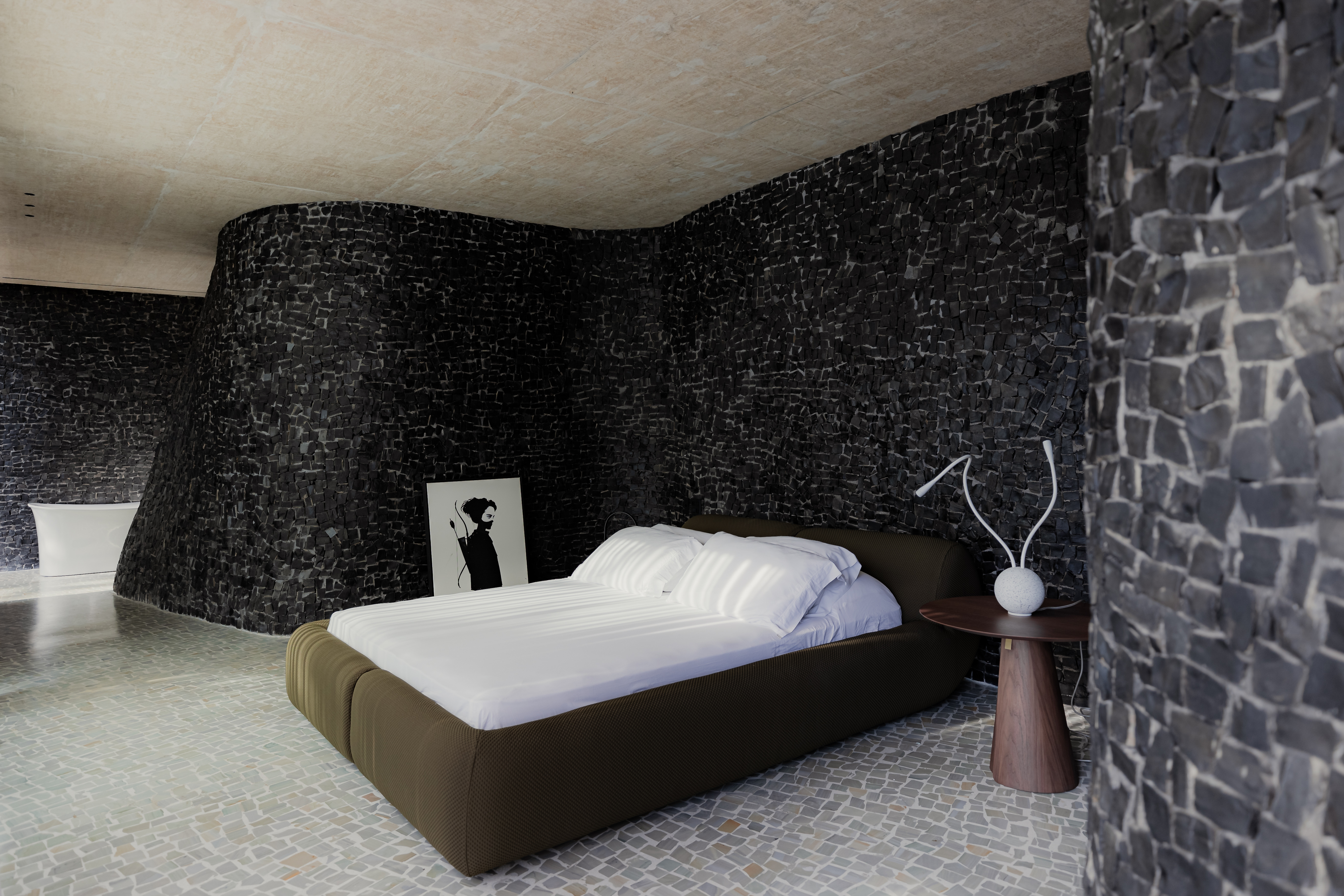 재료 또한 풍경과의 연결을 강화한다. 검은 돌로 마감한 곡선 벽은 흰 돌 바닥과 대비를 이룬다. 집은 피난처이자 삶의 경험이며, 돌이라는 단일한 재료가 본질을 규정한다.