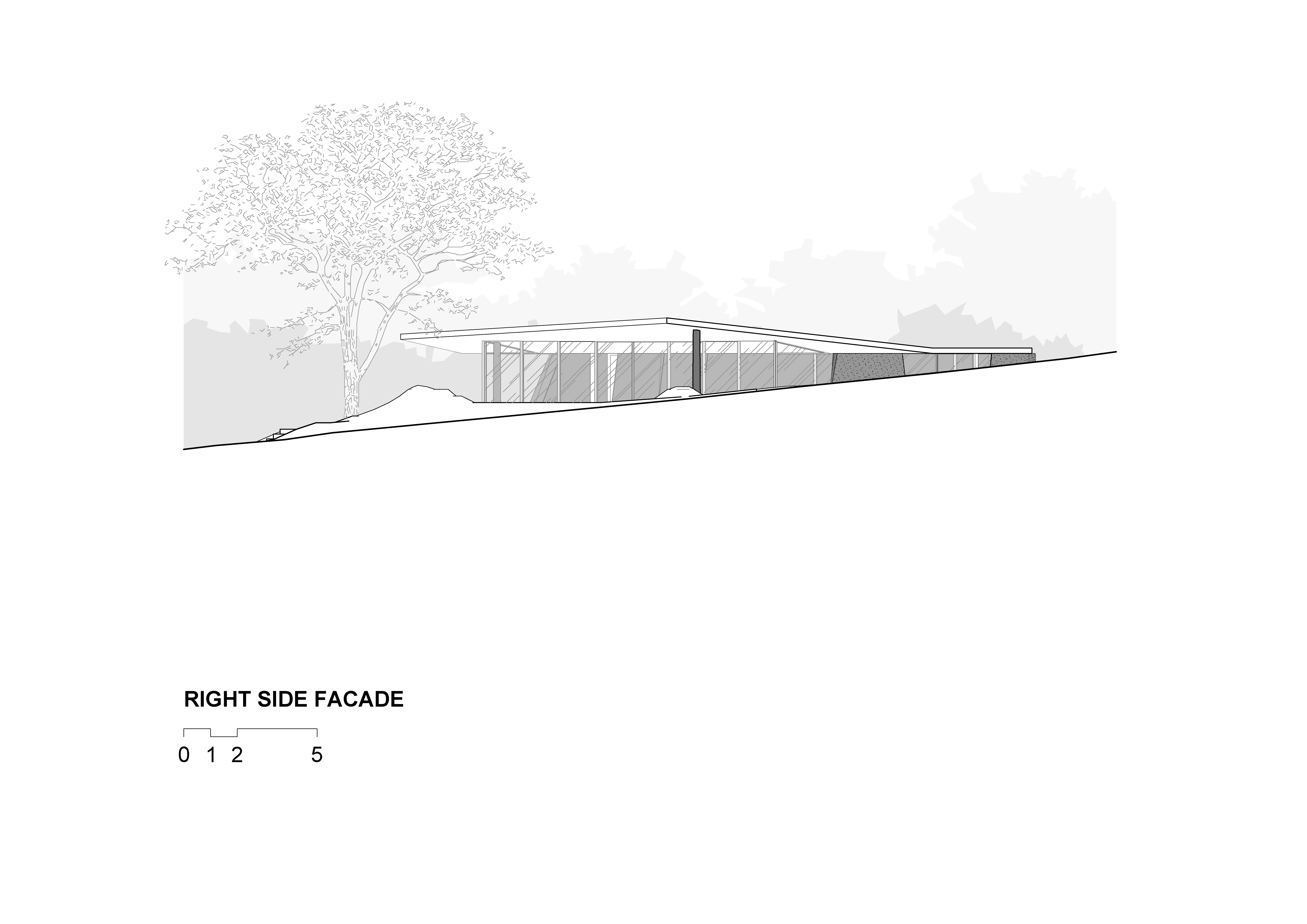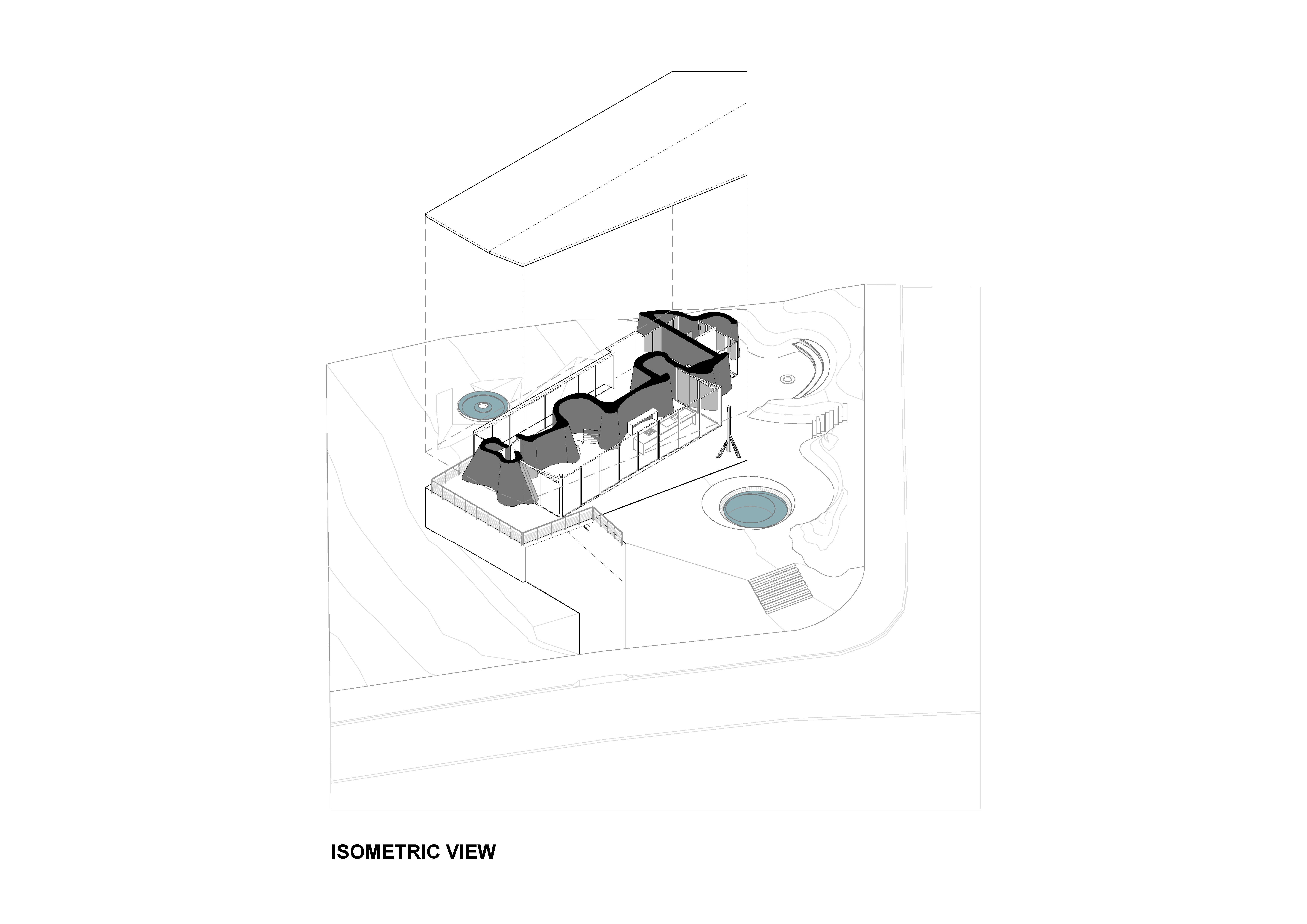 건축에서 시는 선으로 그려진다. 그 선이 자유로울수록 깊이가 더해진다. 이곳에서 그 시적 선은 곡선의 벽으로 구현되었다. 곡선 벽은 집을 두 세계로 나눈다. 한쪽은 환영의 공간으로, 밝고, 음악과 움직임으로 가득하며 산맥을 향해 열려 있다. 다른 한쪽은 은둔의 공간으로, 고요하고 내향적이며 숲의 그늘에 잠겨 휴식과 독서에 바쳐진다.