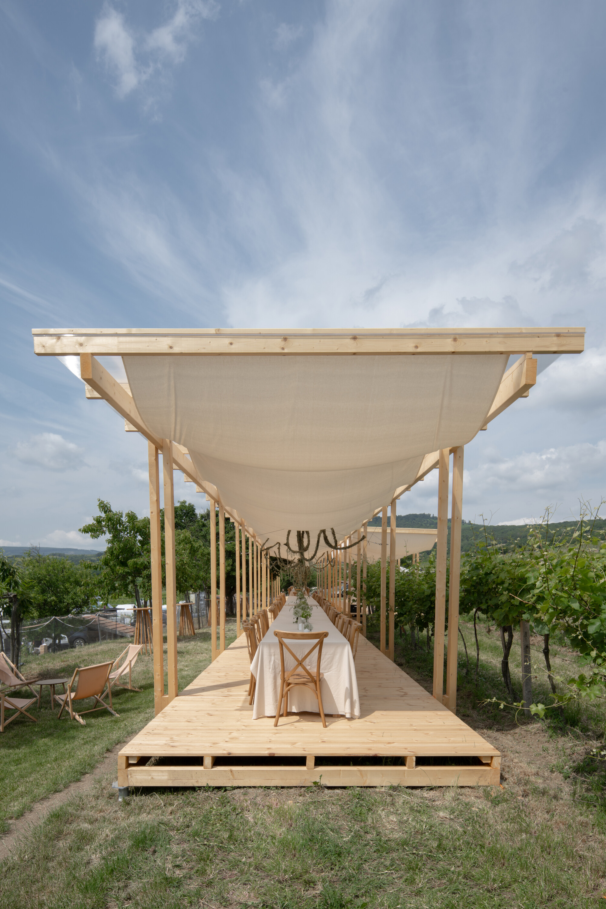 약 150명을 수용할 수 있는 휴식 및 미식 공간으로, 목재 모듈과 반복적 리듬으로 포도밭의 열을 닮은 구성을 취한다. 천장에는 조명과 함께 커튼형 패브릭이 설치되어 목가적인 분위기를 연출하며, 좌우 대칭 구성을 통해 중앙부에 조리 지원 공간을 배치했다.