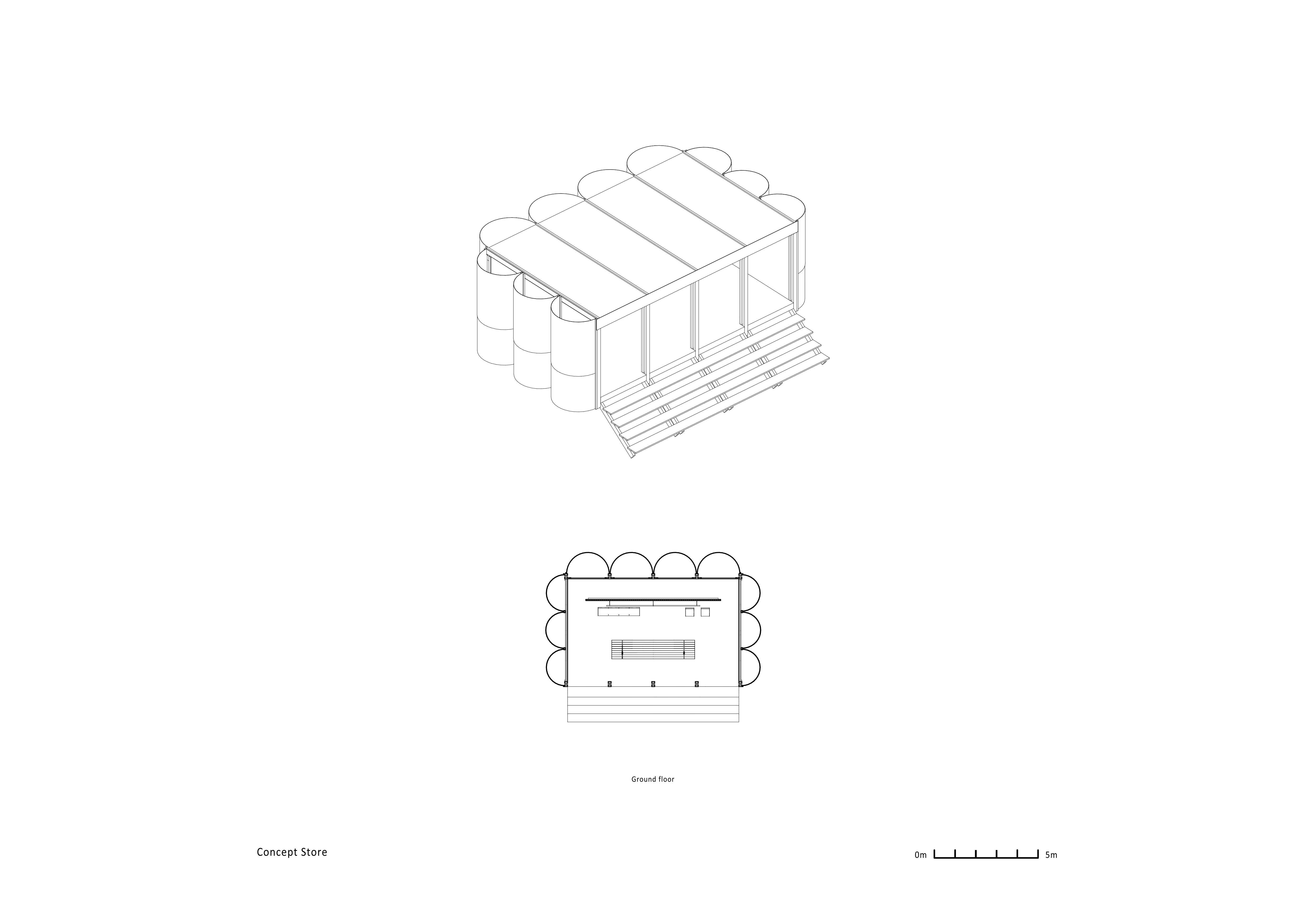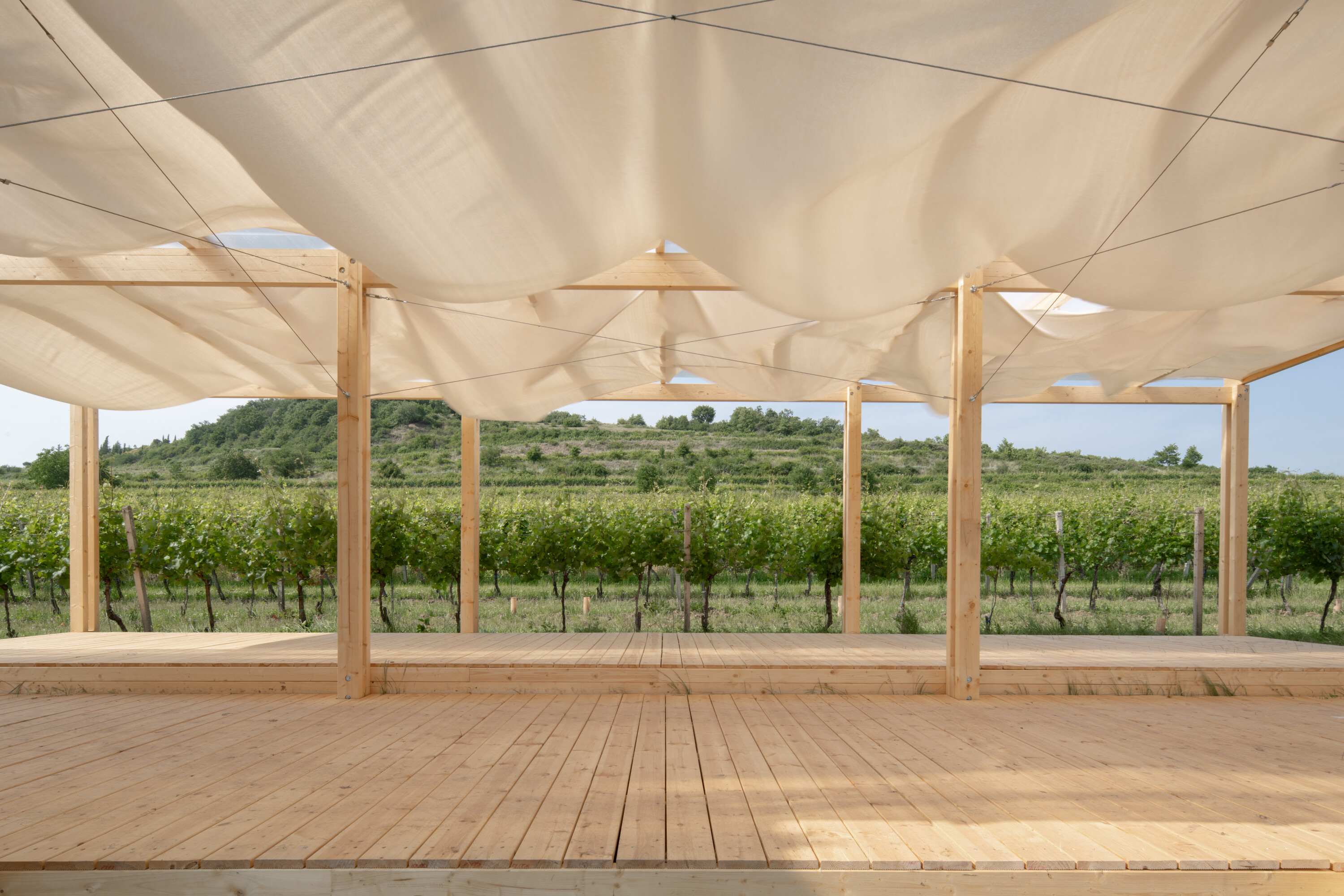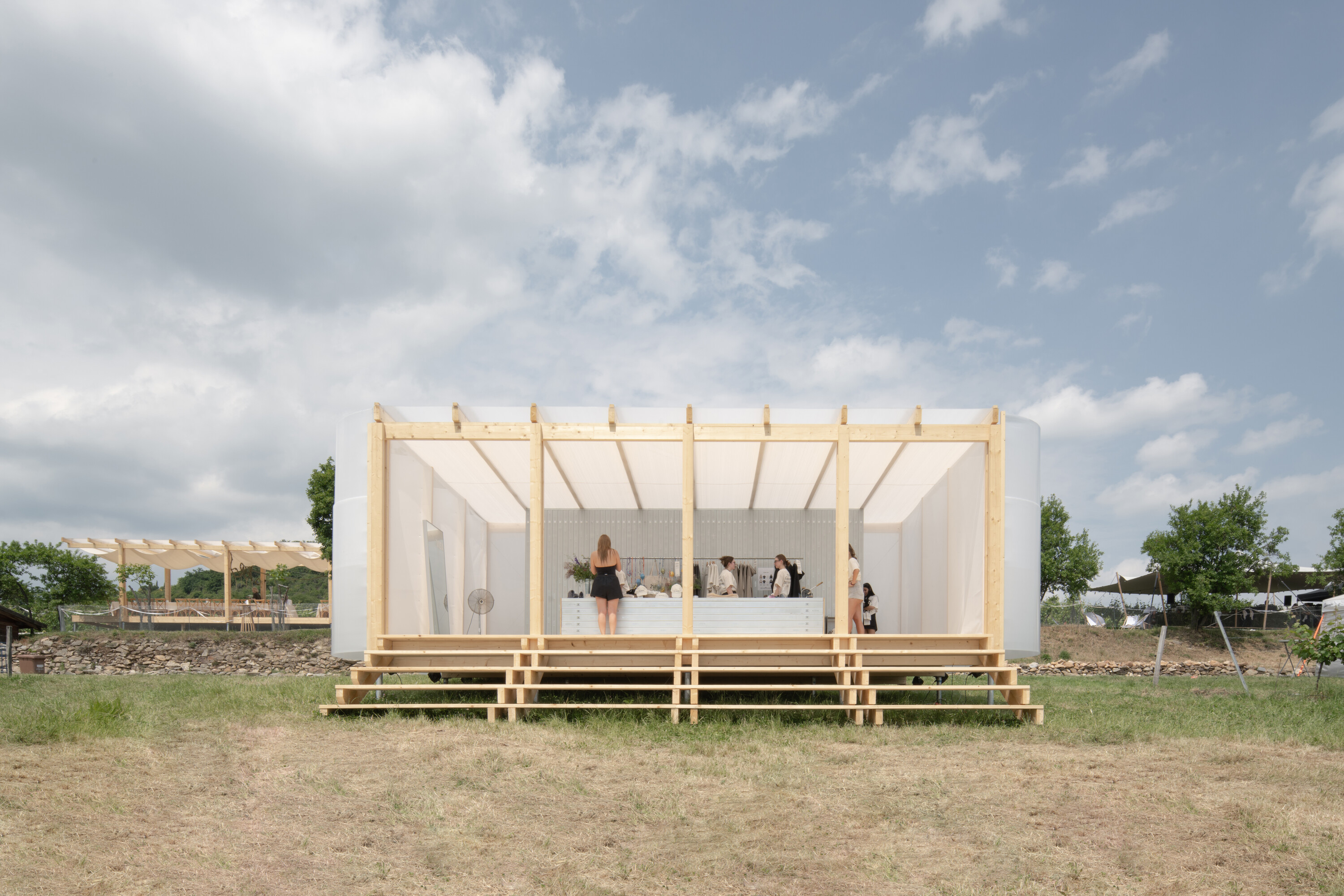 입구와 라운지 존 사이 경계 역할을 하는 임시 판매 공간이다. 북쪽은 폐쇄적 파사드, 남쪽은 계단식 좌석을 포함한 개방형 구조로 되어 있어 포도밭과 연결된다. 구부러진 오팔 폴리카보네이트 외피는 저녁 시간에 부드러운 확산광을 만들어내며, 저녁 풍경 속에서 강조되는 오브제로 기능한다.