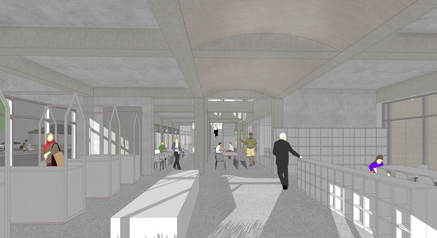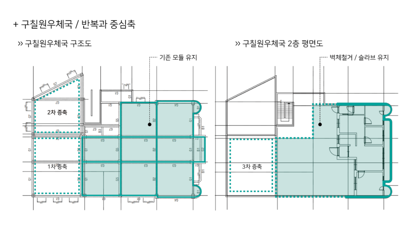 여러 차례 증축된 공간들을 철거하여 구칠원우체국의 원형이 가진 기본 모듈의 사이즈와 공간의 방향성을 확인한다. 수직방향의 5m 모듈을 증축되는 공간의 기본 모듈로 설정하여 일관성을 유지한다. 중앙의 출입구에서 시작되어 수평의 방향성을 가지는 3m 모듈은 그 방향성을 유지하여 수평/수직 증축되는 부분과 기존 건축물을 통합하는 중심축이 될 수 있도록 한다. 이를 통해 구칠원우체국 건축물의 구조적 특성을 유지하며 확장하여 형식적 연속성을 지속시키며 기존건축물과 증축되는 공간이 자연스럽게 통합되는 구조계획을 제안한다.