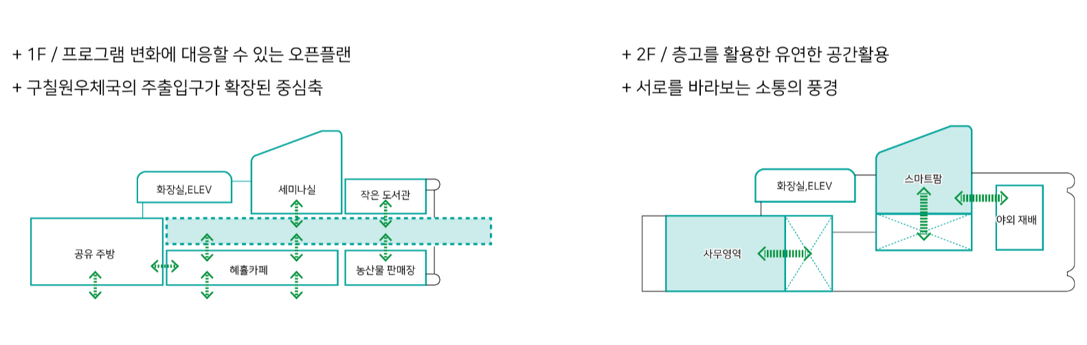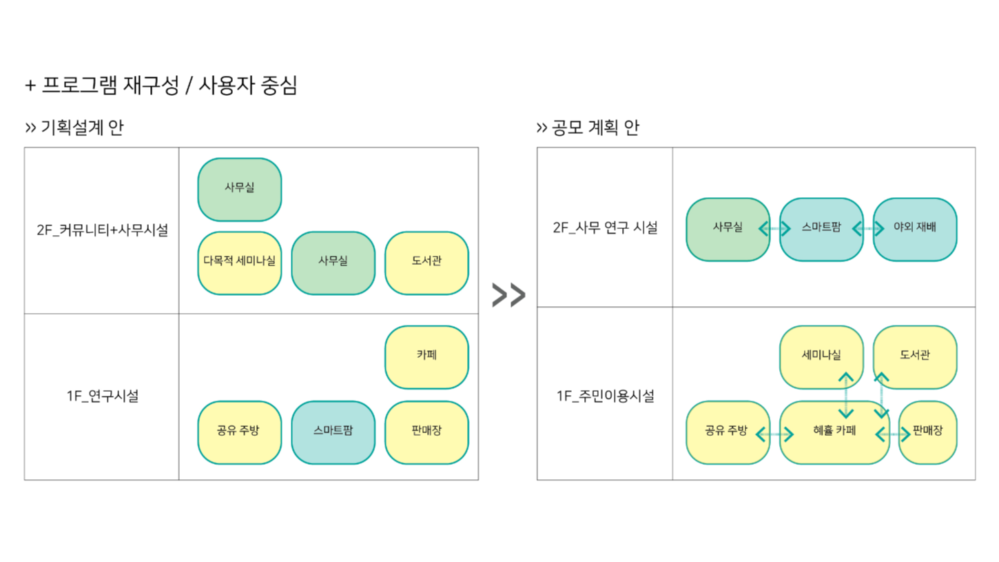 혜휼당의 시설은 연구개발영역(혜휼카페, 농산물판매장, 스마트팜, 공유부엌), 커뮤니티영역(다목적 세미나실, 작은도서관), 사무영역(도시재생 현장지원센터, 마을관리사회적 협동조합 사무실)으로 구분이 되어있으며 각 영역 내에서 연계와 개방성을 확보하도록 되어있다. 하지만 실제 공간을 사용자를 중심으로 구분을 하면 주민 이용공간과 (혜휼카페, 농산물판매장, 공유부엌, 다목적세미나실, 작은도서관), 사무/연구영역(스마트팜/경북대 연구팀, 도시재생 현장지원센터, 마을관리사회적 협동조합 사무실)으로 재분류 되어야 한다. 주민 이용공간을 접근이 용이한 1층으로 배치하여야 마을의 큰 행사시 공간의 확장성과 공유부엌과의 활용성을 극대화할 수 있다.