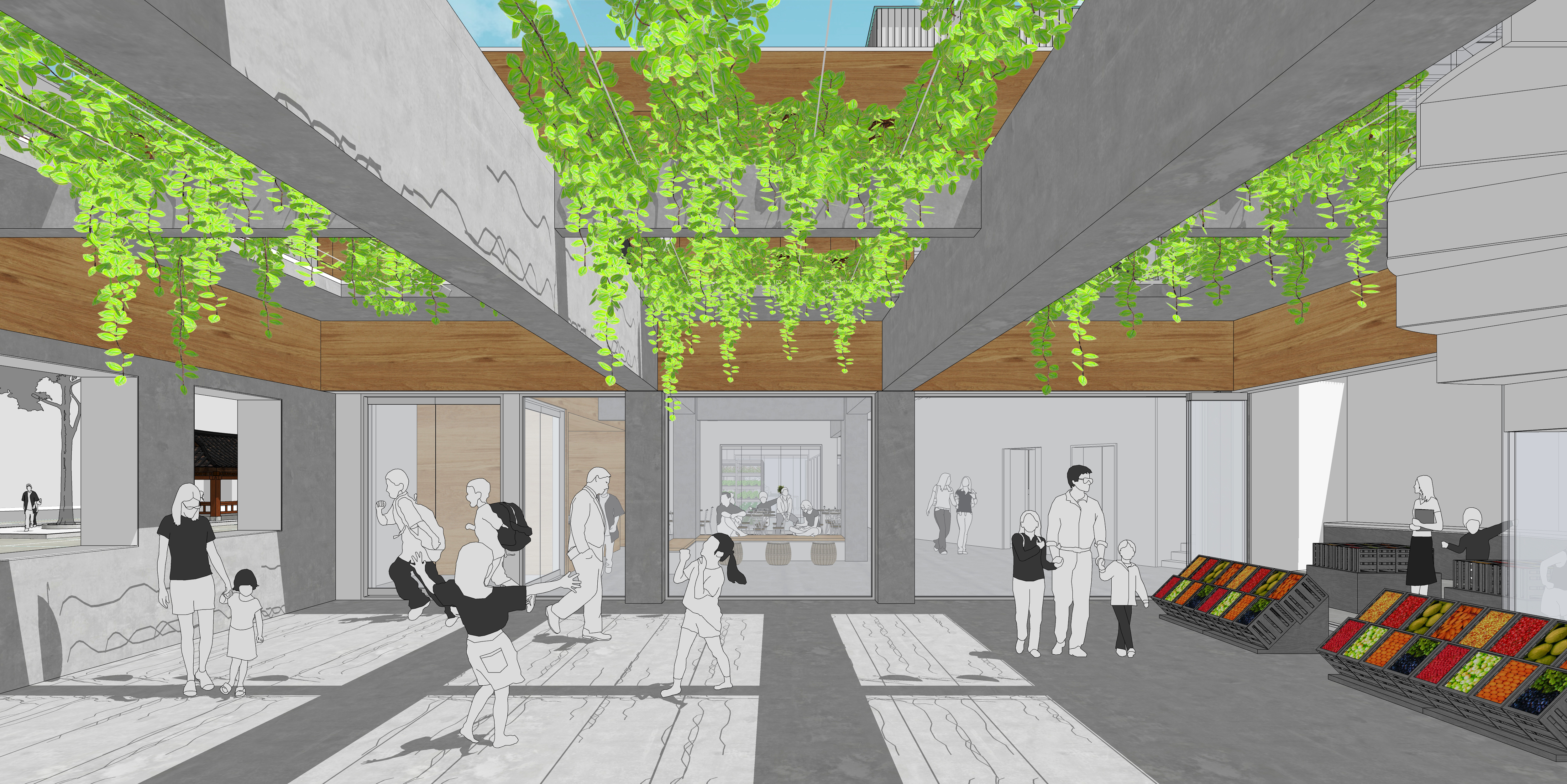 건물 배치는 기존의 주차장으로 인해 형성된 물리적 단절을 해소하고, 마을의 흐름 속에 자연스럽게 스며드는 구조로 계획되었다. 차량 동선을 배제한 진입 마당은 보행 중심의 공간으로 설계되어, 행사 시 혜휼마당과 유기적으로 확장된다. 내부에는 도서관, 세미나실, 카페, 공유주방, 도시재생 지원센터, 스마트팜 연구소 등이 배치되어, 다양한 프로그램을 통해 주민의 생활과 학습, 교류를 지원한다. 이때 주민들의 주 공간이 될 도서관이나 카페가 혜휼마당과 긴밀한 관계를 지니는 반면 세미나마당은 세미나실을 그 사이에 두고 적절히 거리를 유지한다. 재료는 기존 건물의 타일 입면을 최대한 유지하면서, 친환경 메가판넬과 목재 루버 등을 사용해 과거와 현재 재료가 적절히 어울리도록 하였다. 또한 단열 성능 강화, 자연 환기 및 채광, 고효율 설비 시스템을 적용하여 에너지 절약형 건축을 실현하였다.