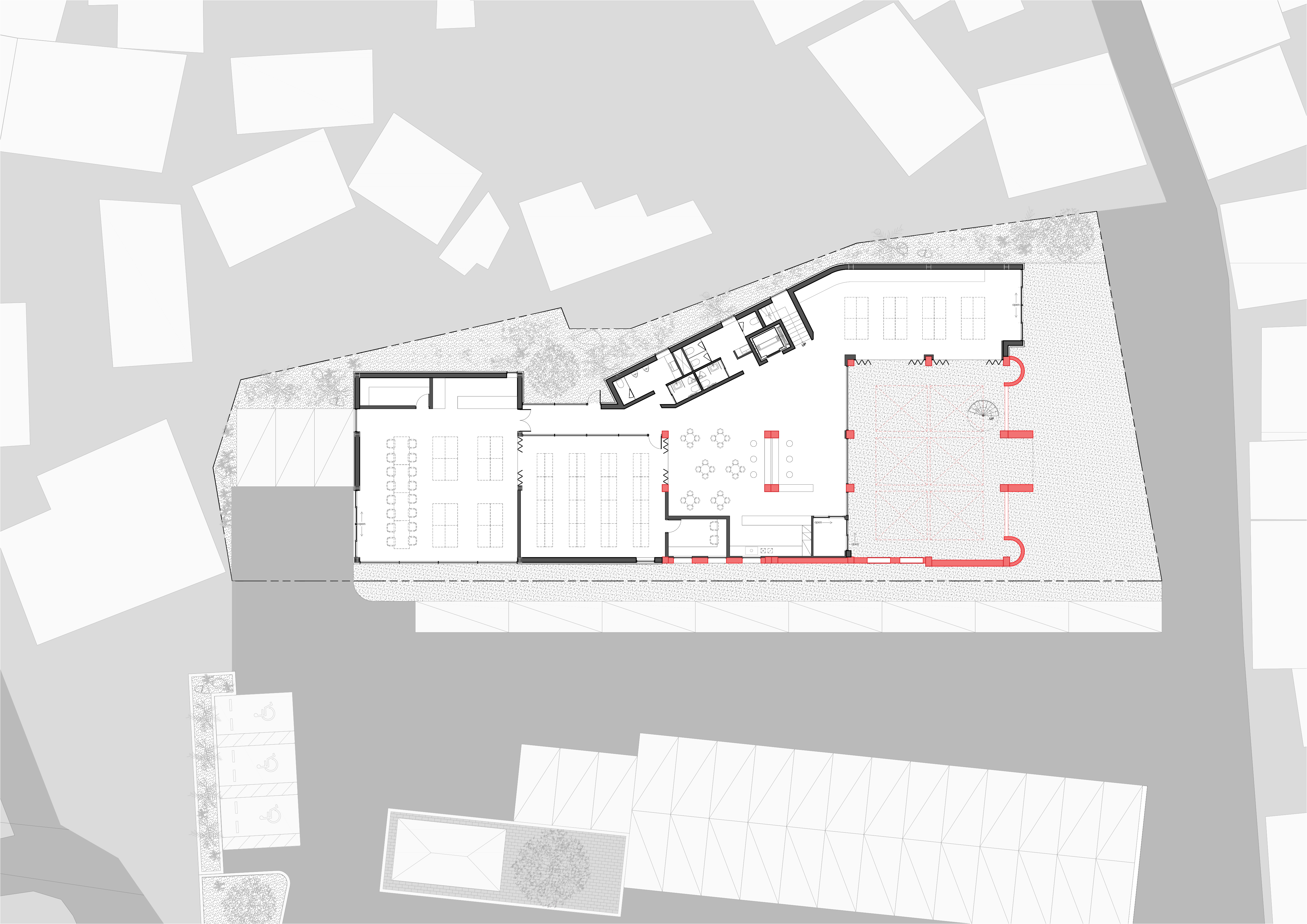 본 설계안은 지역의 오래된 우체국 건물을 리노베이션하여, 주민에게 열린 공공 커뮤니티 공간으로 재탄생하는 프로젝트이다. 기존 건축물의 구조와 입면을 존치하면서도 일부 슬라브를 제거해 실내를 외부화하여, 진입 시 가장 먼저 마주하는 ‘혜휼 마당’을 조성하였다. 이 공간은 과거와 현재, 기억과 기능이 교차하는 전이 영역으로, 누구나 365일 이용할 수 있는 열린 광장 역할을 한다.