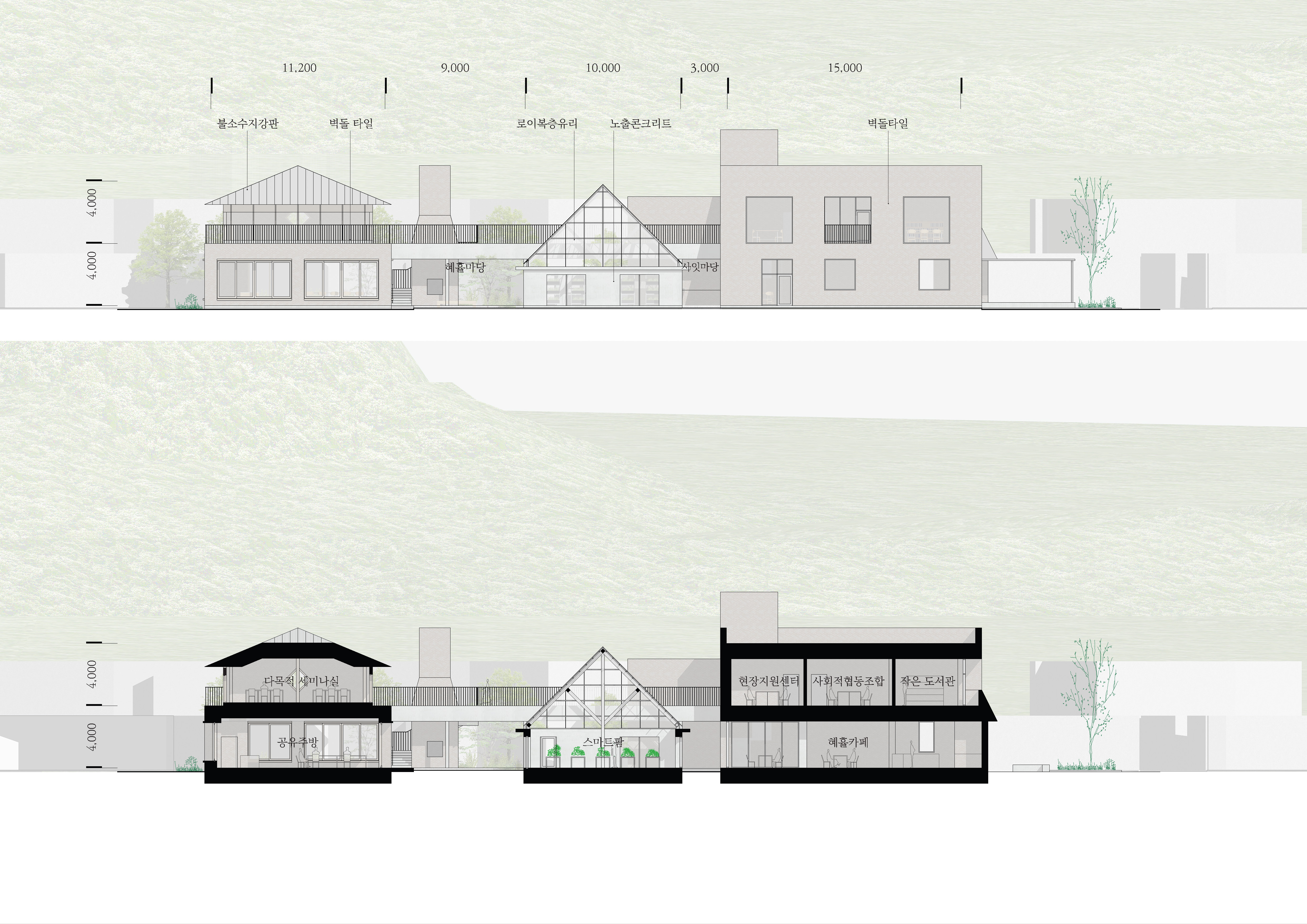 철골 구조로 증축된 기존 건물 2층에는 지원센터, 협동조합, 작은도서관이 배치되며, 활발한 행사를 수용하는 다목적 세미나실과 충분히 이격되어 정적인 환경을 조성한다. 기존 형식을 계승한 작은도서관의 발코니는 독서 중 휴식하는 학생과 주민의 모습을 전면에 드러내며, 가로에 생동감을 더한다. 목구조와 경사지붕으로 구성된 다목적 세미나실은 삼면이 반외부 공간으로 둘러싸인 마을 정자와 같은 성격을 지닌다. 동선 분리를 통해 시간대별 유연한 사용이 가능하며, 1층 공유주방과 연계된 덤웨이터를 통해 음식 나눔 행사도 가능하도록 계획되었다.