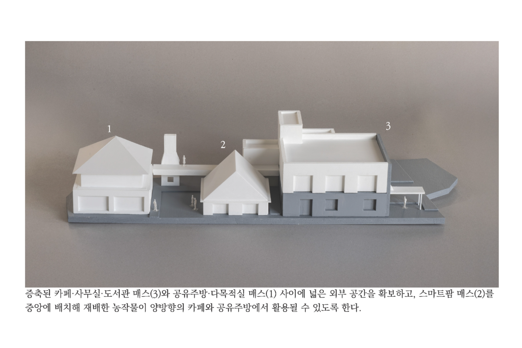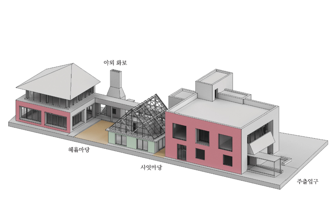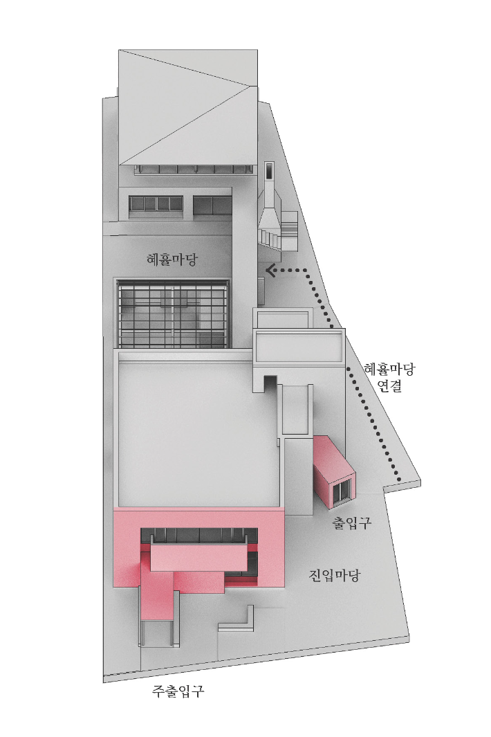 전면 동측의 진입마당은 대각선으로 배치된 코어 출입구와, 혜휼마당 및 외부 브릿지를 향한 골목길로 연결된다. 각 프로그램은 이러한 다공성 있는 구성을 통해 다양한 방문자 동선과 사용의 자율성을 확보한다. 혜휼원과 면한 서측 정면에서 세 개의 매스는 수평적으로 펼쳐지며, 정면 파사드 뒤로 길게 뻗어나가는 남측 풍경과 대비된다. 각 마당은 혜휼원과 혜휼당을 연결하고, 지상층에서는 공유주방·스마트팜·카페가 ‘먹거리’라는 개념 아래 유기적으로 연계된다. 증축된 카페·사무실·도서관 매스와 공유주방·다목적실 매스 사이에 넓은 외부 공간을 확보하고, 스마트팜 매스를 중앙에 배치해 재배한 농작물이 양방향의 카페와 공유주방에서 활용될 수 있도록 한다. 이러한 프로그램 매스의 집합적 구성은 건축물의 스케일을 분절하며 마을과 조화를 이루는 풍경을 형성한다.