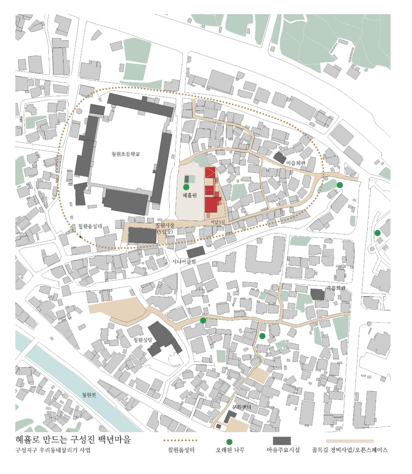 칠원읍성터 중심에 자리한 혜휼당은 고즈넉한 마을 풍경에 자연스럽게 스며들며, 옛 우체국 건물이 지닌 시간의 결을 품은 열린 장소다. 느슨하게 배열된 매스들은 자율적인 질서를 이루고, 서남3길의 정면성과 더불어 혜율원을 향한 열린 경관을 만들어낸다. 각 매스와 대지 경계 사이에 조성된 외부 공간과 골목길은 다양한 방향에서 접근하는 주민을 환대하며, 내부 프로그램의 유연한 확잘을 수용한다.