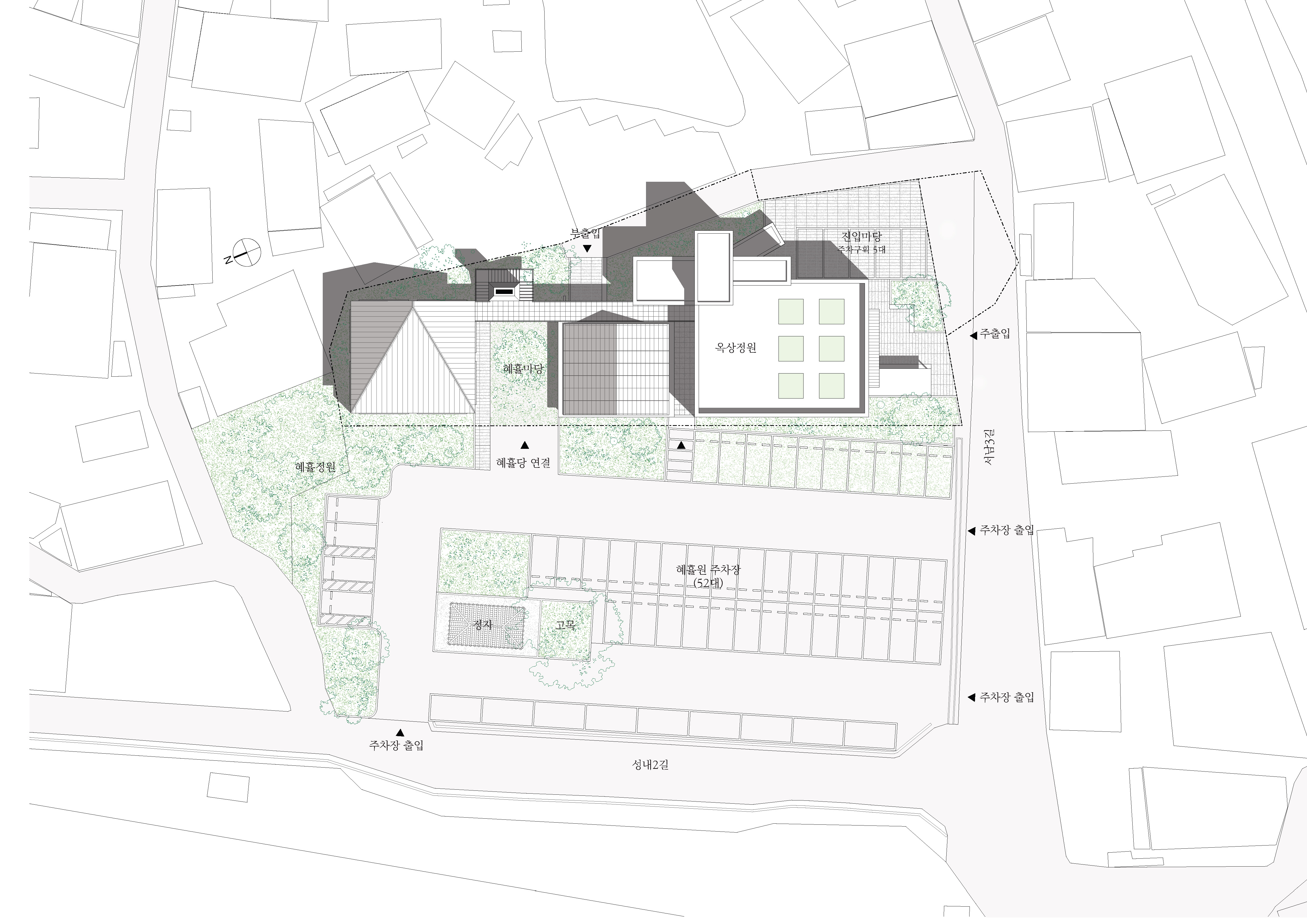 평소에는 주차장으로, 마을 행사 시에는 광장으로 활용되는 혜휼원이 혜휼당과 유기적 관계를 맺을 수 있도록 대안을 제시한다. 느슨하게 계획되어 있던 기존 주차 구획을 합리적으로 재구성하고, 혜휼당과 단절되어 있던 결절부에는 녹지와 오픈 스페이스를 연결하여 공간의 연속성을 회복한다. 주차 구획에 둘러싸여 섬처럼 고립되어 있던 정자와 고목의 녹지는 혜휼당을 향해 확장 연계된다. 대안적 혜휼원은 이러한 구성 안에서도 기존보다 증가한 주차대수를 확보한다.