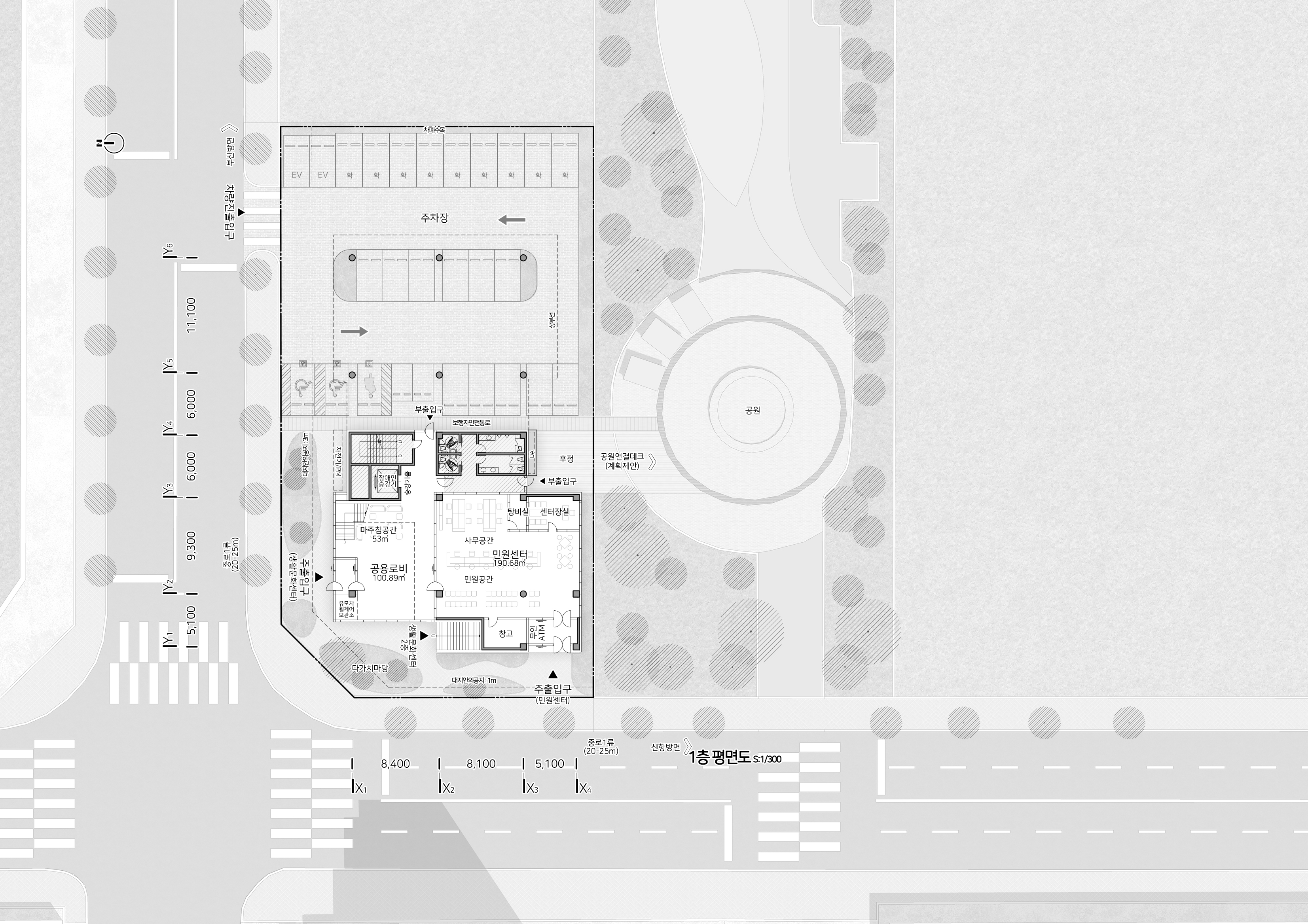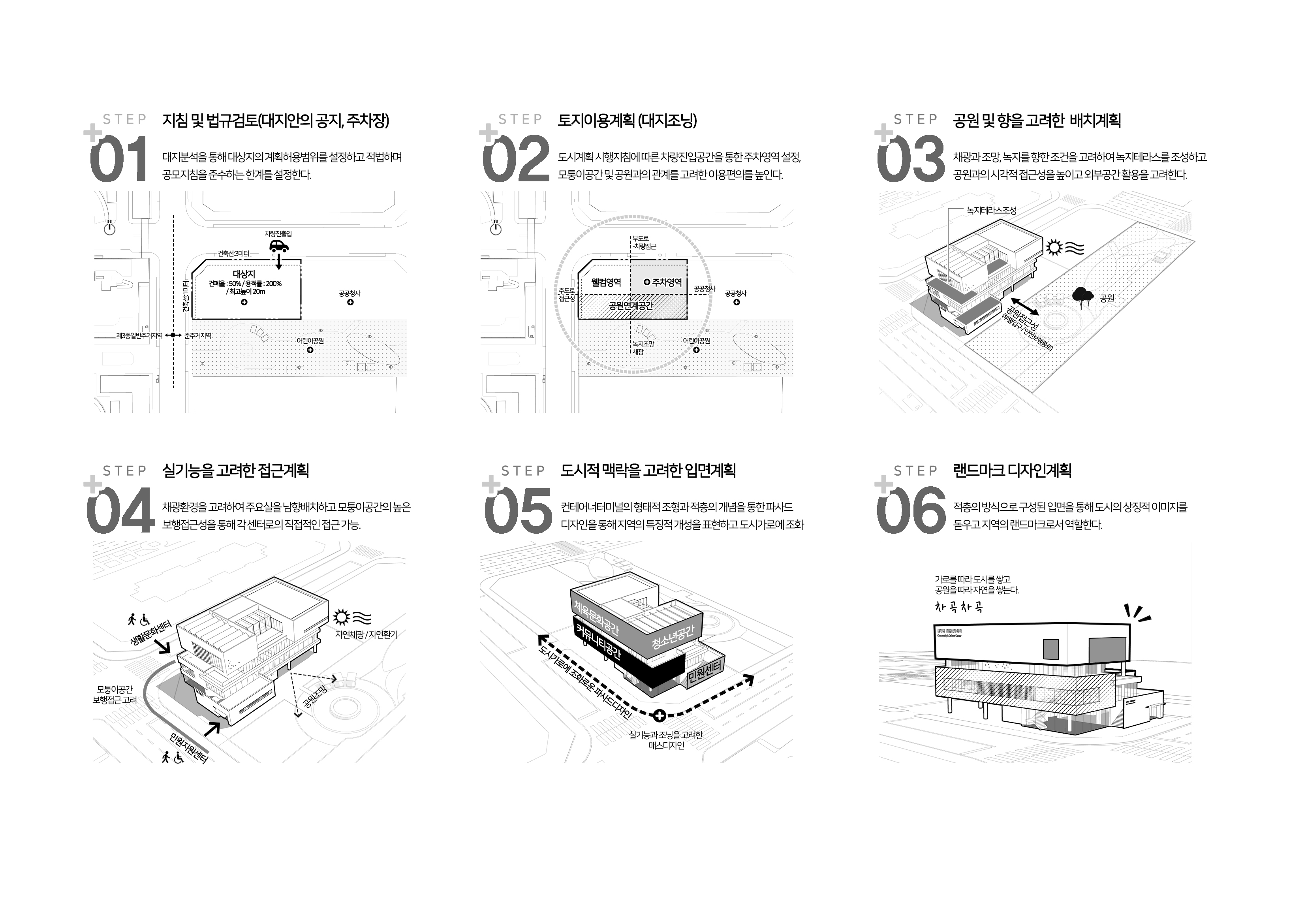 대지는 부산과 진해의 경계, 신항만과 컨테이너터미널의 웅장한 배후도시를 품고 있다. 이 지역은 컨테이너 운송차량이 가로의 절반을 채우며, 거대한 수송선과 크레인이 조각하는 도시의 미학이 장엄하다. 다정다감한 휴먼스케일이 아닌, 무역을 중심으로 한 국가의 전초기지로서 굳건한 스케일과 숭고한 기운이 자연스럽다. 그런 가운데 공원과 마주한 사거리 모퉁이의 대지는 이 무게와 움직임을 품고, 인본주의적 감성을 자극하는 동시에 지역적 맥락을 존중하는 조형 언어로 표현되어야 한다.도시는 타협과 균형 속에 미래를 향한 조용한 춤을 추듯, 이 대지는 인접한 공원과 친근하게 속삭이는 면모를 지니면서도, 동시에 도시가로에 적응하며 힘차게 응답하는 두 얼굴을 가진다. 차가운 산업의 거대한 숨결과 따뜻한 인간의 이야기 사이, 현재와 미래가 만나는 이 교차점에서 대지는 생명을 얻어 도시의 심장으로 뛰기 시작한다.