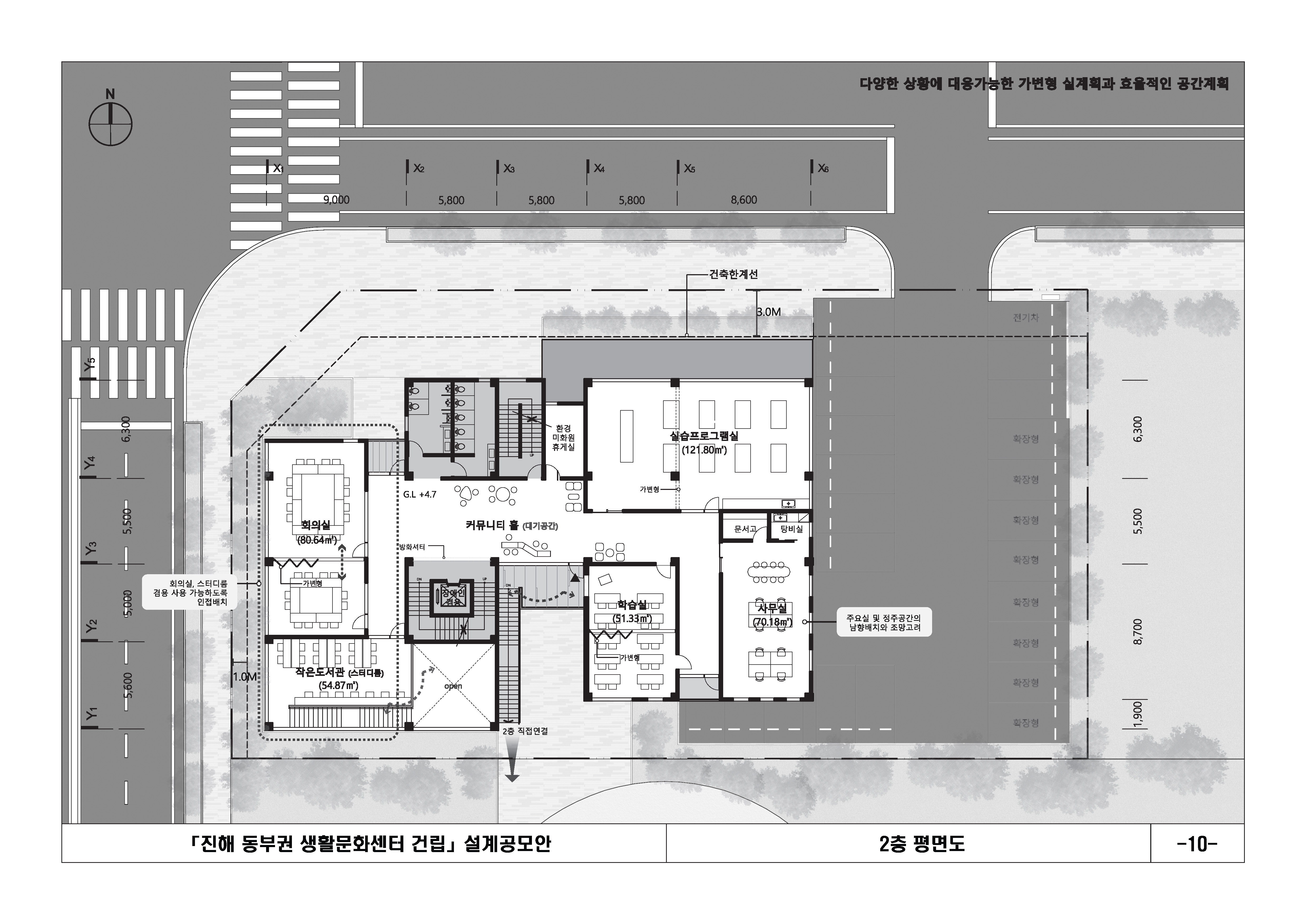 진해 동부권 지역의 부족한 생활문화시설 조성사업으로 지역 커뮤니티를 활성화시키며 주민 간의 소통과 자발적인 활동을 통해 지역을 더 활성화시키고자 생활문화센터를 건립하고자 합니다. 대상지의 특성과 여건, 건립시설의 목적과 활용성을 고려하여 계획하였습니다. 어린공원과 인접해 있는 대상지로 어린이공원에 자연스레 연결되는 열린 마당과 시설의 편의를 위한 동선계획을 중점으로 계획하였고 청소년 등 다양한 계층과 다양한 프로그램을 수용할 수 있는 가변적 공간 구성을 통해 누구나 쉽고 편리하게 이용할 수 있는 생활문화센터를 계획하였습니다. 각층별 영역은 독립적이나 통합적으로 사용되도록 하며 개별적으로 충분한 휴게공간을 구성하여 내외부공간의 다양함과 열린 공간을 구성했습니다.