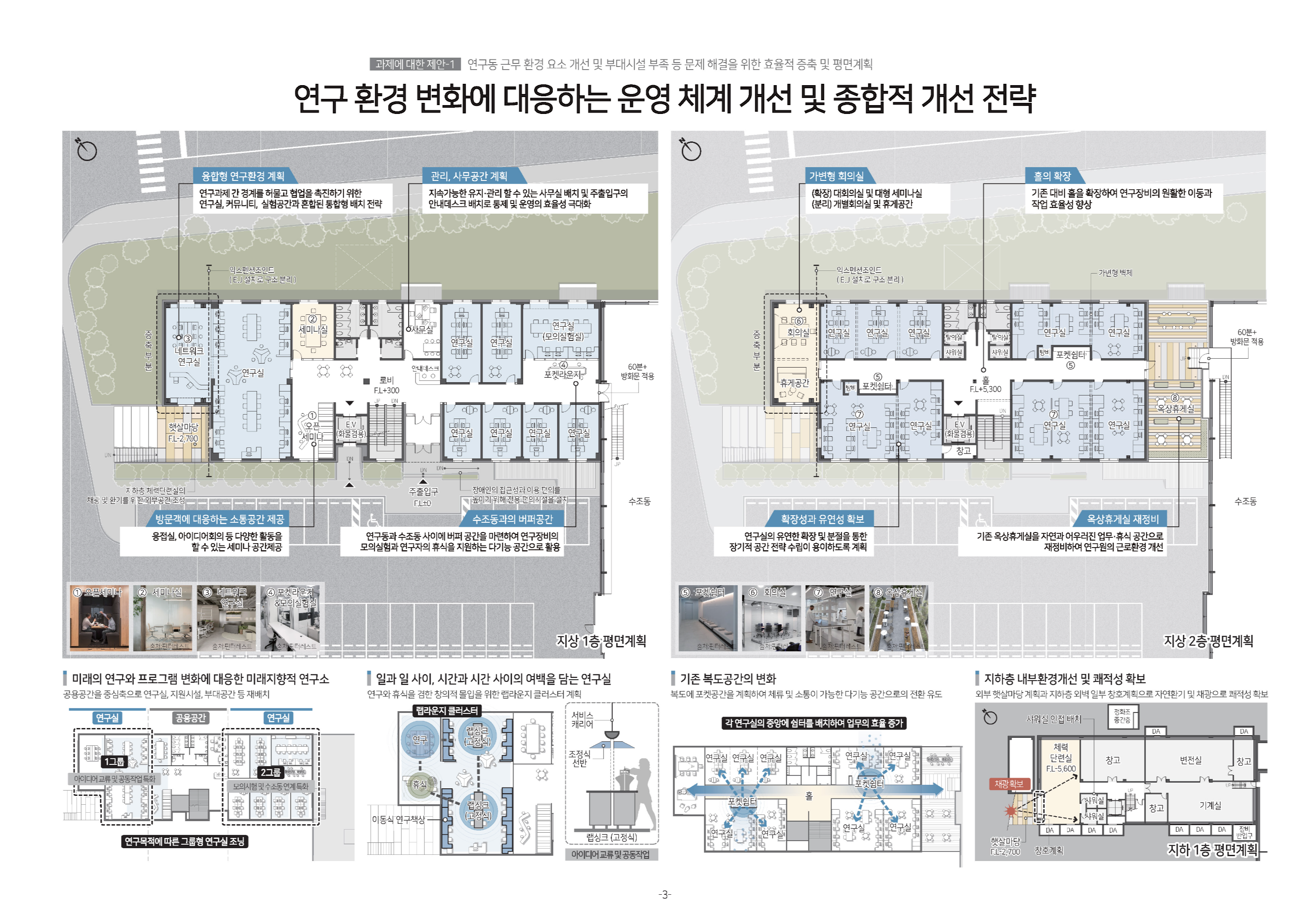 -핵심 공용공간을 중심축으로 삼고, 연구실·지원시설·부대공간을 재배치하여 미래의 다양한 연구 목적과 프로그램 변화에 대응 가능한 미래지향적 연구소로 전환