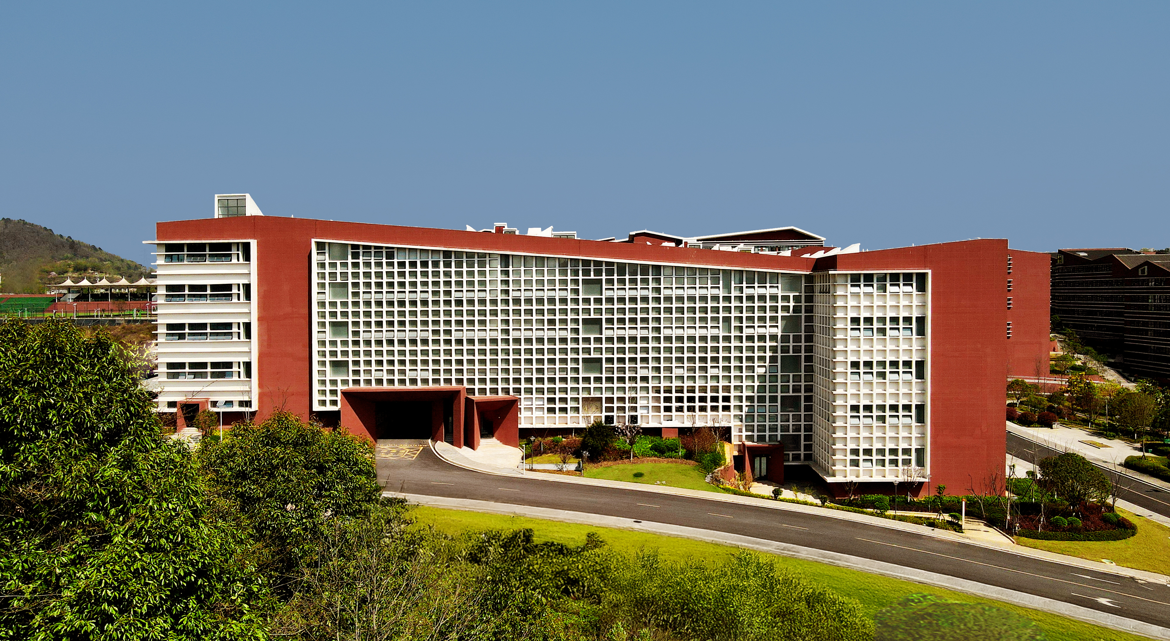 파사드는 현지에서 조달 가능한 붉은 모래가 혼합된 합성 마감재로 처리되었다. 이는 비용 효율적일 뿐 아니라 지역의 풍화된 적색암을 상징하며, 건물이 대지에서 솟아난 듯한 힘 있는 인상을 주었다. 동서 입면은 지형의 윤곽과 고저차를 반영해 주변 산세의 흐름을 연상시켰다.