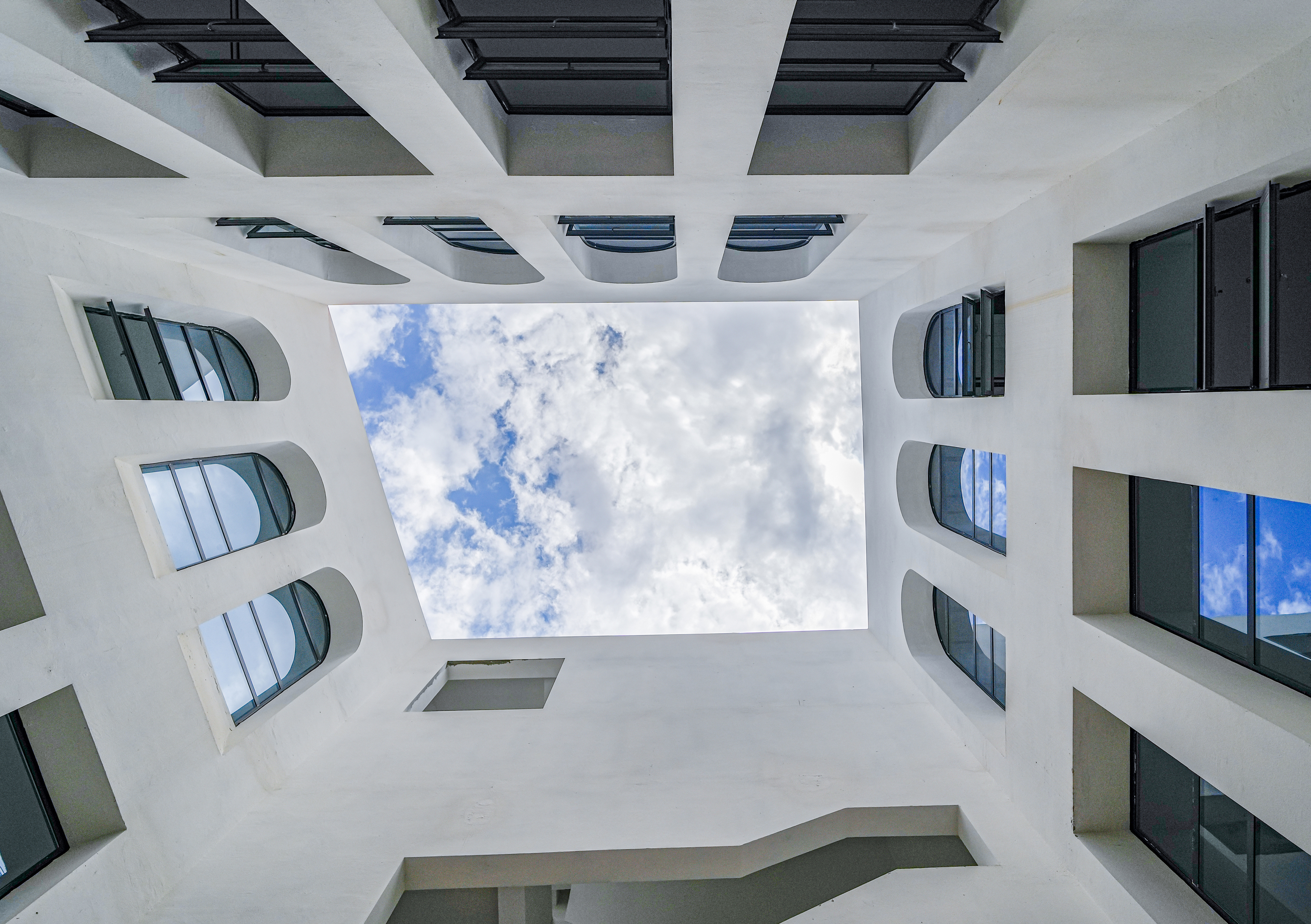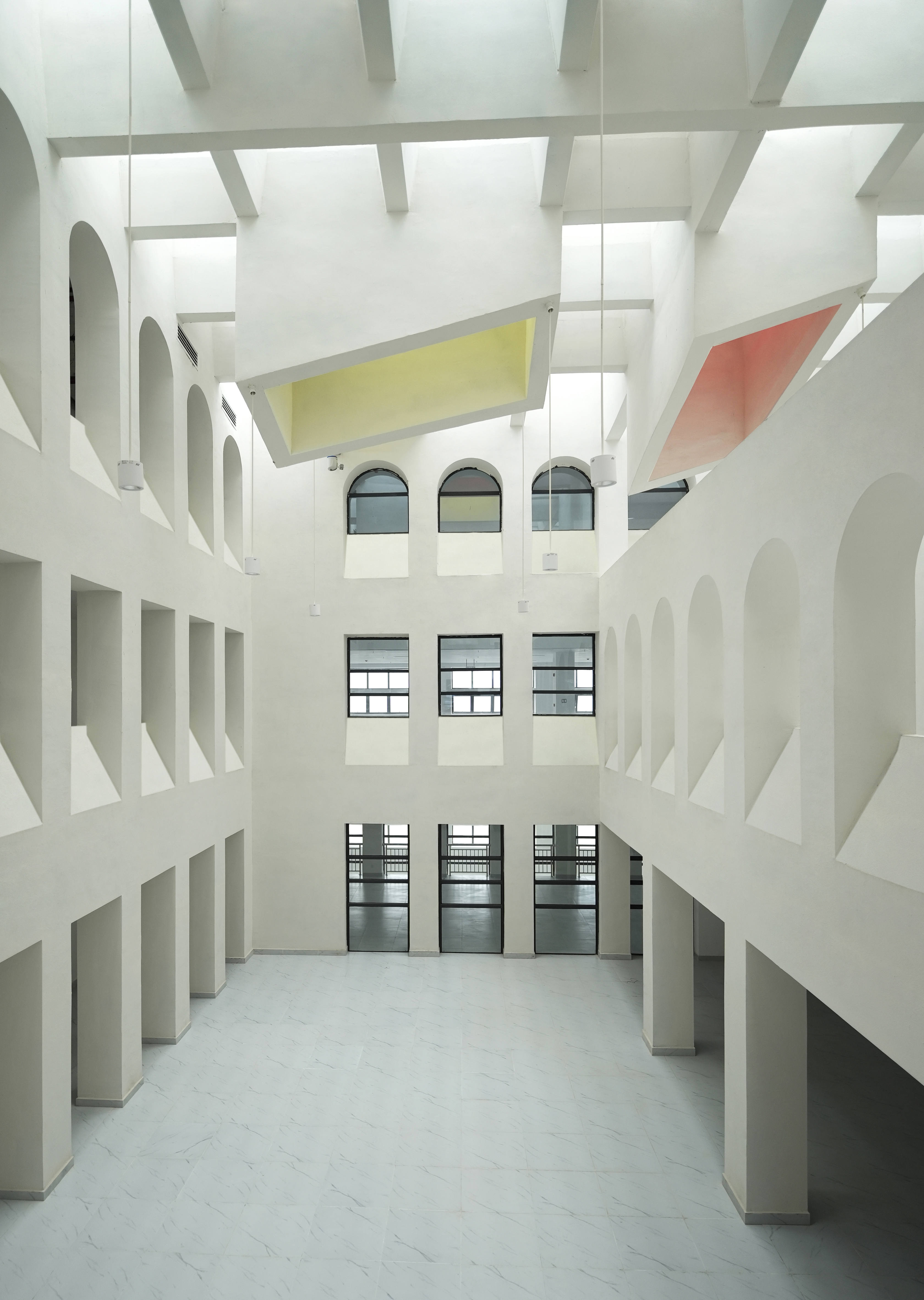 내부는 밝고 성당 같은 공간감을 지녔으며, 격자 시스템과 다수의 중정이 배치되었다. 이는 산간 취락에서 발견되는 ‘중정 속 중정’ 전통을 현대적으로 해석한 것으로, 중국 고전 학원의 배치 또한 환기시켰다. 이러한 공간적 비움은 자연채광과 환기를 보장했으며, 학습과 문화적 연속성을 북돋는 전통의 시적 힘을 재현했다.