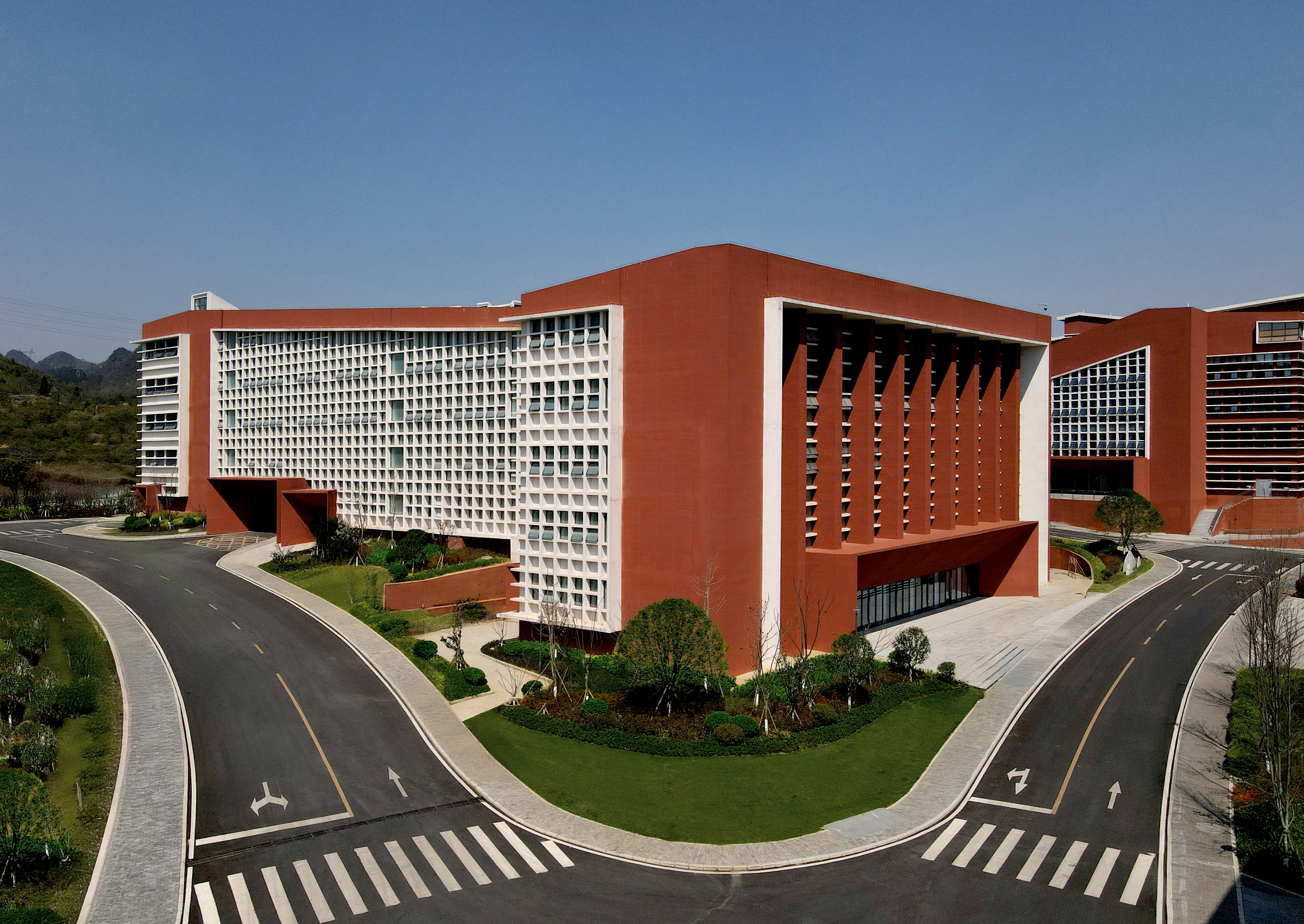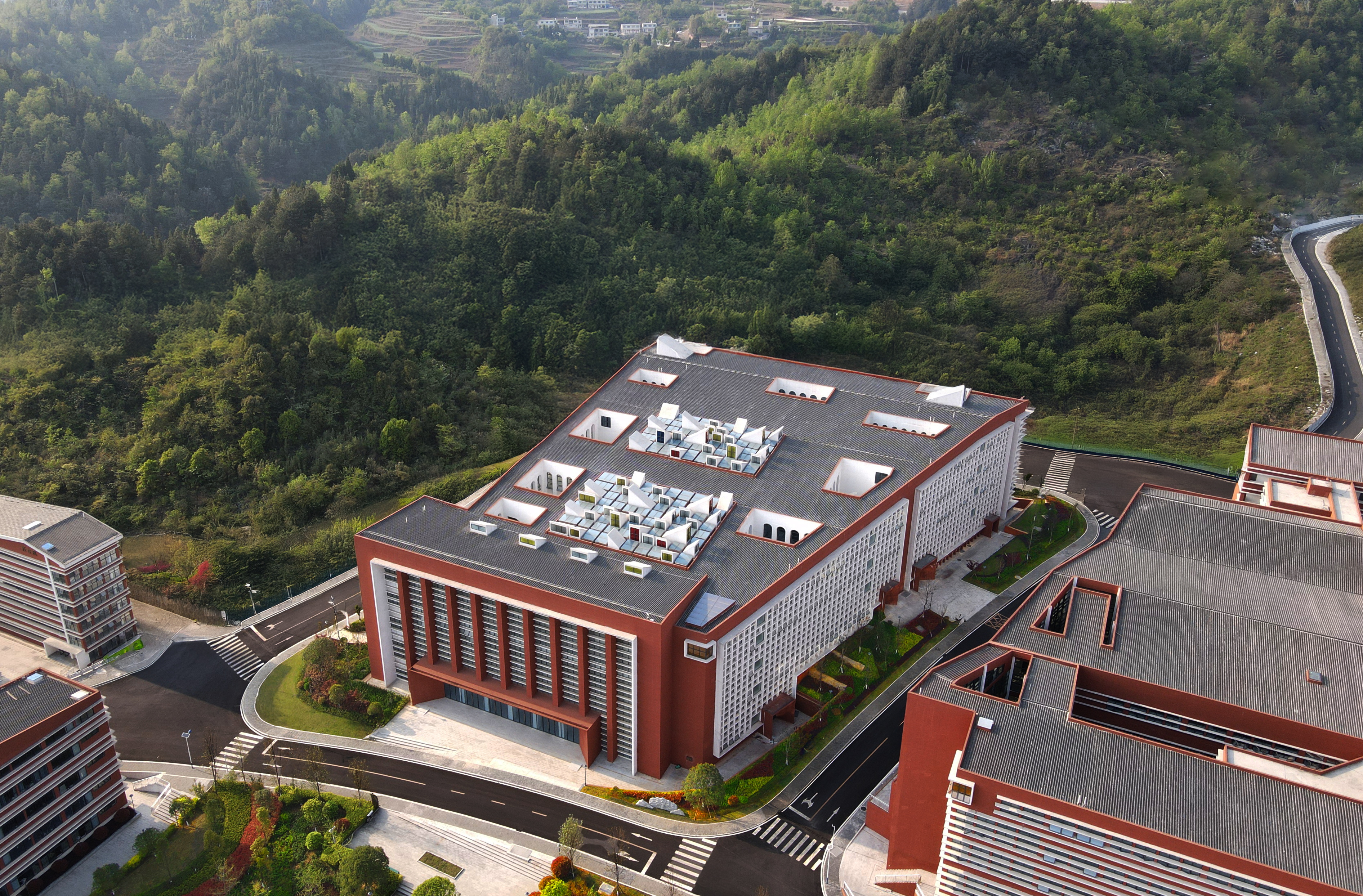 내부는 밝고 성당 같은 공간감을 지녔으며, 격자 시스템과 다수의 중정이 배치되었다. 이는 산간 취락에서 발견되는 ‘중정 속 중정’ 전통을 현대적으로 해석한 것으로, 중국 고전 학원의 배치 또한 환기시켰다. 이러한 공간적 비움은 자연채광과 환기를 보장했으며, 학습과 문화적 연속성을 북돋는 전통의 시적 힘을 재현했다.
