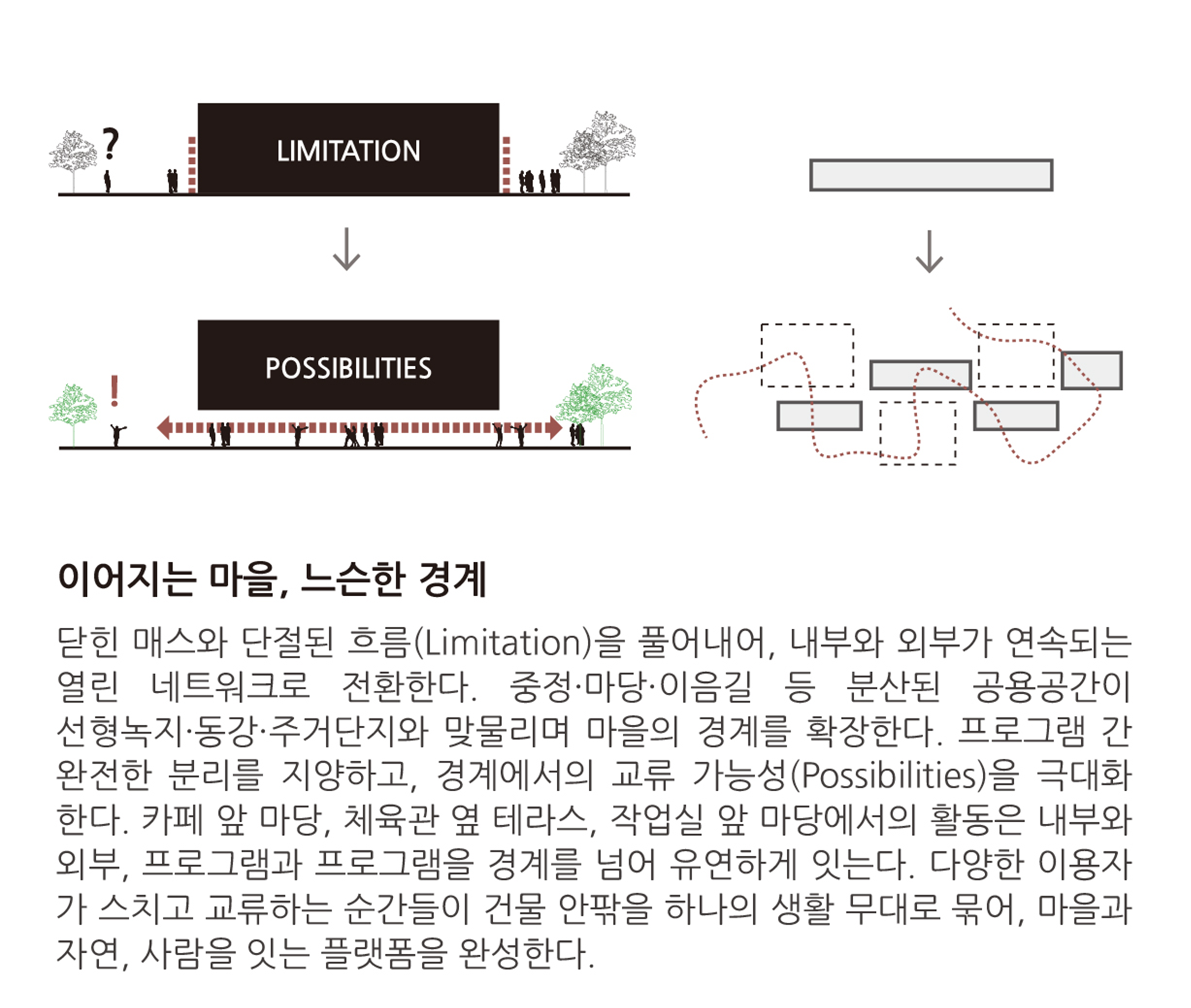 닫힌 매스와 단절된 흐름(Limitation)을 풀어내어, 내부와 외부가 연속되는 열린 네트워크로 전환한다. 중정 · 마당 · 이음길 등 분산된 공용공간이 선형녹지 · 동강 · 주거단지와 맞물리며 마을의 경계를 확장한다. 프로그램 간 완전한 분리를 지양하고, 경계에서의 교류 가능성(Possibilities)을 극대화한다. 카페 앞 마당, 체육관 옆 테라스, 작업실 앞 마당에서의 활동은 내부와 외부, 프로그램과 프로그램을 경계를 넘어 유연하게 잇는다. 다양한 이용자가 스치고 교류하는 순간들이 건물 안팎을 하나의 생활 무대로 묶어, 마을과 자연, 사람을 잇는 플랫폼을 완성한다.