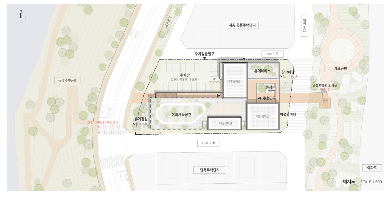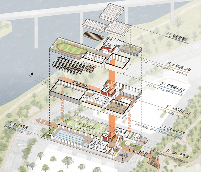 북카페, 파티룸, 작업실, 빨래방 등 생활밀착형 시설은 수영장과 체육관, 외부마당과 정원, 녹지의 축과 맞물려 계절과 시간에 따라 변화하는 다층적 외부공간을 만든다. 이러한 공간들은 마을 일상 속 다양한 속도와 리듬을 담아내며, 축제와 휴식, 운동과 교류가 동시에 이루어지는 입체적 생활 무대를 완성한다.