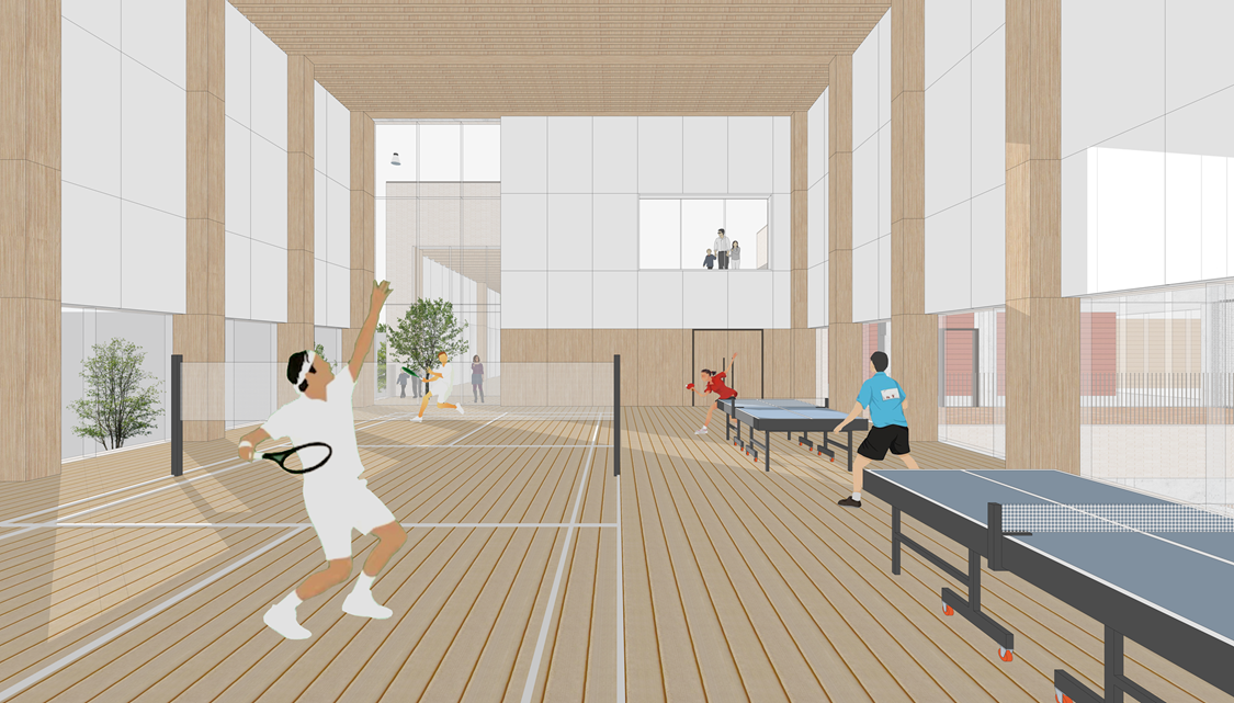 수평적 매스와 보행의 축은 건물 안팎을 관통하며 사람과 풍경을 자연스럽게 이어주고, 체육센터와 커뮤니티센터는 독립적으로 운영되면서도 공공공간과 중정을 통해 유연하게 연결된다.