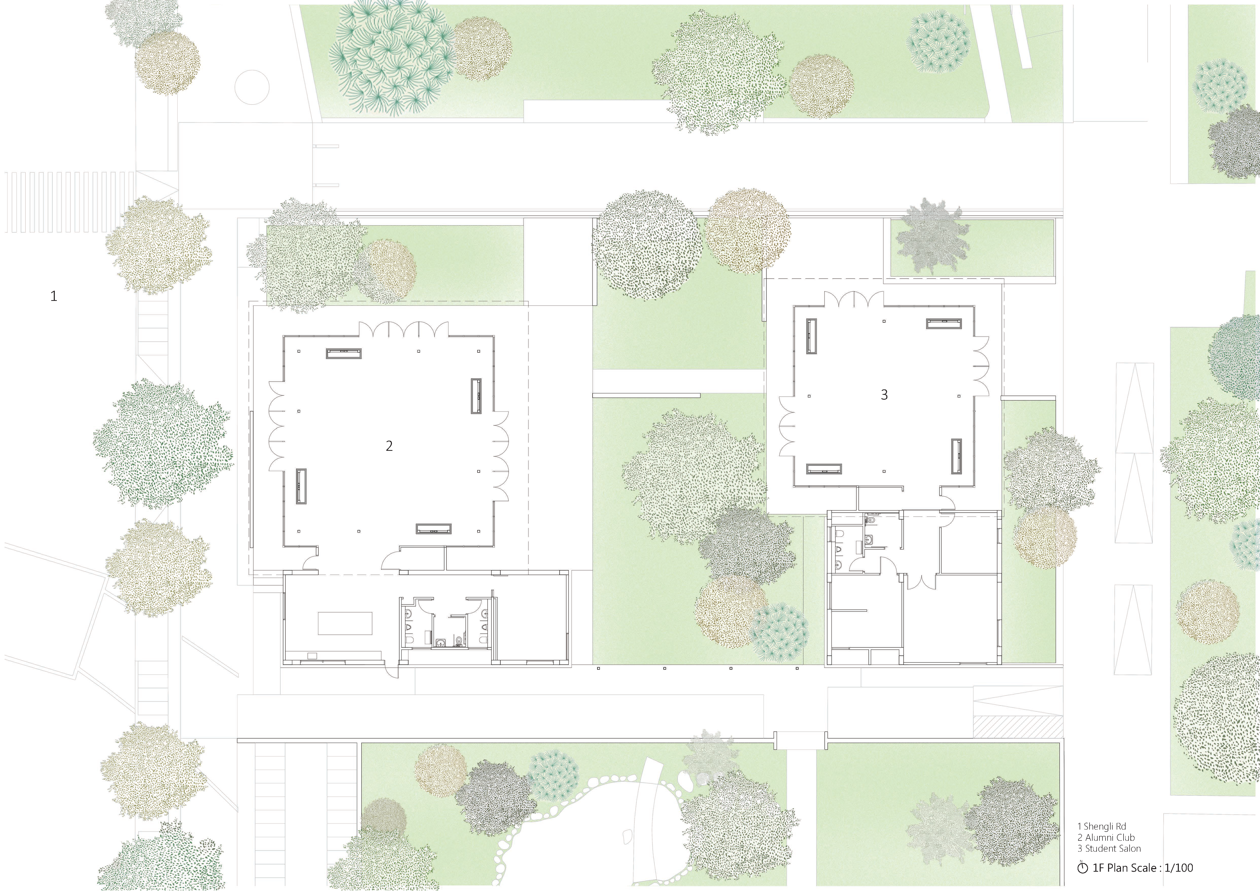 이 공간은 ‘동문 클럽’과 ‘학생 예술·문화 살롱’이라는 두 가지 주요 기능을 중심으로 구성된다. 설계는 철거된 유치원 건물 자리에 두 개의 크기가 다른 유리 박스를 배치함으로써 기존 수목을 최대한 보존하고, 실내 공간이 숲에 둘러싸인 듯한 인상을 준다. 지붕은 CLT(교차 적층 목재) 그리드 보 시스템을 얇은 철제 기둥으로 떠받치는 방식으로 구성되어, 시각적으로 탁 트인 수평 공간을 형성하고, 실내 어디서든 푸른 배경이 펼쳐진다.