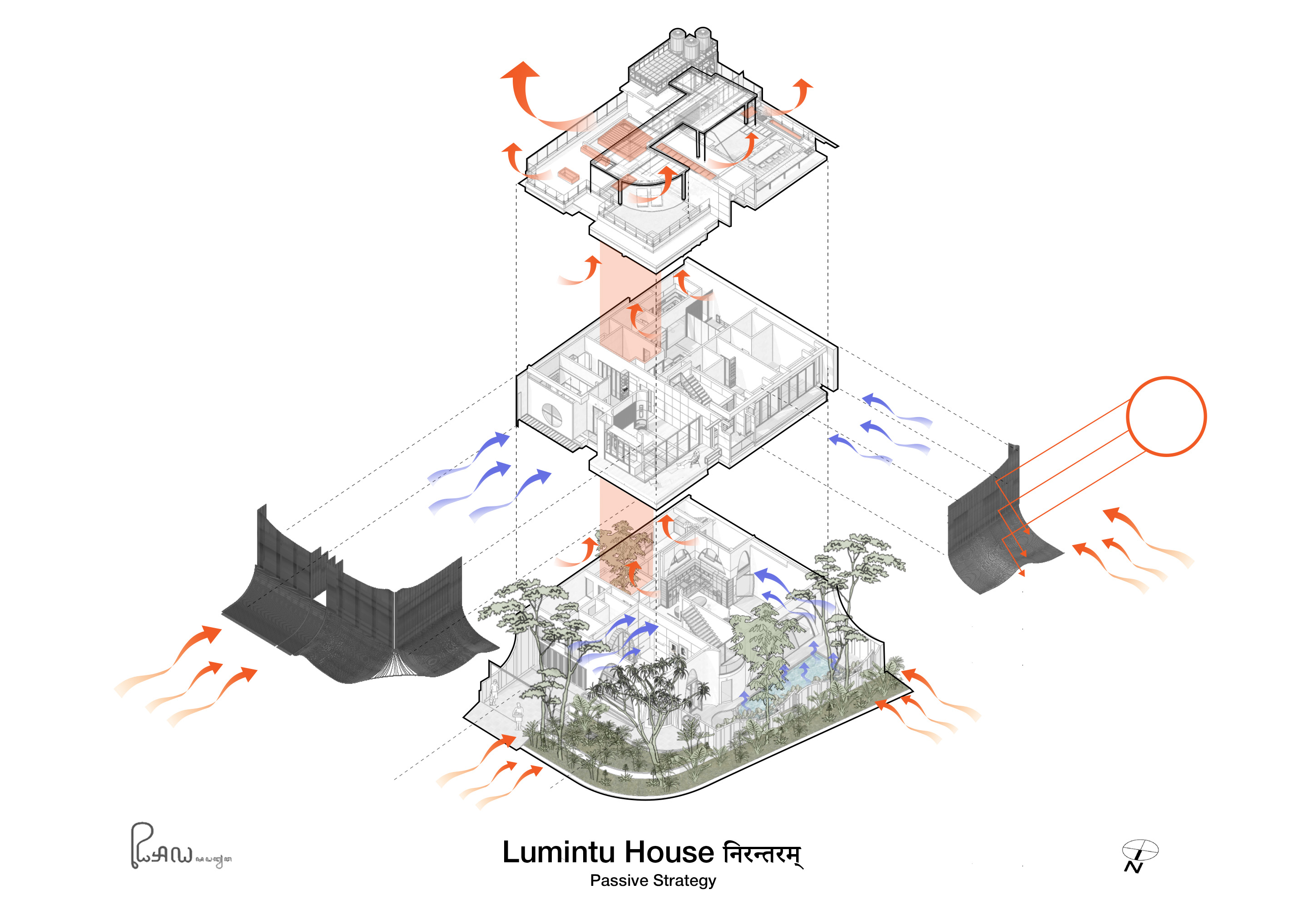 루민투 하우스는 현대적 효율성과 전통적 지혜를 결합한다. 건축적 창의성과 인도네시아 장인의 손기술은 이 프로젝트에서 유기적으로 맞닿는다. 중심부에는 공기 흐름을 유도하는 윈드 터널과 천장형 선풍기를 배치하고, 지붕과 실내 사이의 틈은 열기를 배출하는 구조로 계획했다. 높은 천장과 천창은 자연광을 최대한 끌어들이고, 메시 처리된 통풍구는 해충의 유입을 막으며 기계적 장치 없이 쾌적함을 유지하는 저기술형 생물기후 전략을 따른다. 옥상 정원과 가벼운 캐노피는 단열뿐 아니라 사적인 식사 공간을 제공하며, 에너지 사용과 탄소 배출, 물 소비를 줄이는 방식으로 작동한다. 첨단 기술이 일부에 한정되는 환경에서, 우리는 지역 자재와 수공예적 접근을 통해 편안함과 지속 가능성을 함께 추구한다.