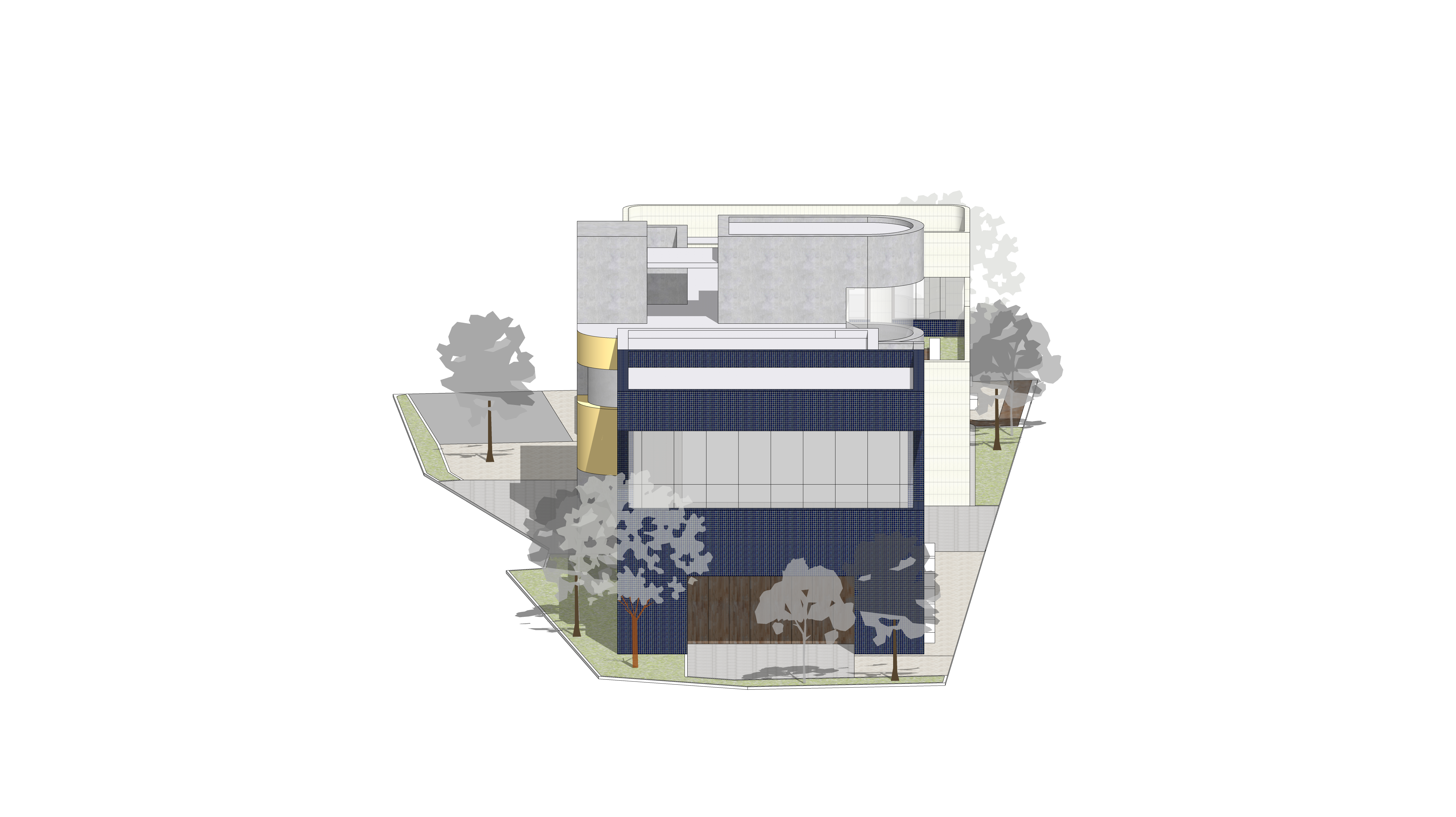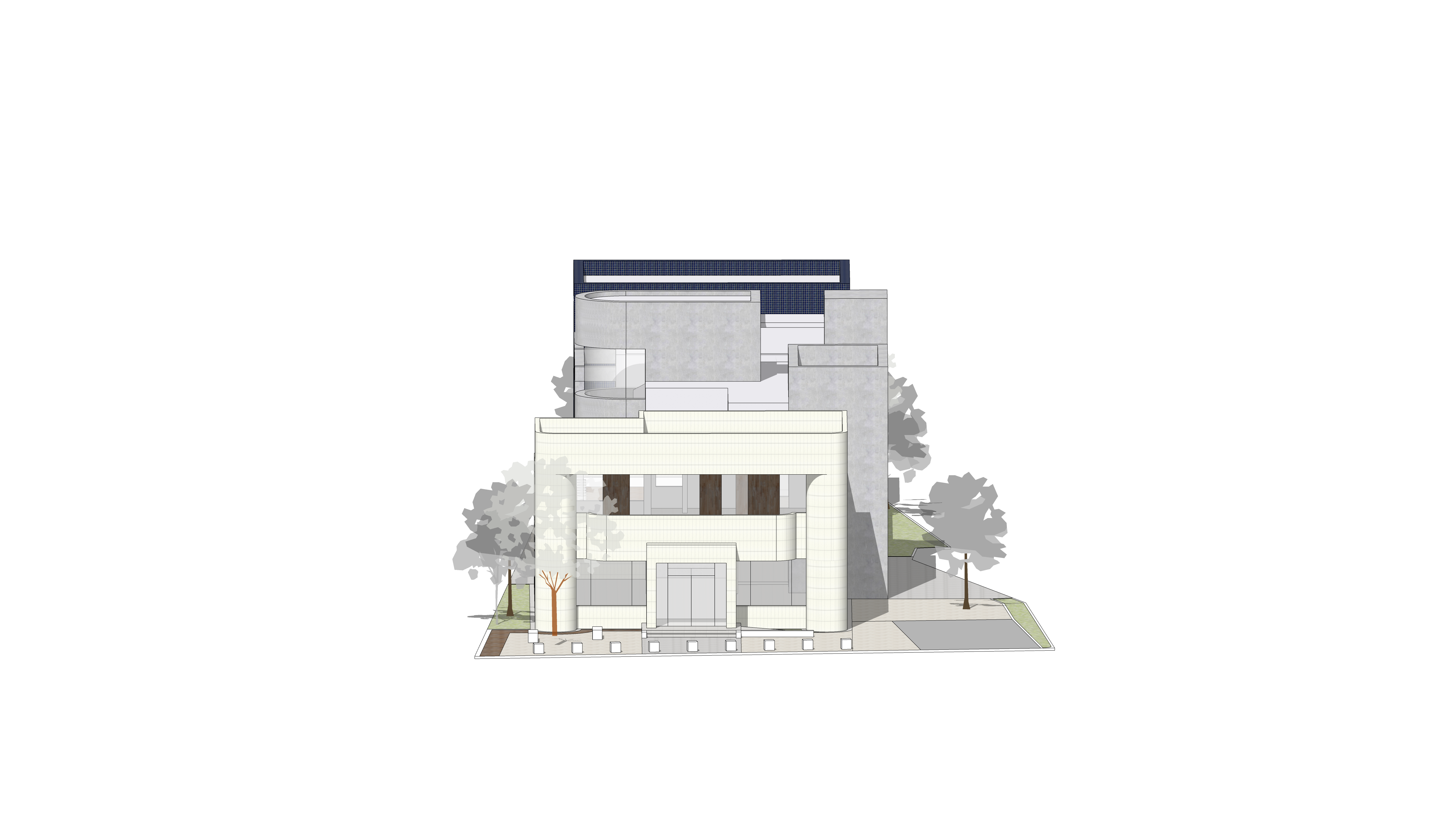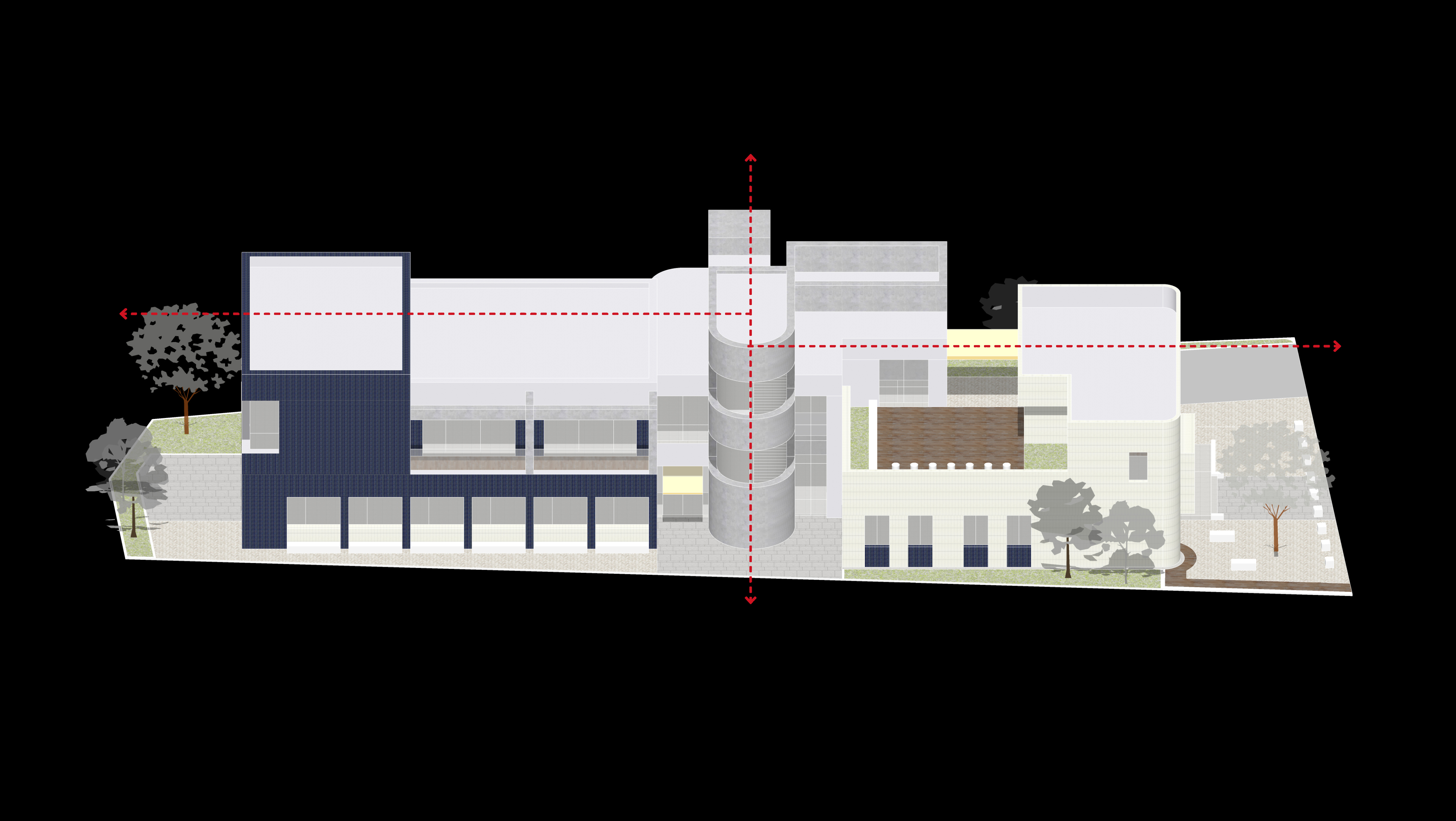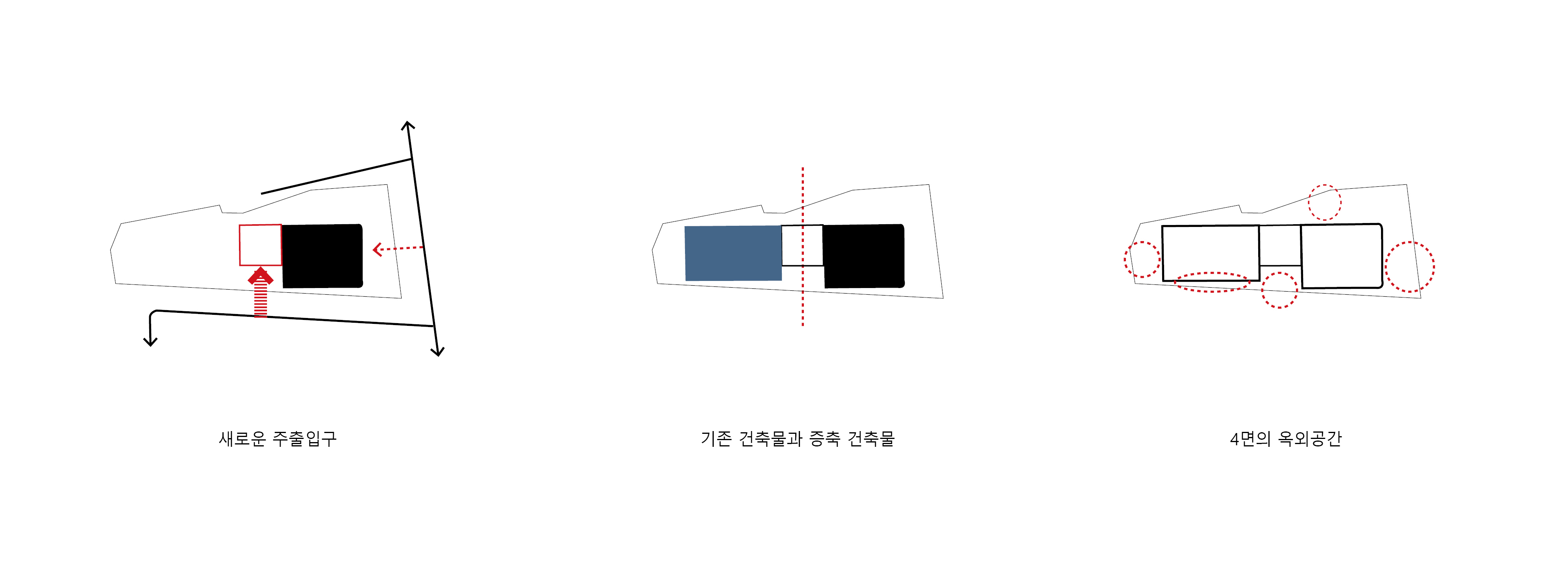 좌우 대칭으로 양쪽 끝을 잡아주는 반원형의 벽체와 지붕으로 이어지는 프레임 안에 셋백된 입면, 돌출된 주출입구와 2층 테라스 등 80-90년대 소규모 공공건축물에서 느껴지는 단정하지만 풍부한 요철을 갖는 입면 요소들을 계승한다. 정면에 비하여 다소 밋밋한 측면들은 지금의 도시 건축물들처럼 밀도 높은 도시 가로의 한 면에만 드러날 때 유효할 것이다. 주변이 점점 사라져 드러나는 건축물의 모든 면에 기존 건축물에서 느껴지는 정면성을 부여하고자 한다. 반원형의 둥근 계단탑을 중심으로 기존 건축물과 대칭적인 증축 건물을 계획한다. 대칭적인 매스의 틀 안에서 조금 더 개방적인 개구부를 두어 커튼월로 대표되는 현재의 특징도 새긴다. 매스들 사이사이의 틈과 테라스는 그 중심성을 더 강조하고, 입면에 깊이감을 준다.