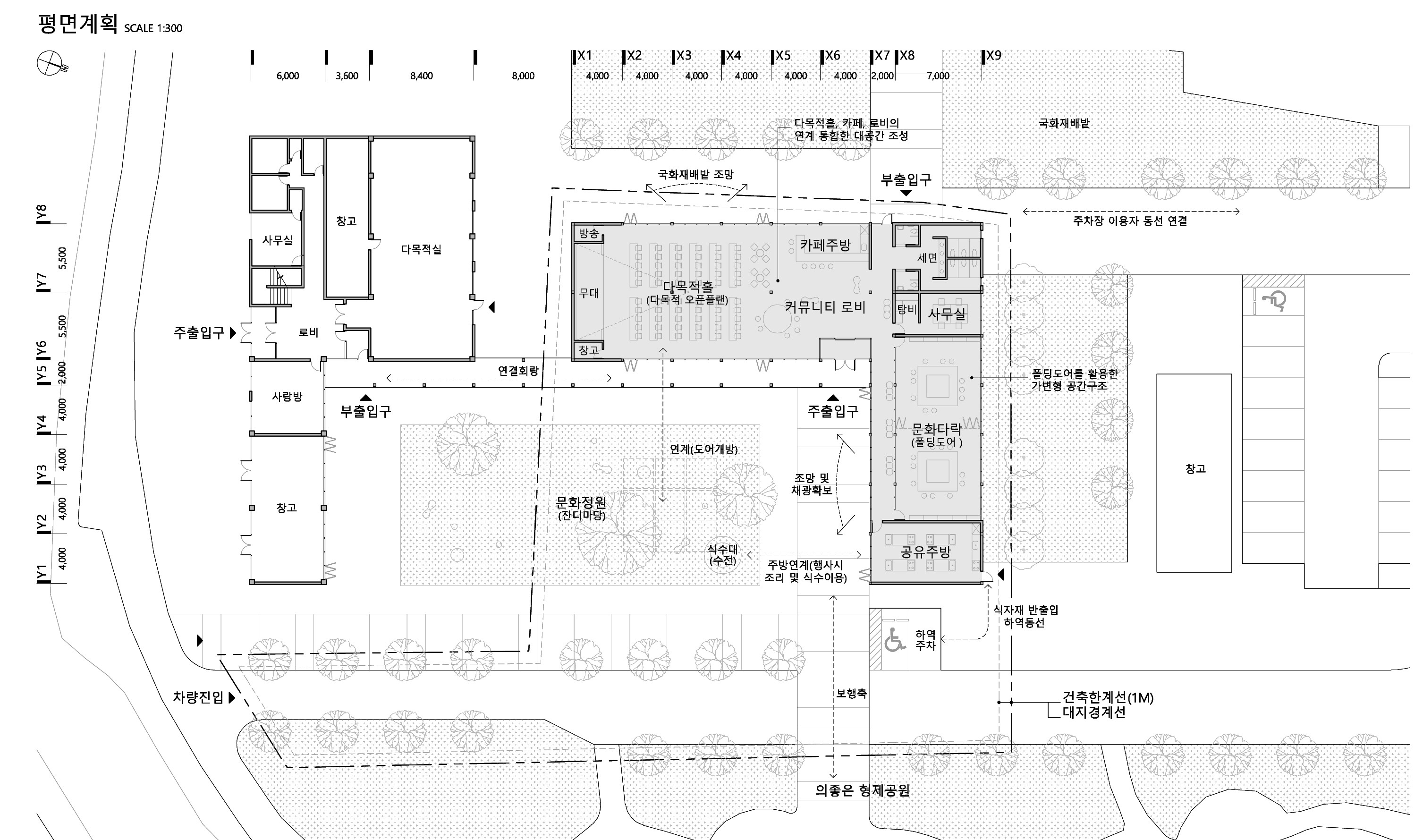 ‘ㄱ’자 형의 배치는 619대흥역과 연결하여 위요된 모습의 중정을 품게 된다. 공원을 향해 열려 있는 넓은 마당은 다양한 활동을 수용하는 외부공간으로 쓰이며 공원과 연계되어 상호작용 하게 된다. 야외공연, 플리마켓, 마을축제 등의 야외 프로그램은 실내공간과 유연하게 소통하며, 그 중간적 역할을 하는 회랑은 그늘을 만들어 사람들의 휴식의 공간이 된다.