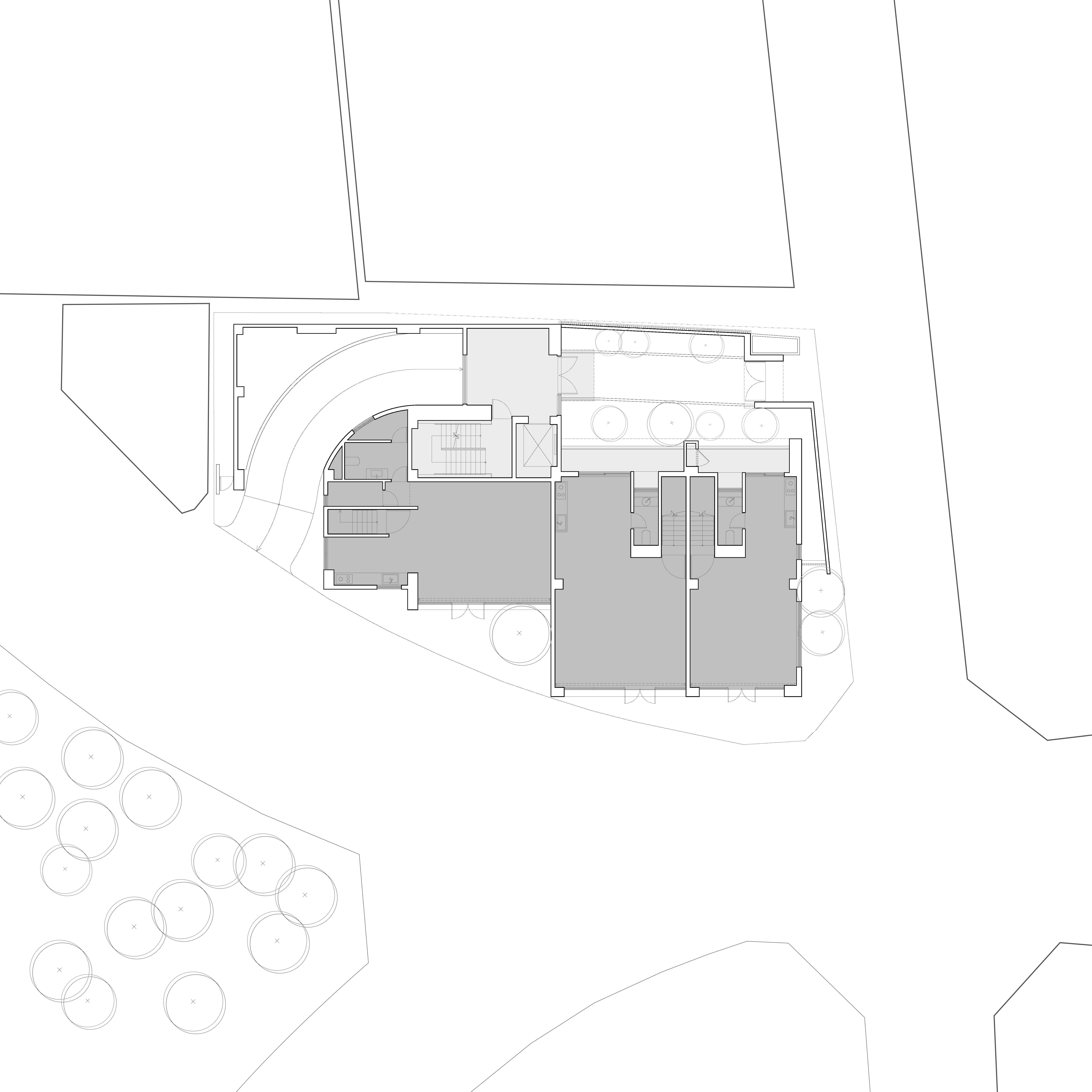 좁은 대지의 효율성을 극대화하기 위해 지하에는 경사형 램프를 통해 주차 공간을 확보했고, 건물의 매스는 1층에서 도로 경계선까지 가득 채우되, 후면은 소폭 후퇴시켜 인접 건물과의 간격을 두었다. 상부 매스는 두 동으로 분절되어 수직 방향으로 약간 어긋나게 배치되었고, 이 비대칭적 오프셋은 입주자 간의 시선과 거리감을 조절하며 부드러운 이웃 관계를 유도한다.