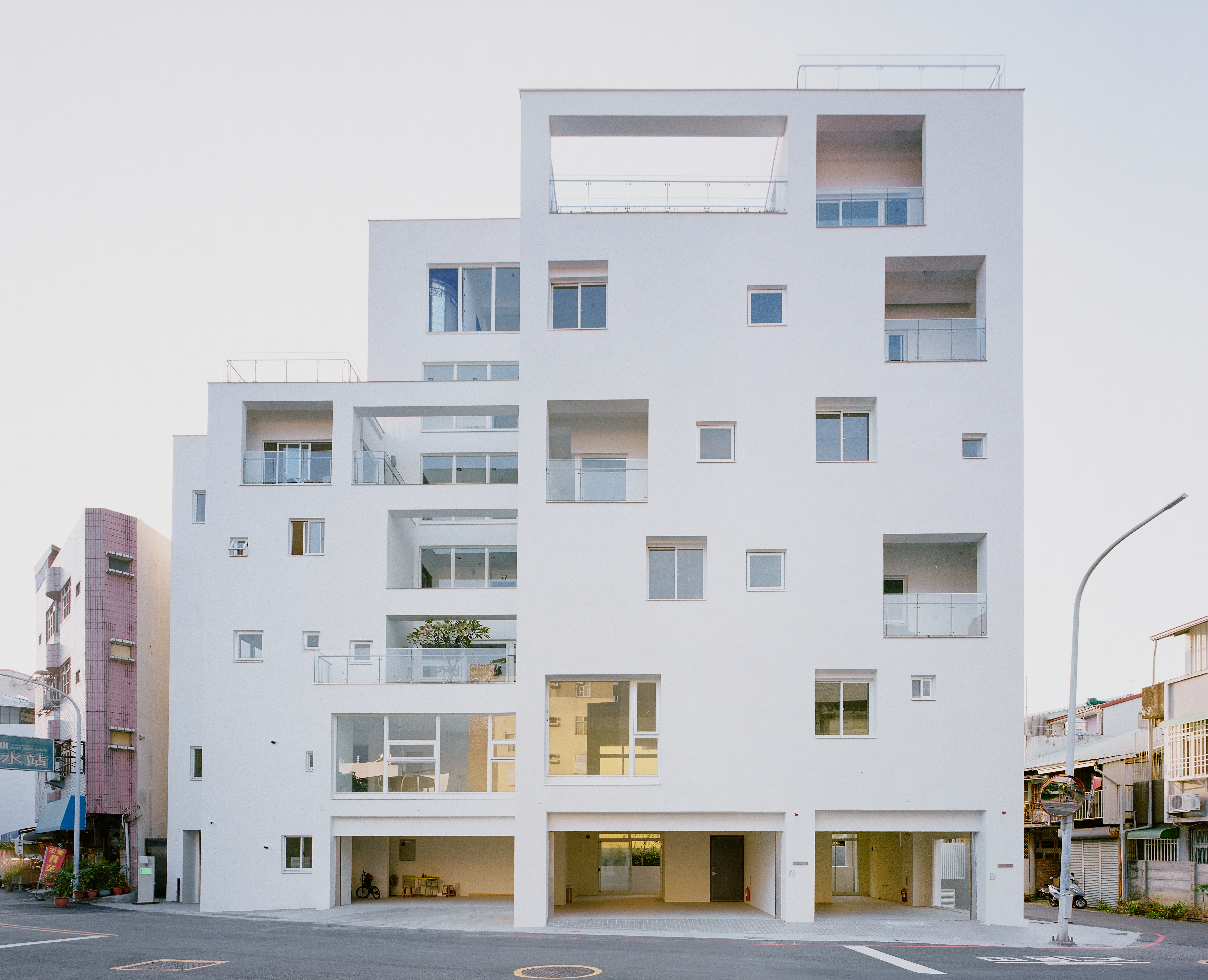 건물은 지하 1층, 지상 6층 규모이며, 남부 타이완 도시에서 흔히 볼 수 있는 혼합형 주거 상가 구조로 이루어져 있다. 거리와 공원을 마주한 전면에는 상업용 복층 가구가 자리하고, 주거 출입구는 보다 조용한 골목 쪽 후면에 배치되어 상업과 주거의 영역을 분리했다.