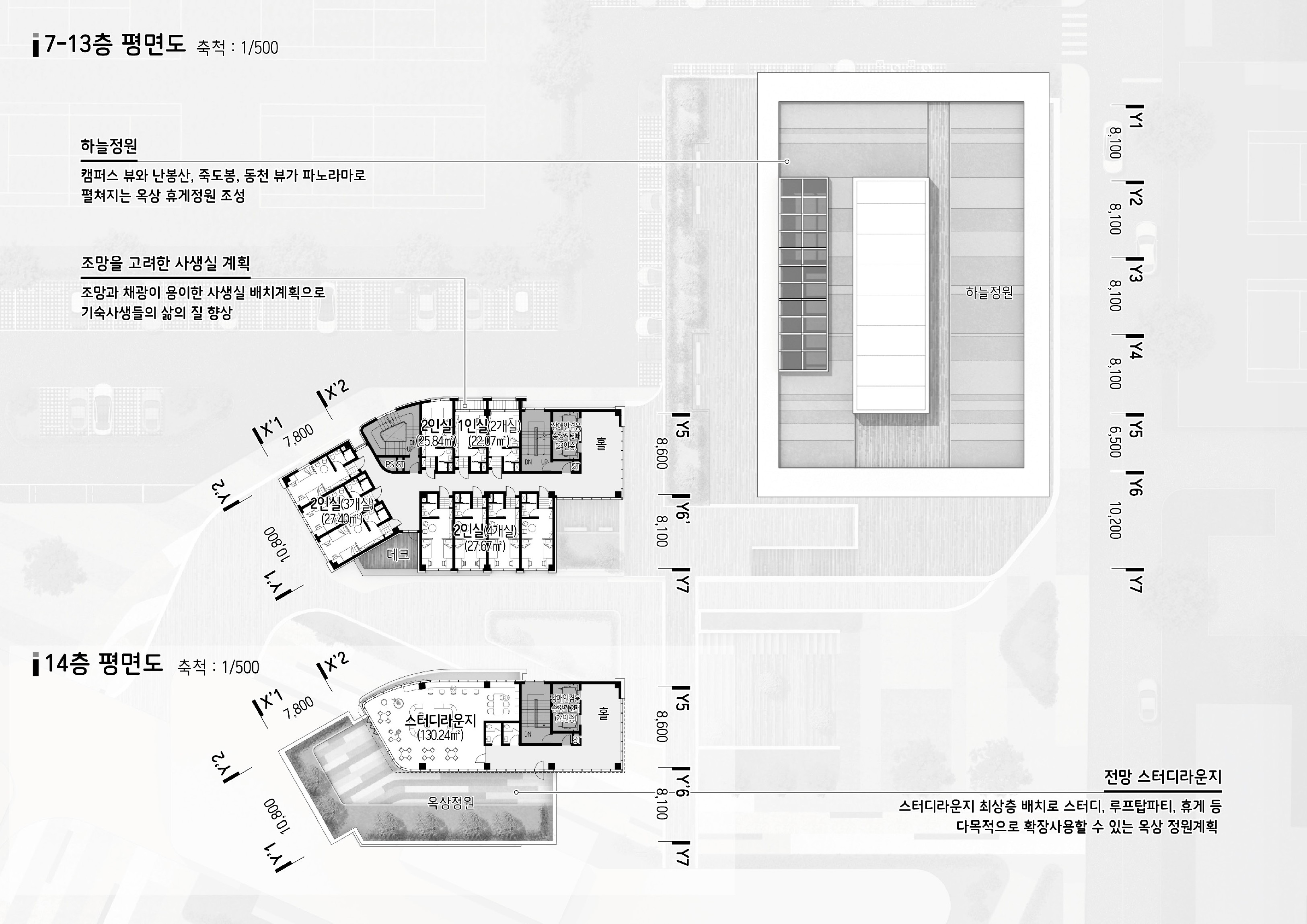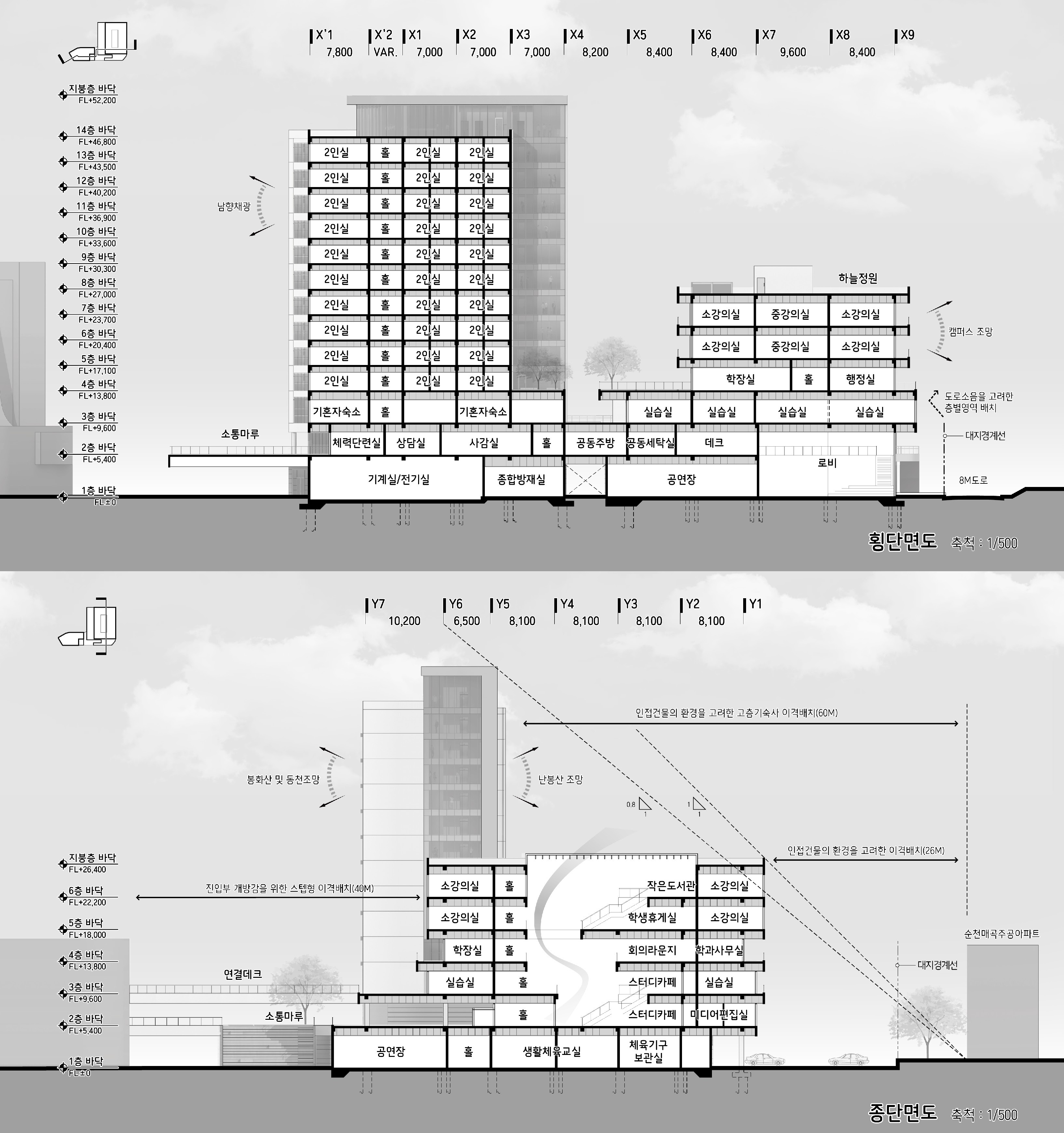기숙사동은 대지의 중심에 배치되어 순천대의 새로운 아이콘으로 자리한다. 상징적 스카이라인을 형성하여 캠퍼스의 정체성을 드러낸다. 평생교육동은 컨벤션관과 연계해 외부와의 접점을 강화하고, 입면은 수평적 리듬과 수직적 조형을 조화시켜 주변 환경과 어울리면서도 독립적 정체성을 가진다.