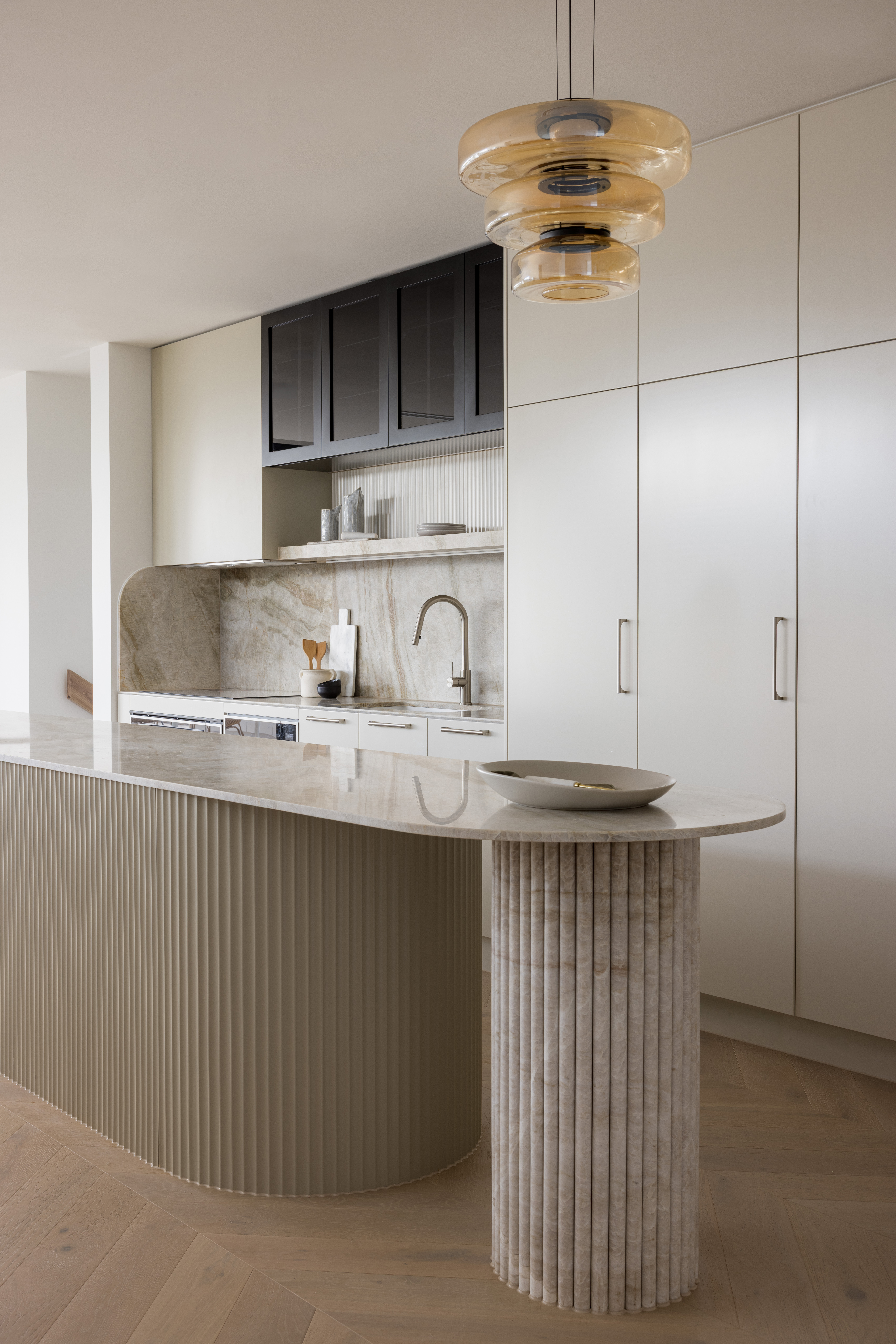 사용된 재료는 오크 바닥, 울 카펫, 쿼츠사이트, 석회석을 활용하여 따뜻하고 우아한 톤을 제공한다. 내부의 오목한 곡선과 형태는 외관에도 반영된다. 밝고 따뜻한 색조는 클라이언트가 선택한 것으로, 차분하고 안정된 환경을 만들어낸다.