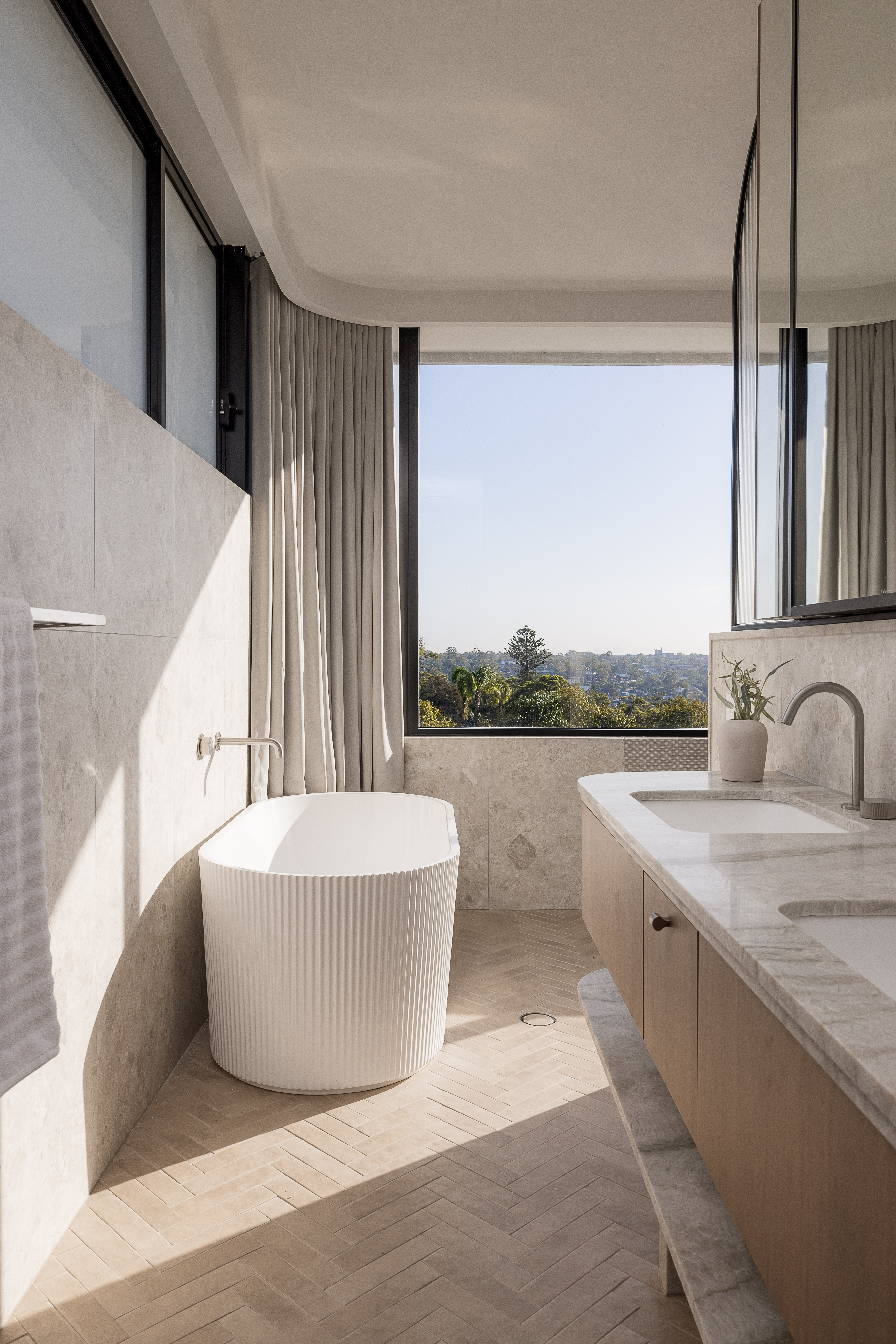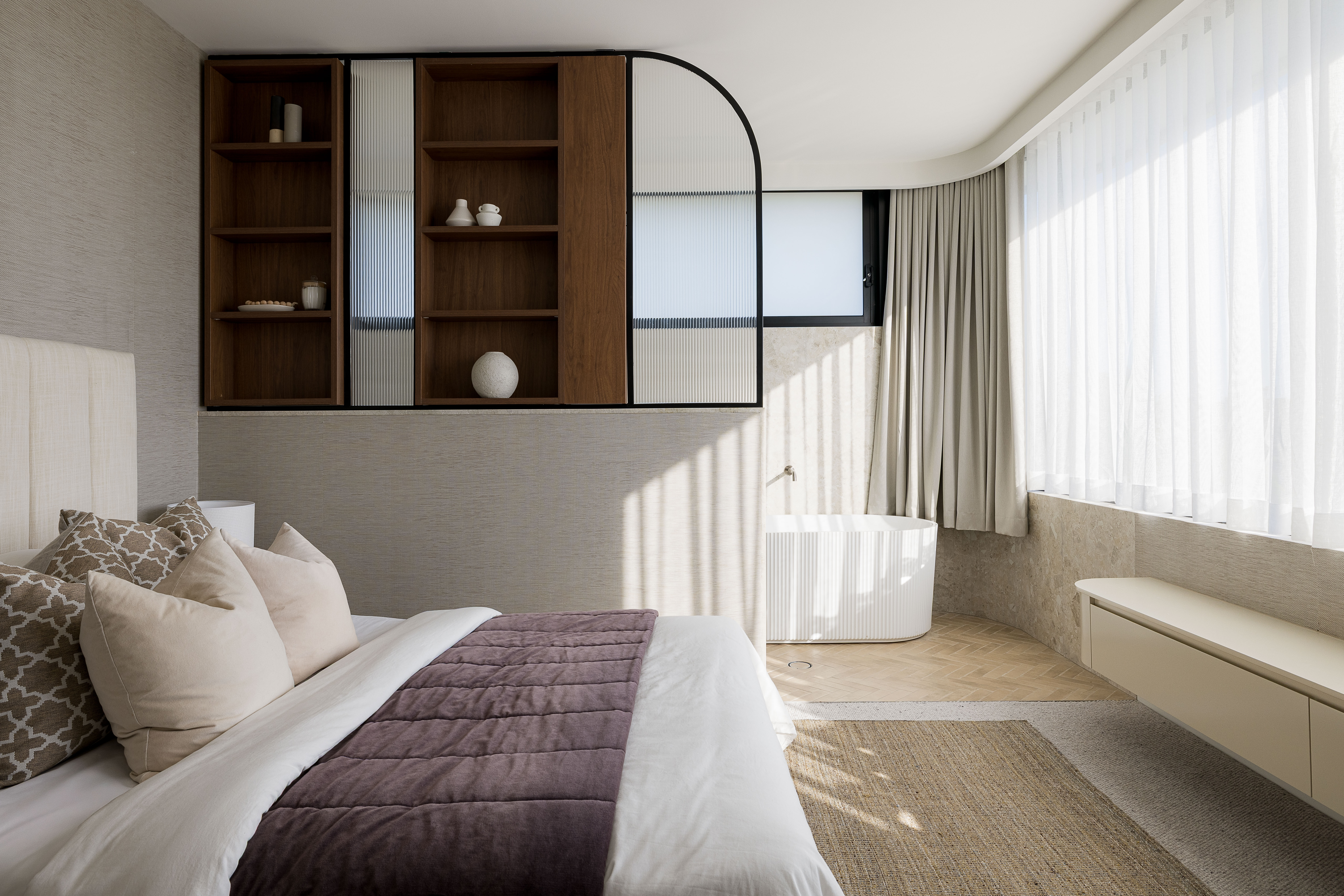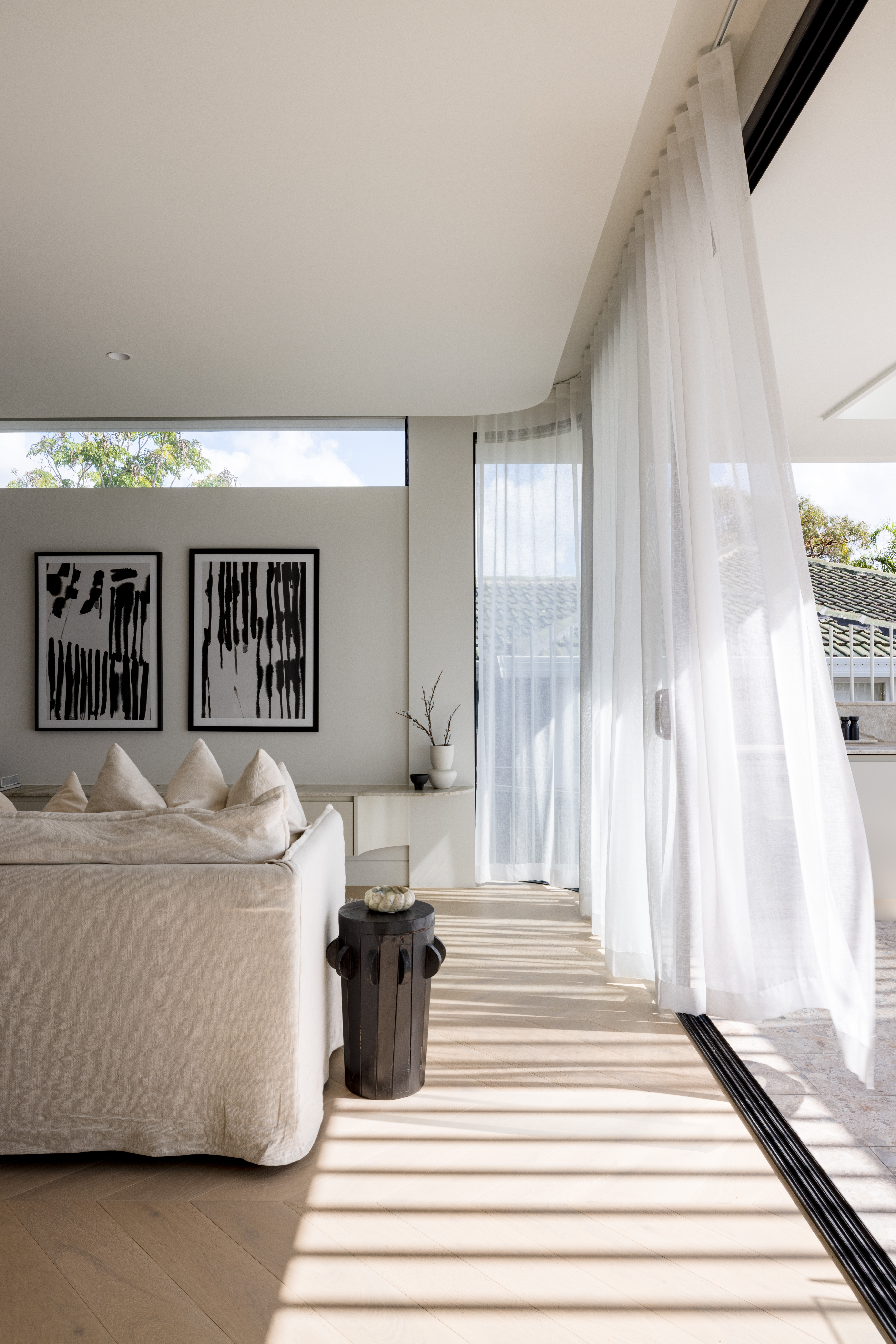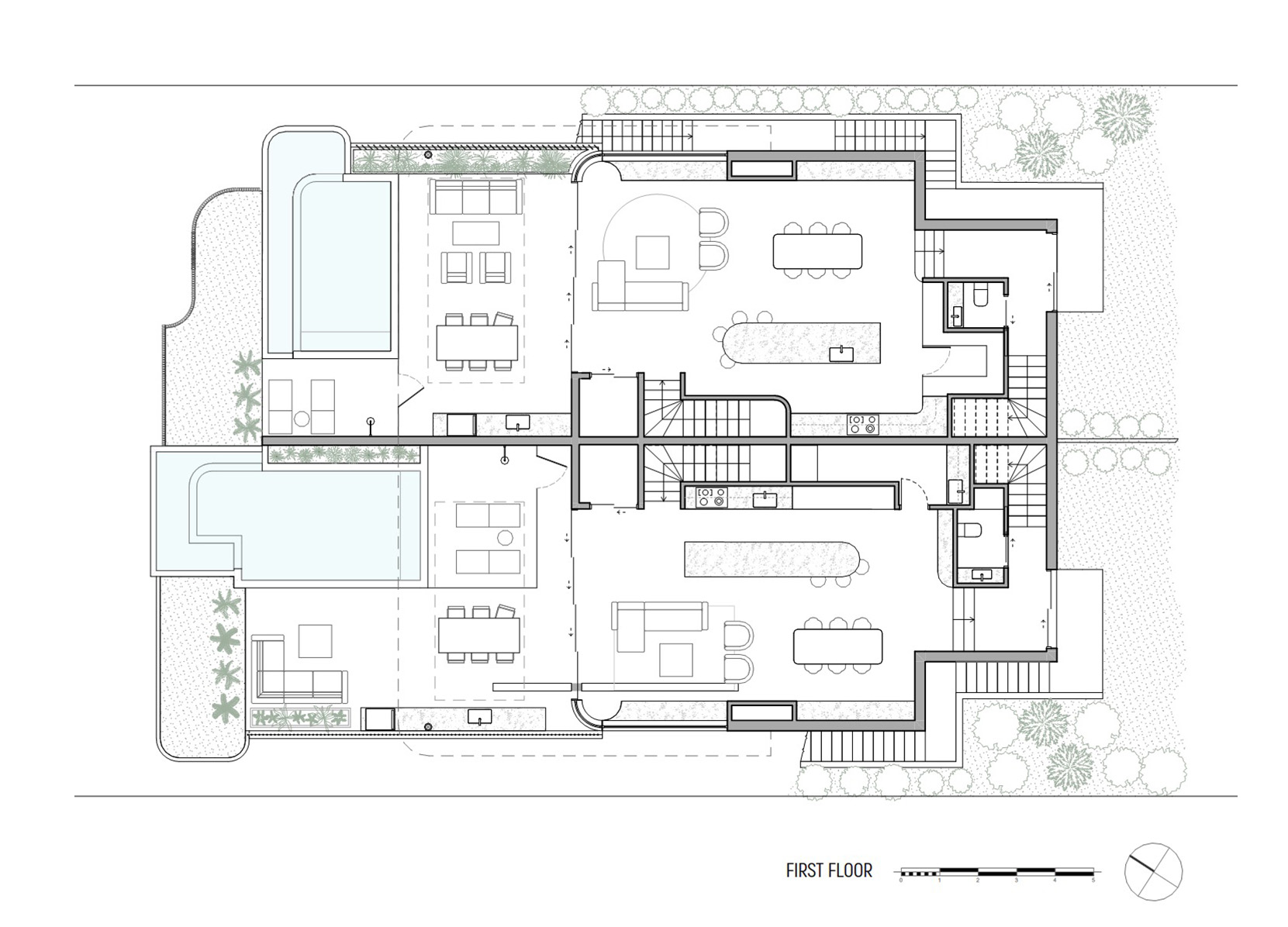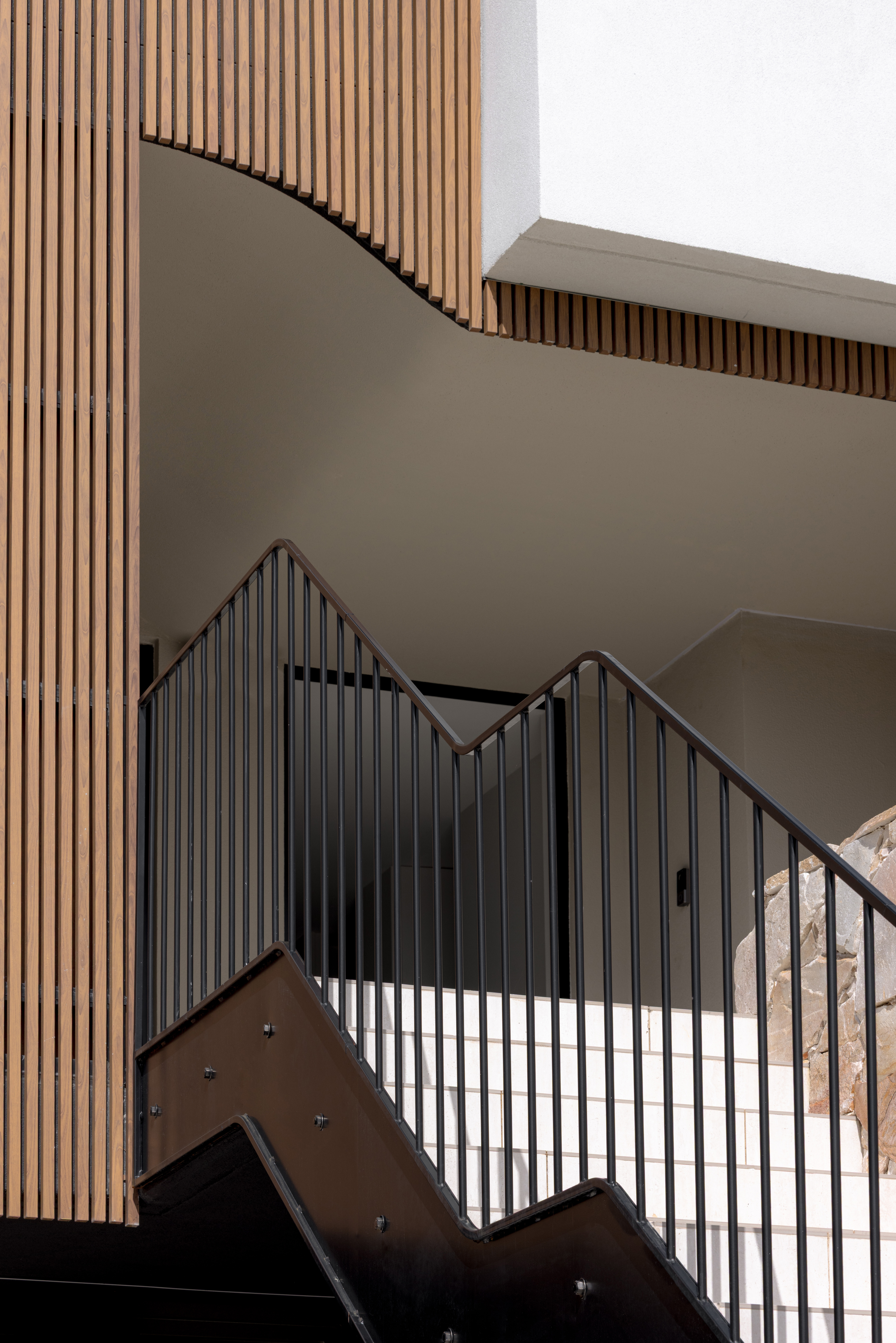 클라이언트는 만을 직접 바라볼 수 있는 떠 있는 수영장을 원했으며, 이를 주요 생활 공간과 연결하고 내부 공간과도 조화를 이루게 하기를 원했다. 이 공간을 생활 공간과 연결하고 자연광을 충분히 확보하는 것이 과제였다. 호주 교외 주택은 일반적으로 넓은 뒷마당이 있어 대부분의 야외 활동이 그곳에서 이루어지는데, 우리는 이 개념을 뒤집어 전면에 외부 공간을 배치하여 클라이언트의 요구를 충족시켰다.