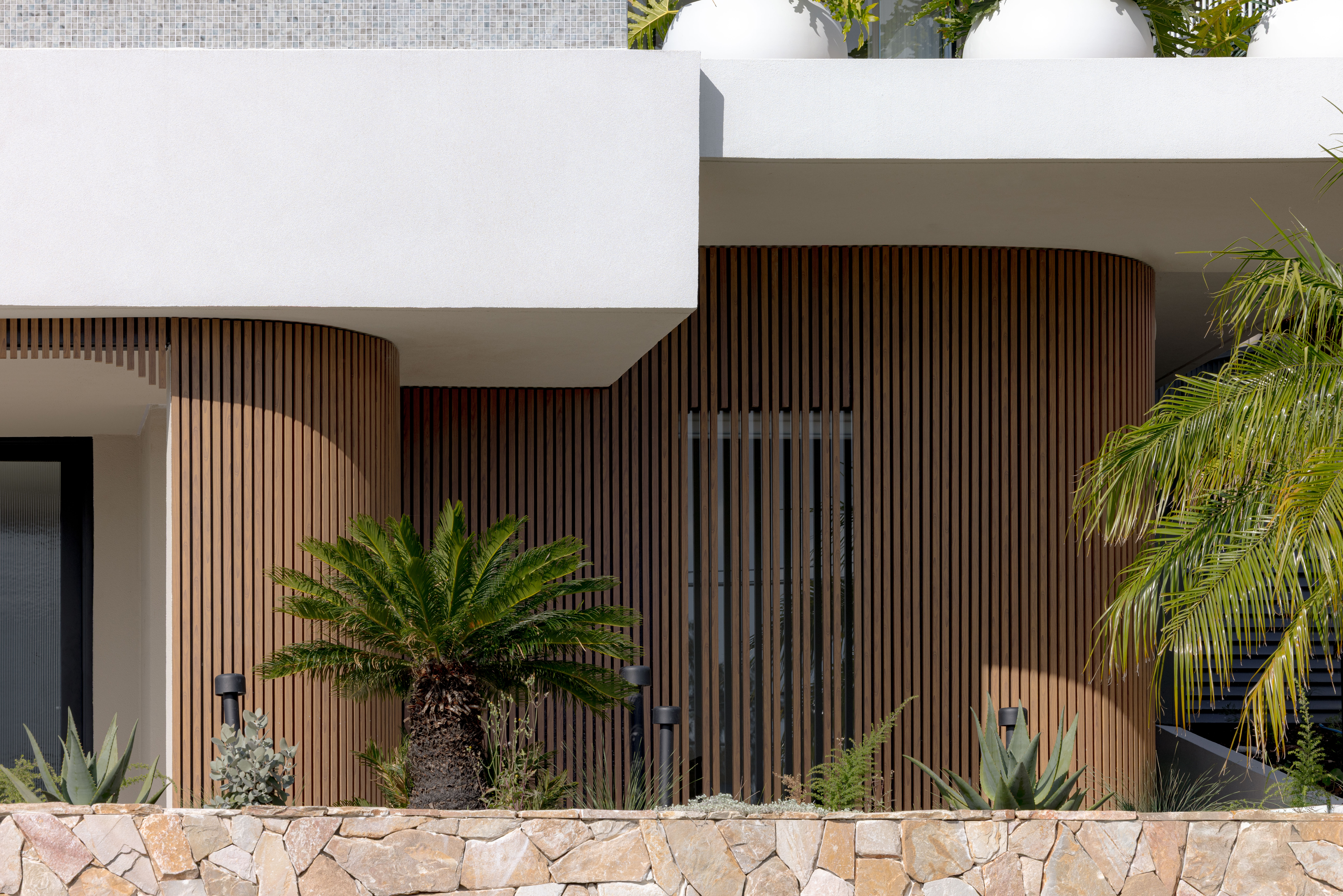 북측 외벽에는 큰 문과 창문을 설치하여 자연광이 실내로 흐르도록 하고, 조절 가능한 지붕을 통해 야외 공간에서 햇빛을 관리할 수 있게 했다. 주택의 곡선 형태는 외관을 부드럽게 만들고, 전면의 계단식 암석 정원과 대조를 이룬다. 이러한 곡선 형태는 내부에도 반영되어, 곡선 천장과 내부 가구의 플루트 장식으로 나타난다.