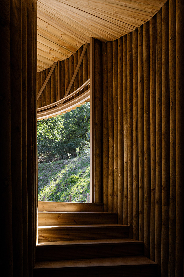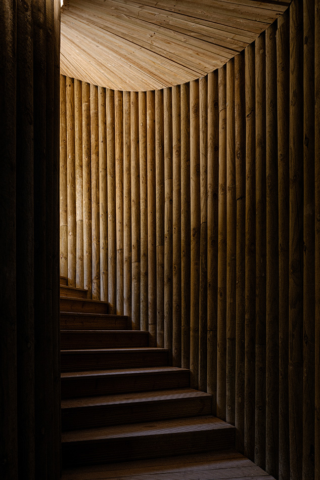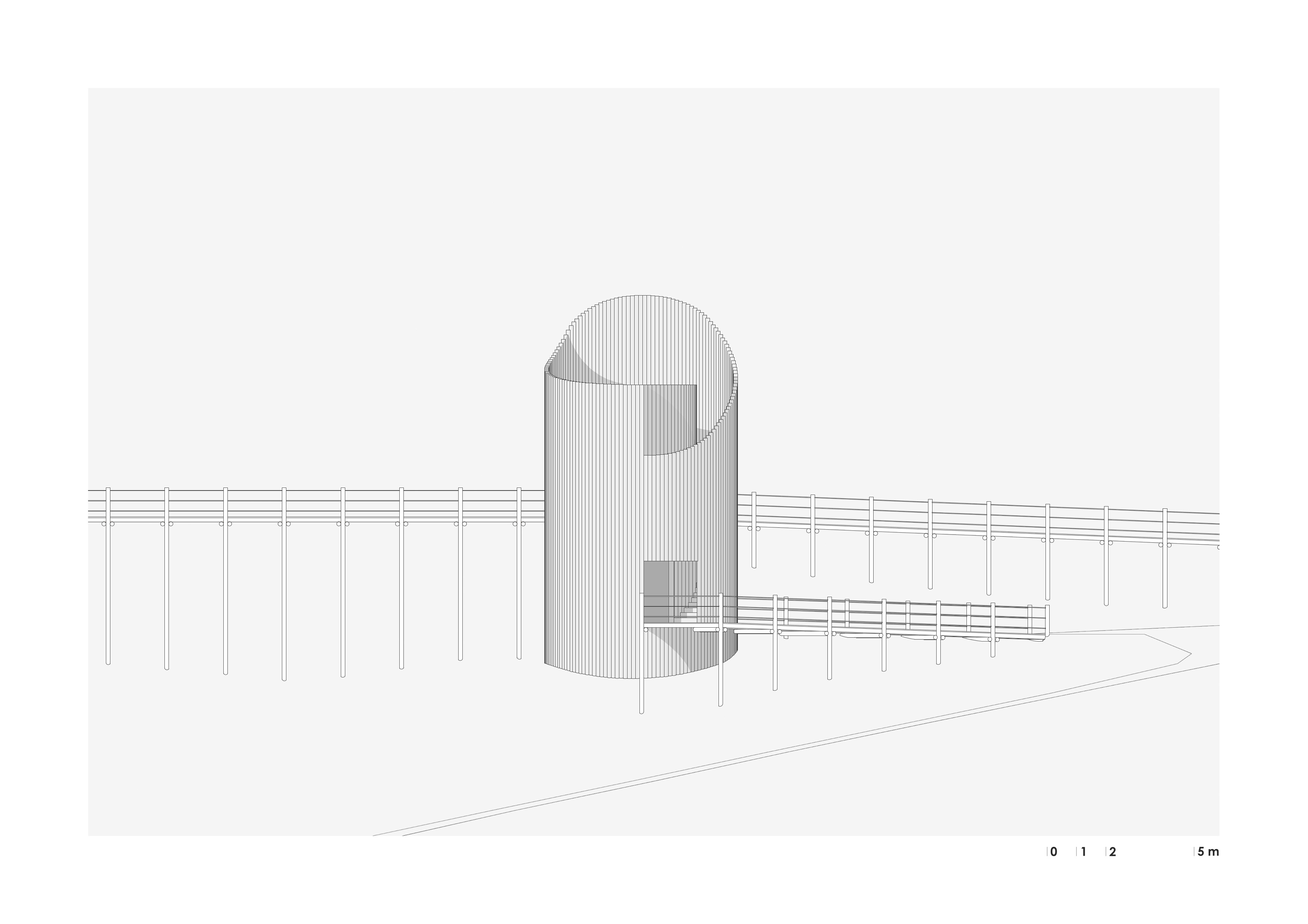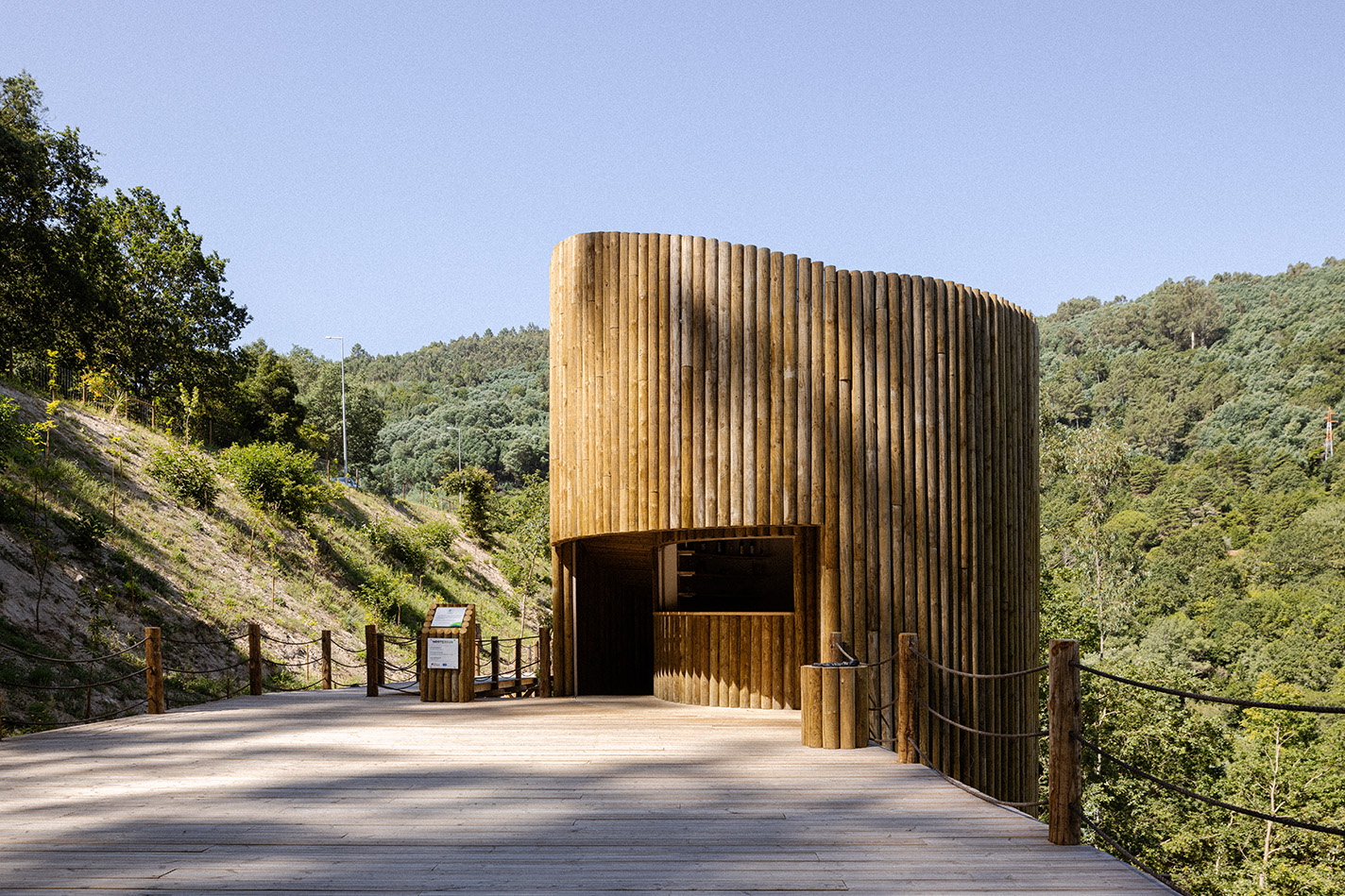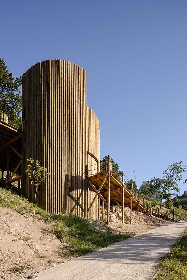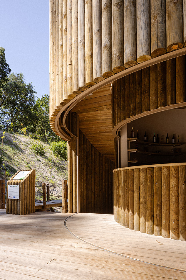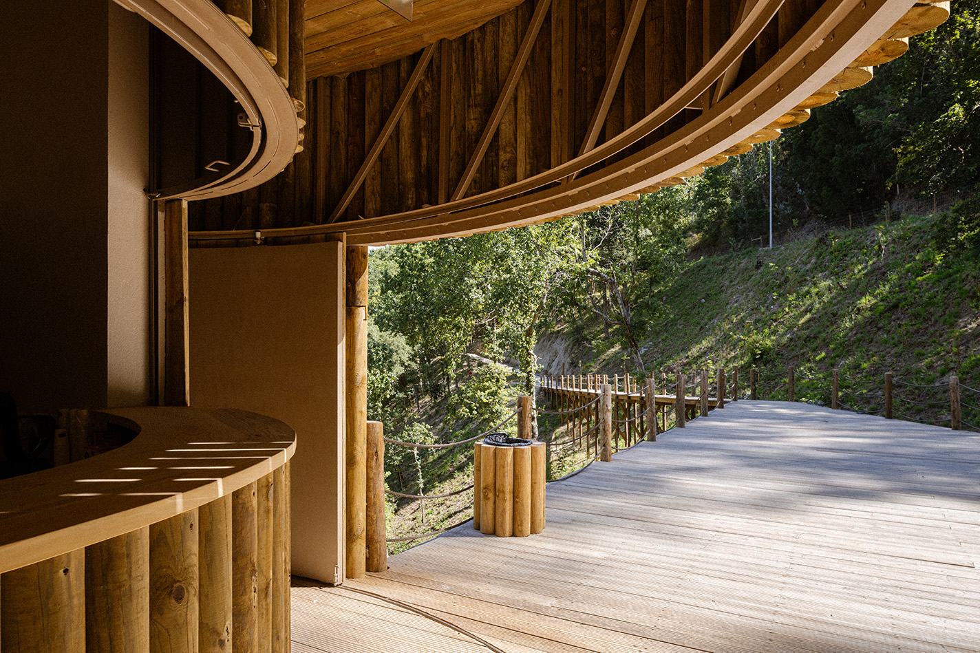 경로와 테마 구역의 교차점에는 잘려나간 나무 줄기를 조각적으로 형상화한 건물이 세워졌다. 원형 평면의 이 건물은 세 개 층으로 구성되며, 공원의 지원 시설을 집중한다. 하부에는 위생 및 기술 공간, 중간 층에는 야외 테라스와 연결된 바, 상부에는 자연을 조망하는 옥외 공간이 배치된다.