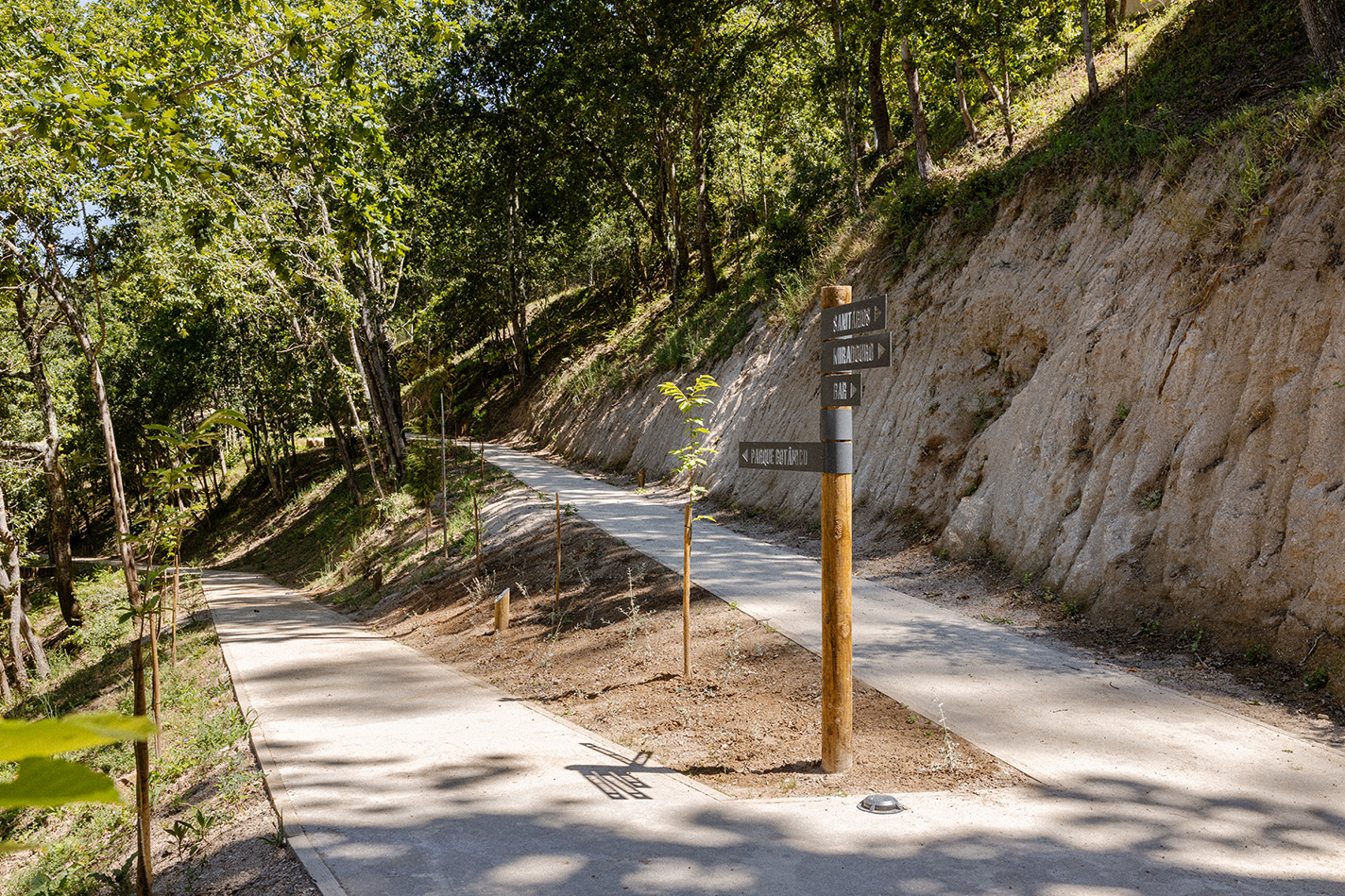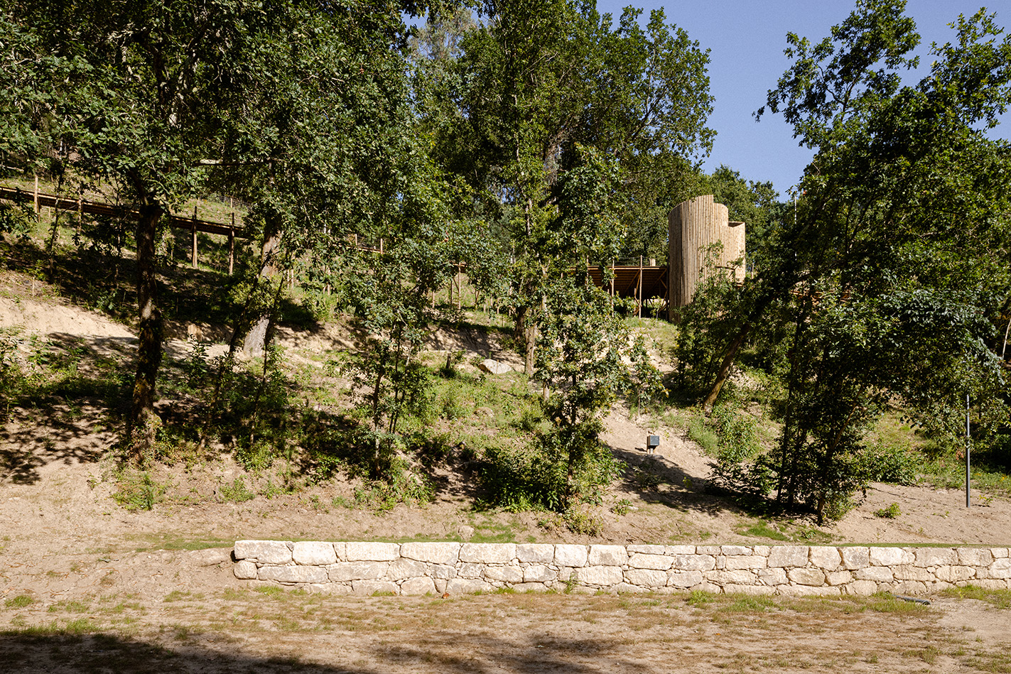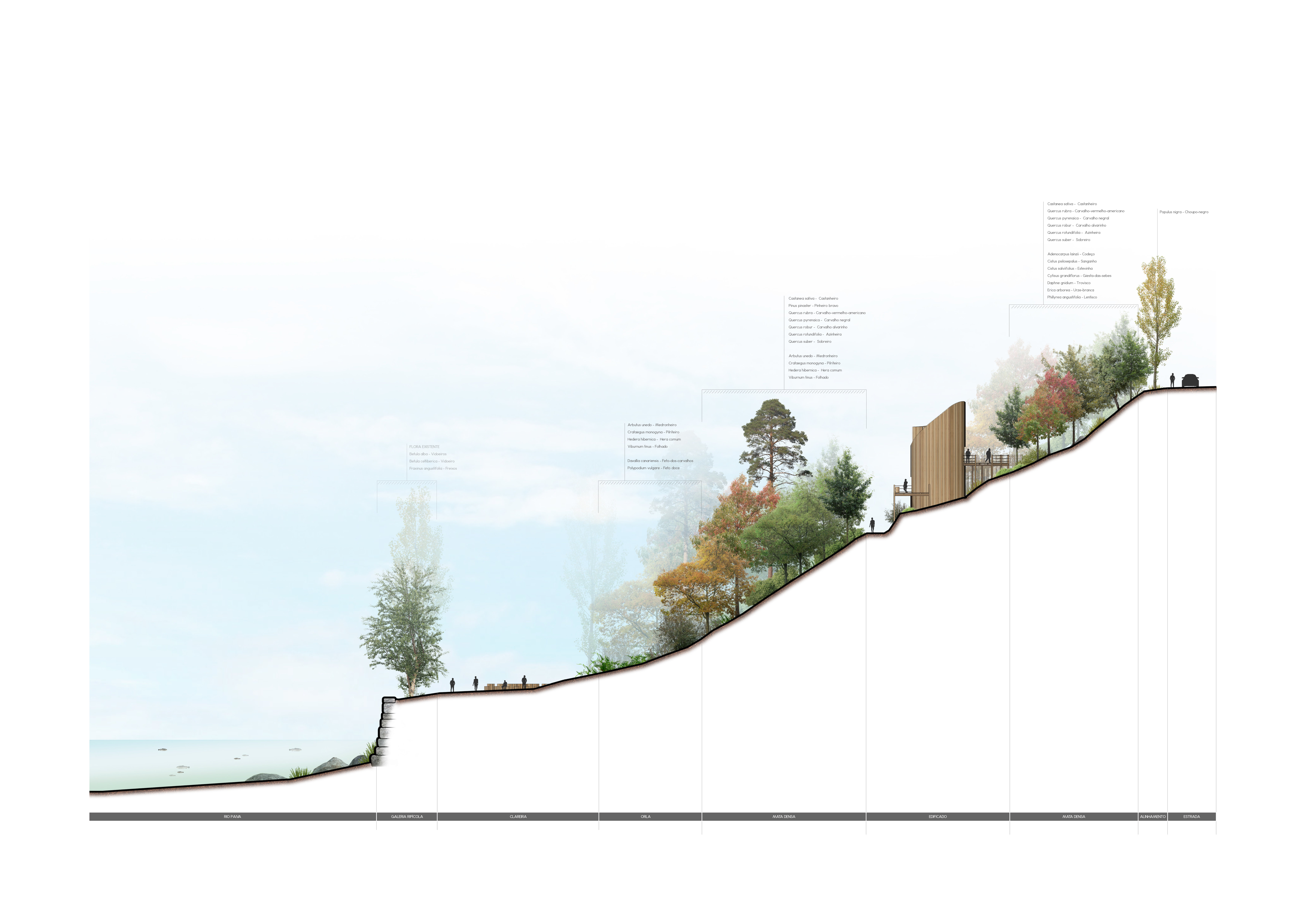 개입에 앞서 우선적으로 현장을 정화하고 외래종을 제거하여 토착 식물뿐 아니라 농업적 사용의 흔적을 드러냈다. 그 결과 무너진 벽과 계단식 경작지, 작은 건물의 폐허가 드러나며 장소의 과거가 밝혀졌다. 이 분석을 토대로 공원 개입의 개념이 형성되었으며, 자연 재료의 사용과 경로 및 테마 구역의 교차점에 세워진 건물이 주요 전략이 되었다.