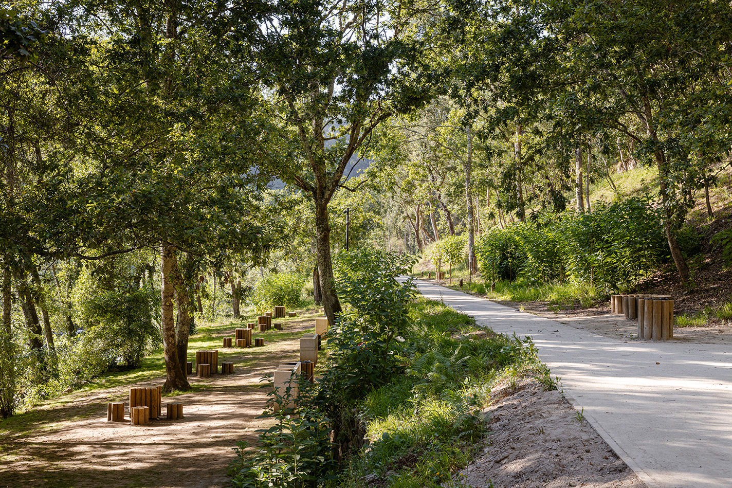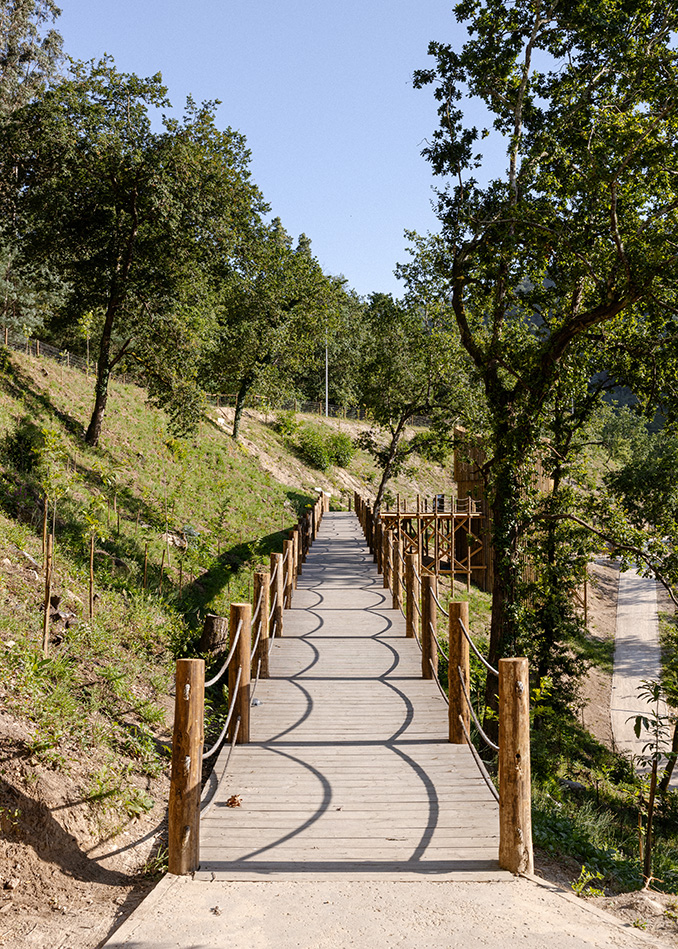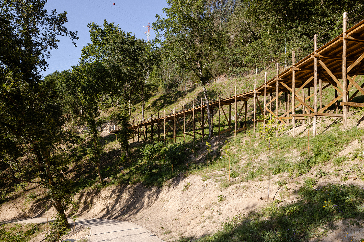 개입에 앞서 우선적으로 현장을 정화하고 외래종을 제거하여 토착 식물뿐 아니라 농업적 사용의 흔적을 드러냈다. 그 결과 무너진 벽과 계단식 경작지, 작은 건물의 폐허가 드러나며 장소의 과거가 밝혀졌다. 이 분석을 토대로 공원 개입의 개념이 형성되었으며, 자연 재료의 사용과 경로 및 테마 구역의 교차점에 세워진 건물이 주요 전략이 되었다.