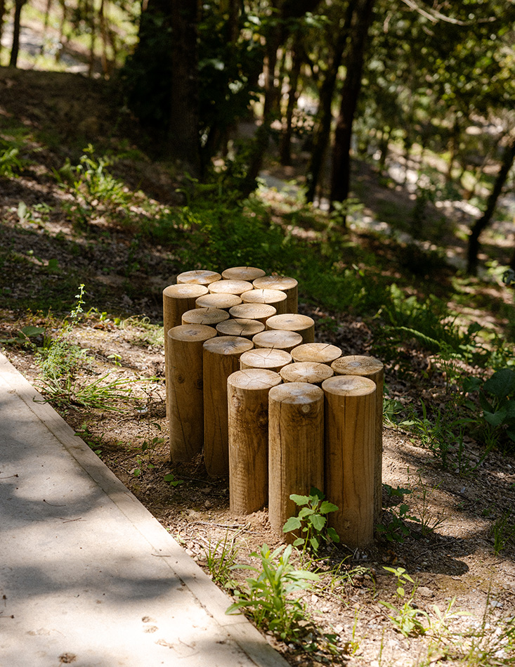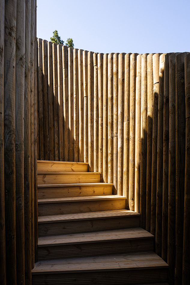 길은 자갈, 건물은 목재라는 단순한 재료가 선택되었다. 특히 나무 기둥은 나무 줄기를 연상시키는 원형 요소로, 건물에서 야외 가구까지 공원 내 모든 구조물을 형성하는 기본 단위이다. 이러한 재료는 시간이 흐르며 자연의 힘에 의해 변화하고 수용되도록 의도되었다.
