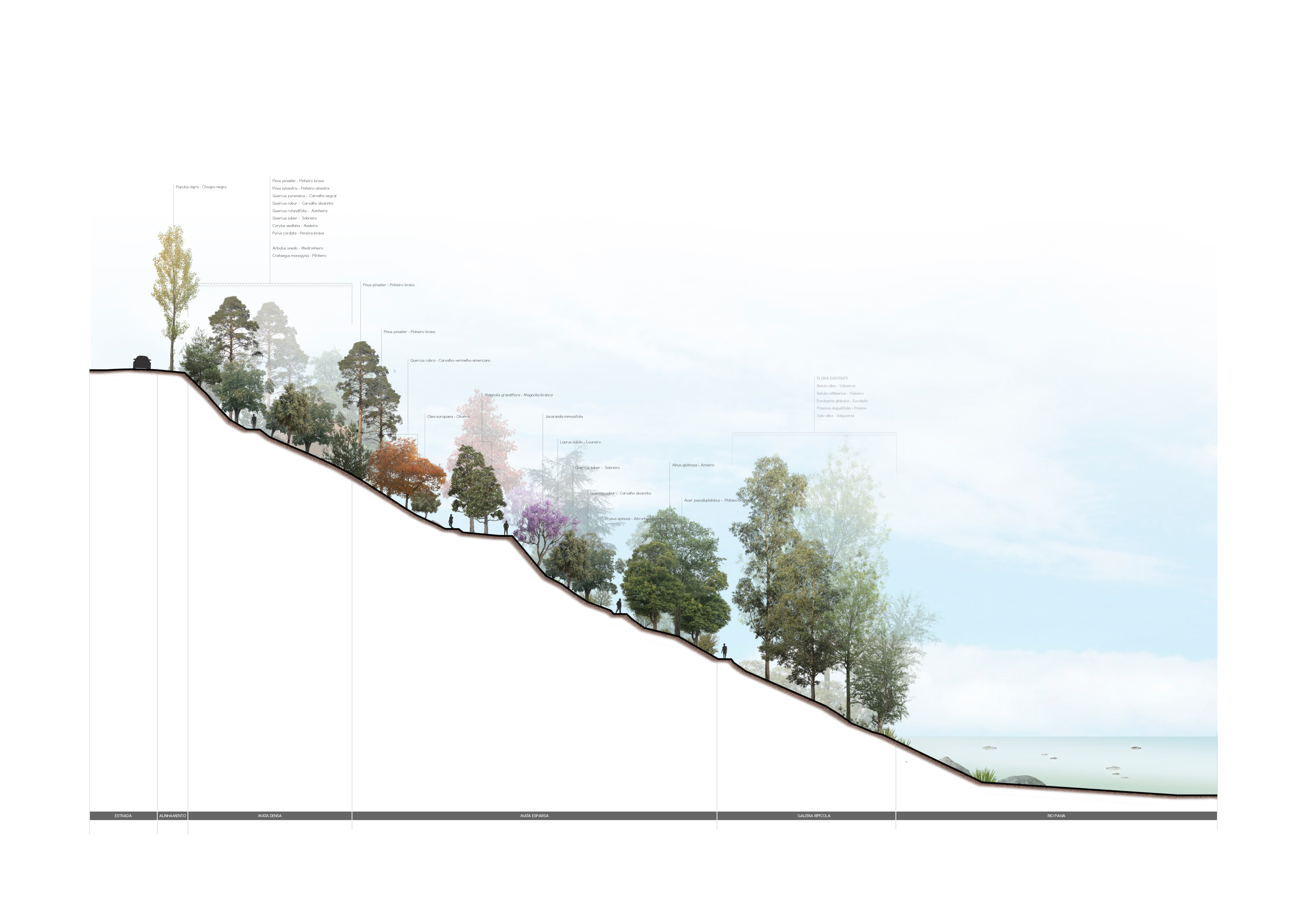 개입에 앞서 우선적으로 현장을 정화하고 외래종을 제거하여 토착 식물뿐 아니라 농업적 사용의 흔적을 드러냈다. 그 결과 무너진 벽과 계단식 경작지, 작은 건물의 폐허가 드러나며 장소의 과거가 밝혀졌다. 이 분석을 토대로 공원 개입의 개념이 형성되었으며, 자연 재료의 사용과 경로 및 테마 구역의 교차점에 세워진 건물이 주요 전략이 되었다.