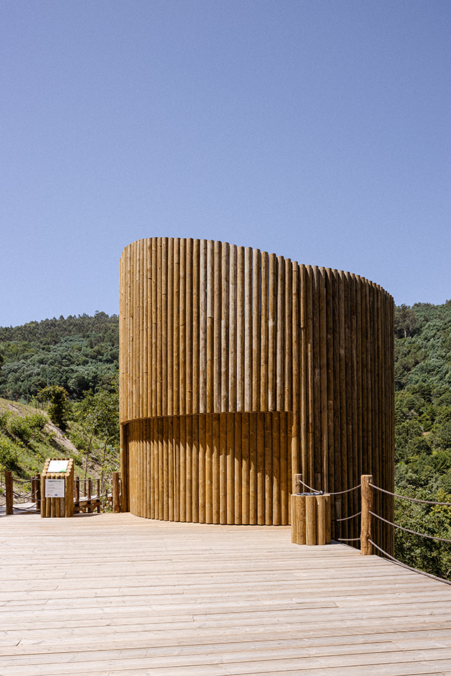 경로와 테마 구역의 교차점에는 잘려나간 나무 줄기를 조각적으로 형상화한 건물이 세워졌다. 원형 평면의 이 건물은 세 개 층으로 구성되며, 공원의 지원 시설을 집중한다. 하부에는 위생 및 기술 공간, 중간 층에는 야외 테라스와 연결된 바, 상부에는 자연을 조망하는 옥외 공간이 배치된다.