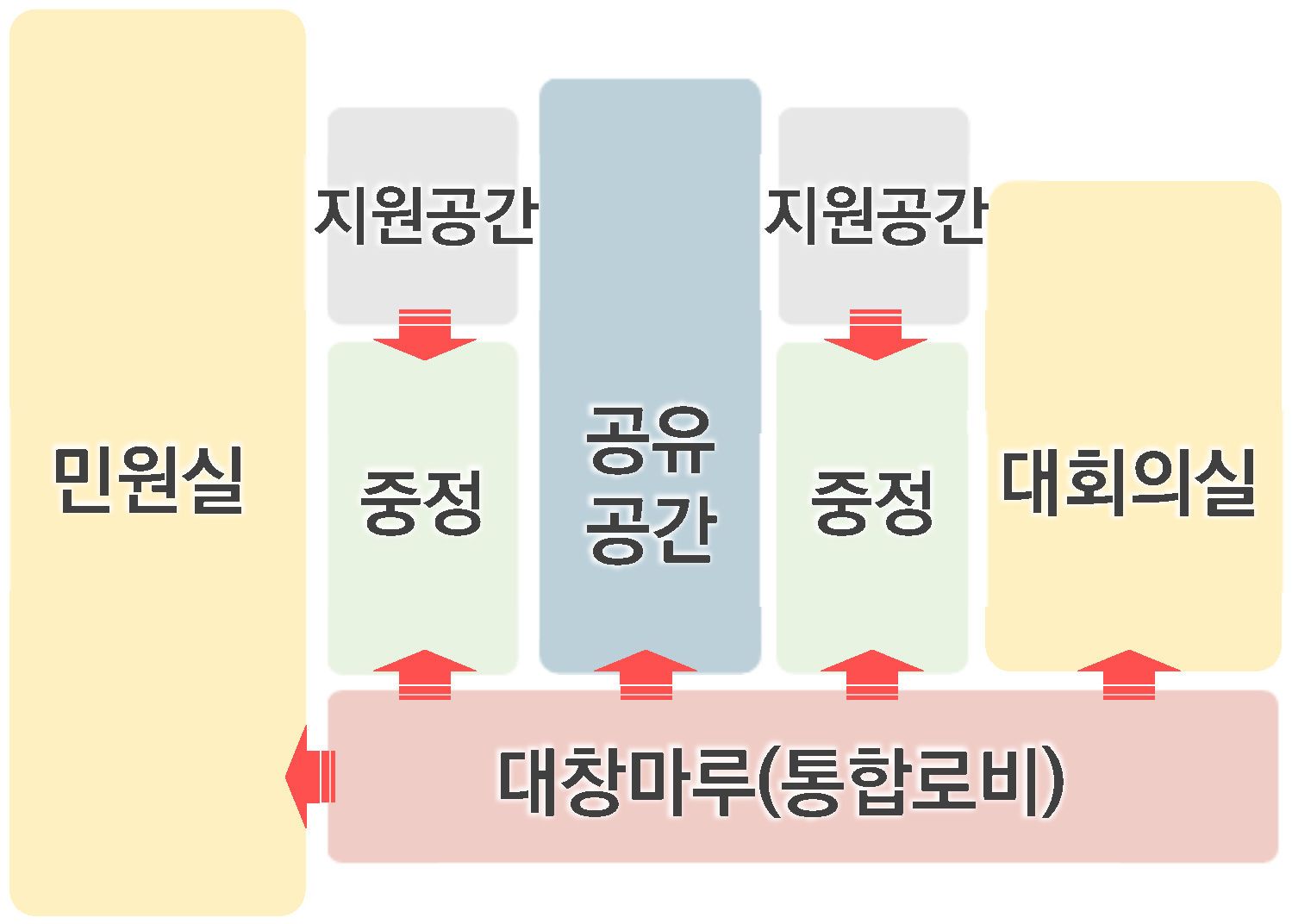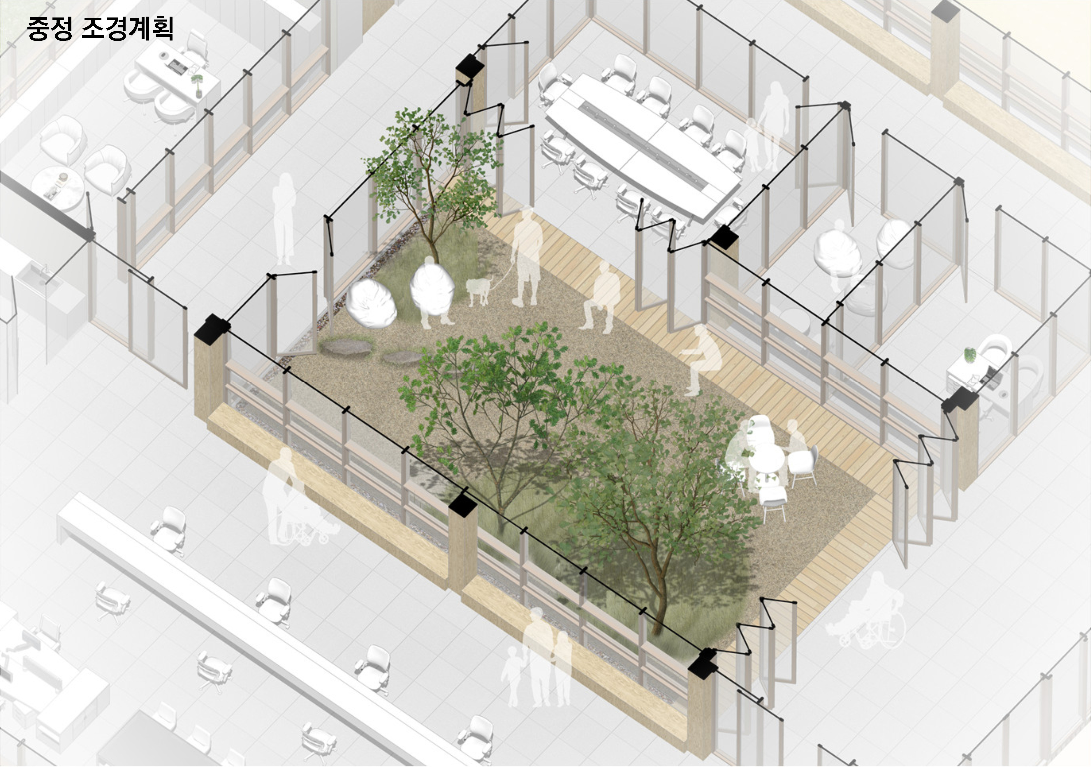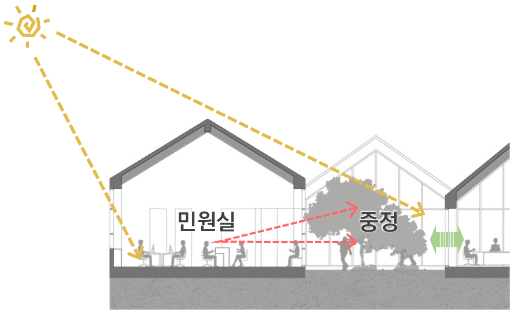 대창마루를 통과하는 빛과 바람은 내부와 외부를 자연스럽게 이어주고, 실내 어디서든 계절의 변화를 느낄 수 있도록 한다. 중정은 단순한 휴식 공간을 넘어 주민과 근무자가 함께 누리는 열린 풍경이 되며, 사계절 다른 표정을 품어 삶의 리듬을 더한다. 회의실은 필요할 때는 업무 공간으로 활용되지만, 문을 열면 곧바로 주민을 위한 강연·전시·동아리 활동의 무대로 확장된다. 일상의 공공성과 비일상의 특별함이 공존하는 공간이다.