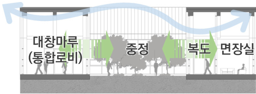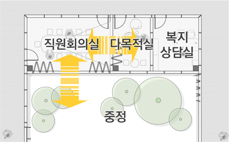 대창마루를 통과하는 빛과 바람은 내부와 외부를 자연스럽게 이어주고, 실내 어디서든 계절의 변화를 느낄 수 있도록 한다. 중정은 단순한 휴식 공간을 넘어 주민과 근무자가 함께 누리는 열린 풍경이 되며, 사계절 다른 표정을 품어 삶의 리듬을 더한다. 회의실은 필요할 때는 업무 공간으로 활용되지만, 문을 열면 곧바로 주민을 위한 강연·전시·동아리 활동의 무대로 확장된다. 일상의 공공성과 비일상의 특별함이 공존하는 공간이다.