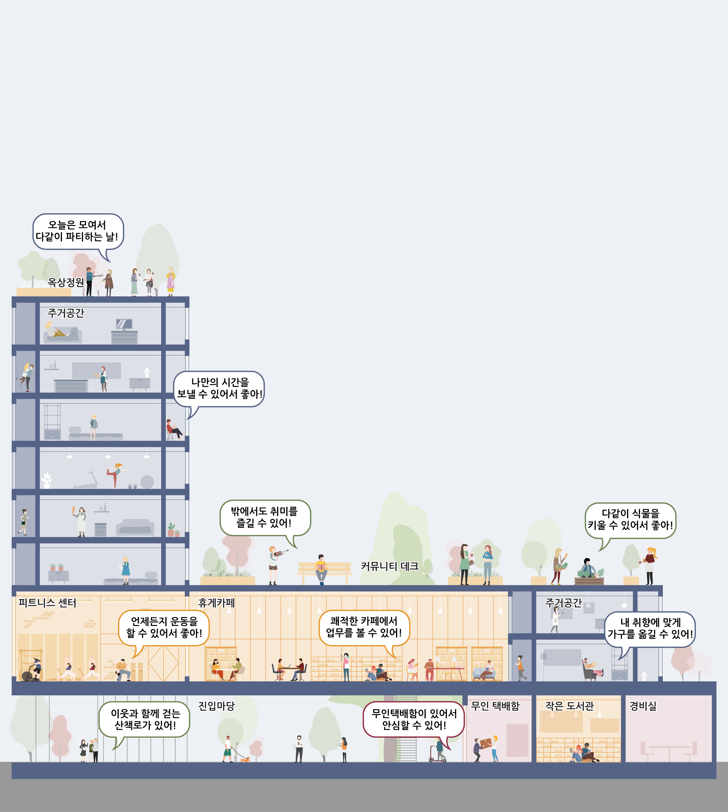 사업대상지는 청년 신혼부부 행복주택과 청년 임대주택 사이에 자리 잡음으로써 도시의 숲을 따라 동선을 연결하고 청년 관련 부대시설(작은도서관, 휴게카페, 피트니스센터) 계획을 통해 인접 시설들을 아우르는 공간이 될 것입니다.