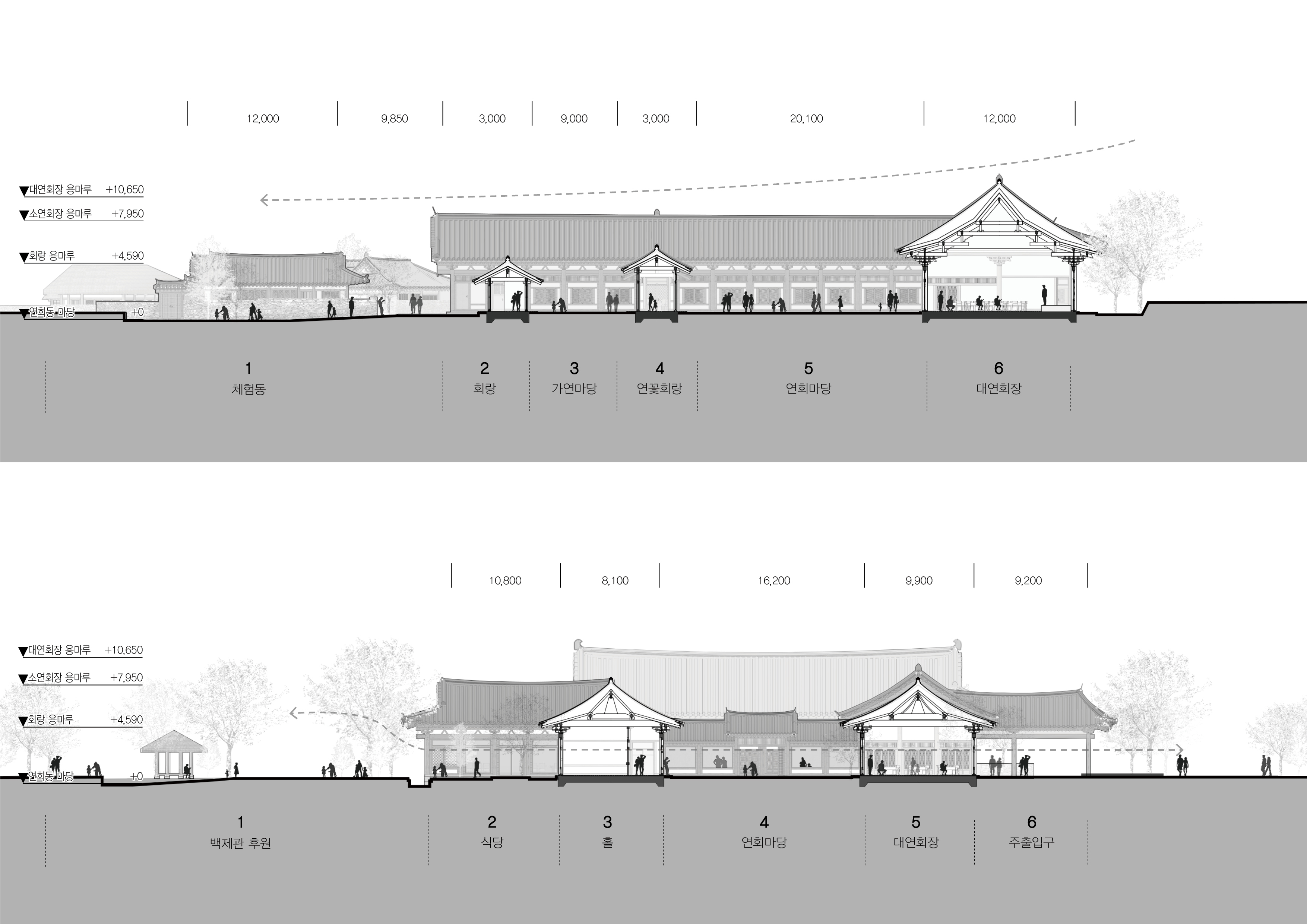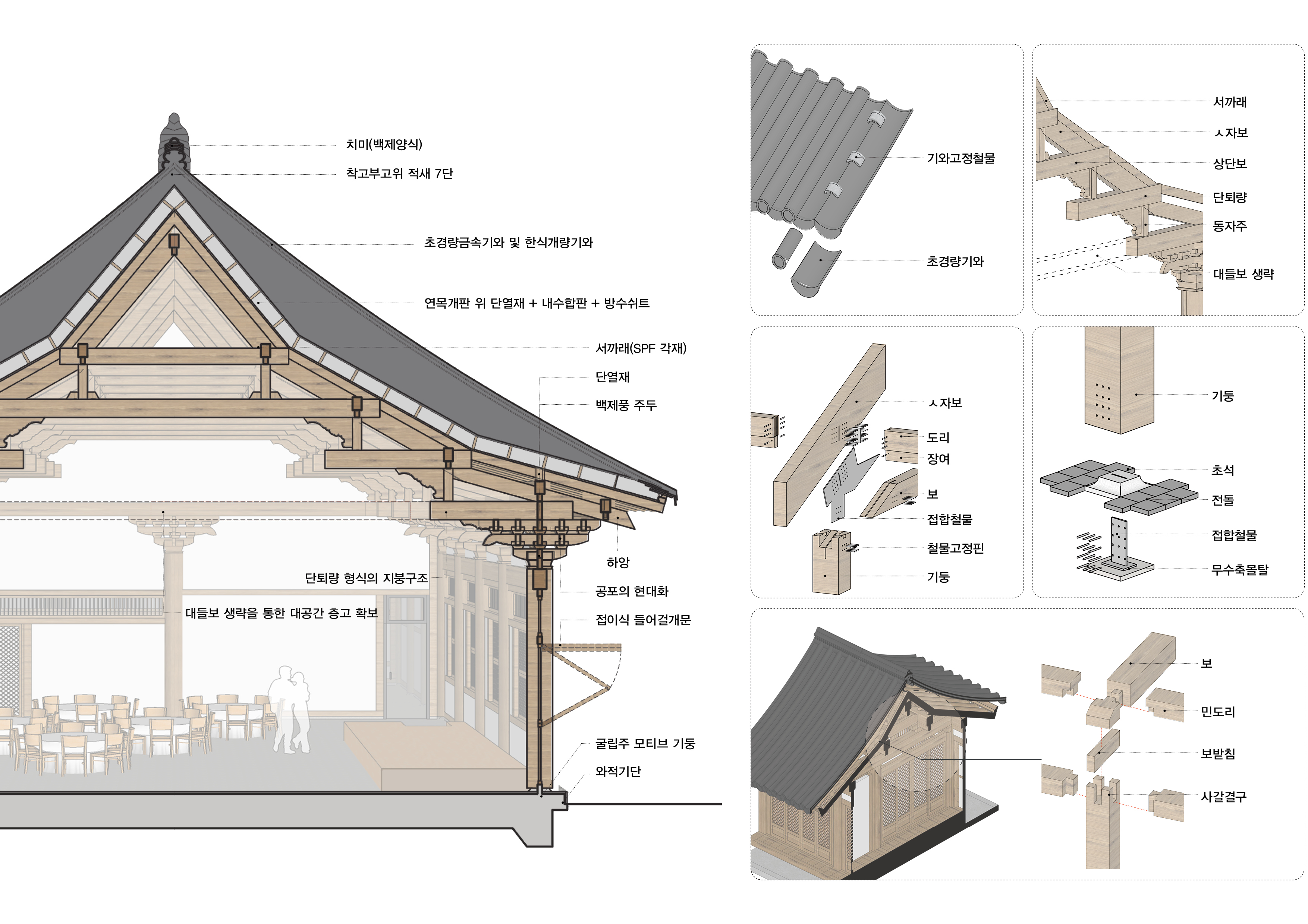 구조적으로는 연회동에 글루램과 철물을 병행한 중목구조를 적용해 대경간 공간을 확보했고, 체험동에는 전통 결구법을 반영해 소규모 한옥의 역사성과 공간적 밀도를 유지했다. 이처럼 백제관은 단순한 과거의 재현이 아니라, 시간의 결을 더하고 풍경에 스며드는 방식으로 새로운 백제 고을의 경관을 열어가는 공간으로 구상했다.