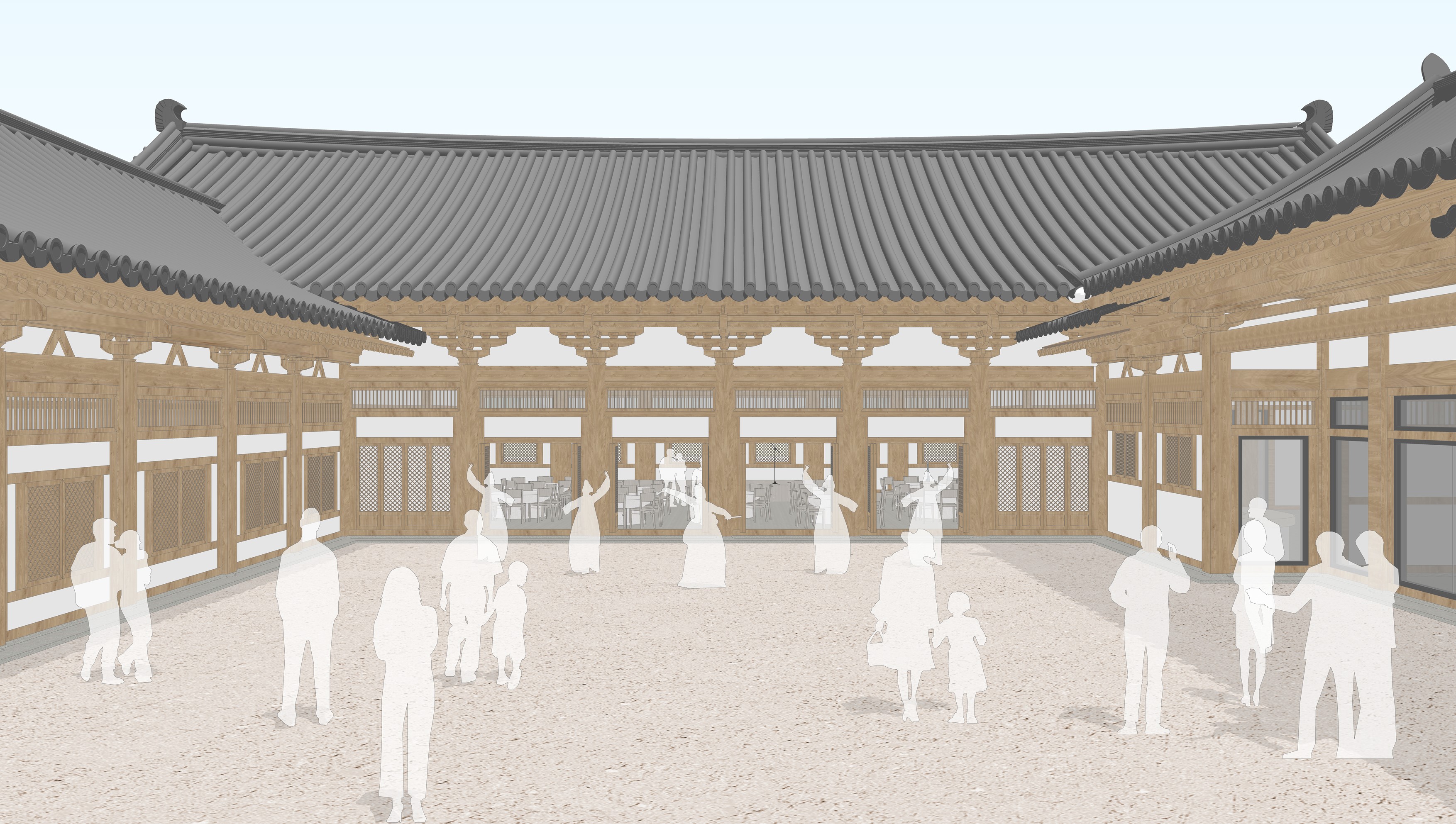 백제관은 과거를 단순히 재현하는 공간이 아니라, 시간의 결을 더해 풍경 속에 스며들며 백제 고을의 새로운 경관을 여는 무대이다. 방문자는 이곳에서 걷고 머무는 경험을 통해, 사비백제의 정신을 오늘의 부여 안에서 다시 살아보게 된다. 그 출발점은 ‘마당’이다. 한옥 공간구조의 본질은 언제나 마당을 향해 열리고, 서로를 품는 관계 속에서 드러난다. 마당은 시선과 동선, 빛과 바람이 모이는 중심이자 서로 다른 공간을 부드럽게 이어주는 매개체이다. 이러한 질서를 현대적으로 풀어내어, 머무름과 교류가 자연스럽게 일어나는 열린 풍경으로 이어지게 했다. 또한 부여라는 도시는 지층처럼 쌓인 역사와 기억의 단층 위에 놓여 있다. 설계는 과거의 형식을 단순히 답습하기보다, 그 축적된 시간의 결을 오늘의 언어로 다시 새겨 넣는다. 새로운 시간이 덧입혀지는 과정 속에서, 건축은 과거와 현재, 미래가 공존하는 풍경을 만든다. 마지막으로, 백제관은 ‘백제 고을의 풍경’을 지향한다. 부여의 자연 환경과 도시 맥락, 그리고 문화유산과 조응하는 건축은 크지 않은 몸짓으로 땅에 스며들고, 지형의 흐름과 경관 속에서 드러나고 숨는다. 도시의 결, 자연의 숨결, 사람의 움직임이 겹쳐지며 만들어지는 이 풍경은, 백제가 가졌던 자연친화적 공간관을 오늘에 다시 펼쳐내는 시도이기도 하다.