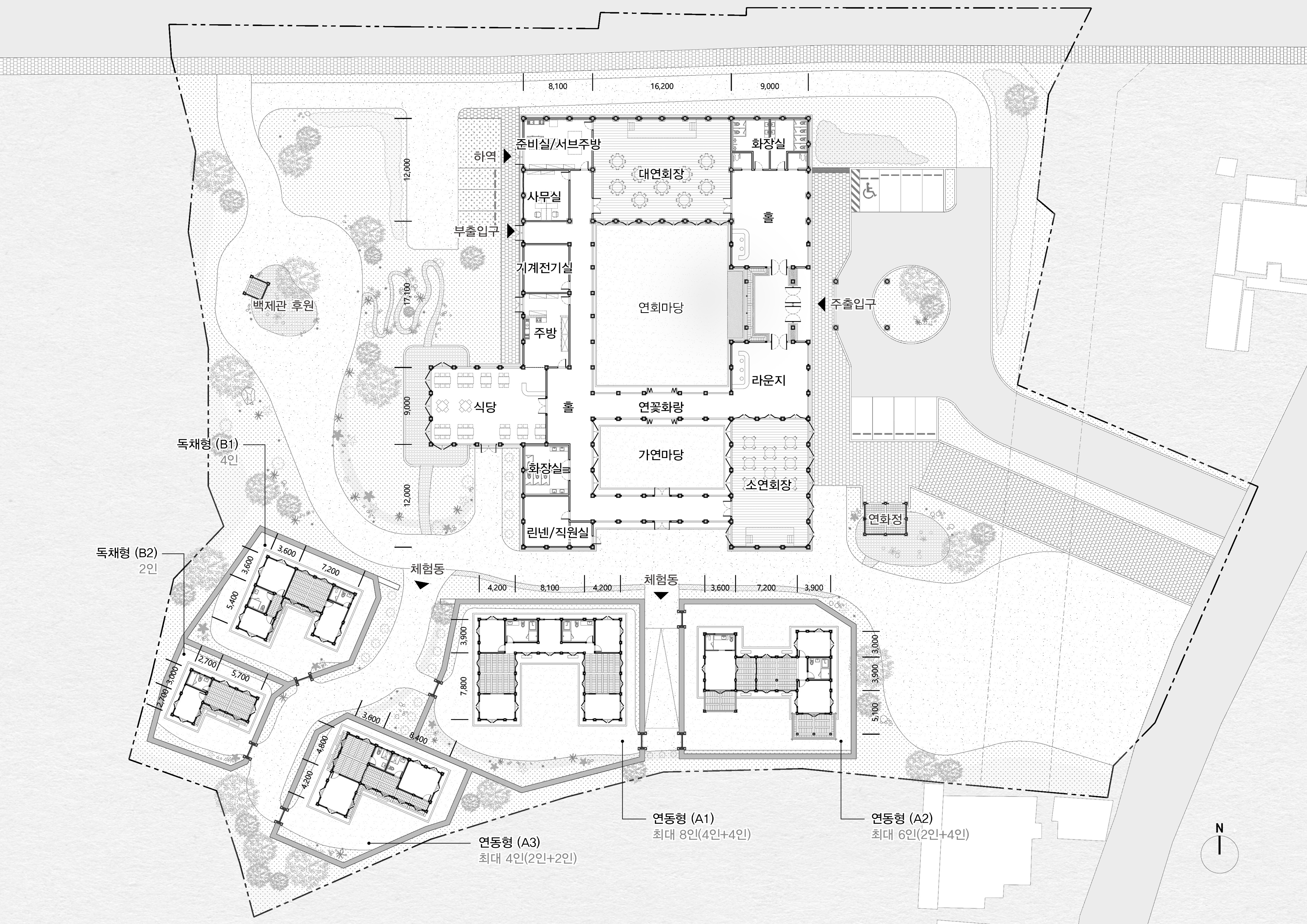 백제관은 부여의 지형과 역사 도시의 축을 읽어내어 자연축과 문화축 위에 배치했다. 연회동과 체험동은 각기 다른 성격을 가지면서도 마당과 회랑, 안길로 연결되어 하나의 질서를 이루도록 계획했다. 연회동은 대경간 한옥 구조와 9량가를 적용해 중심성과 개방감을 강조했고, 체험동은 단체형과 프라이빗 독채형을 아우르는 구성을 통해 다양한 체험을 가능하게 했다.