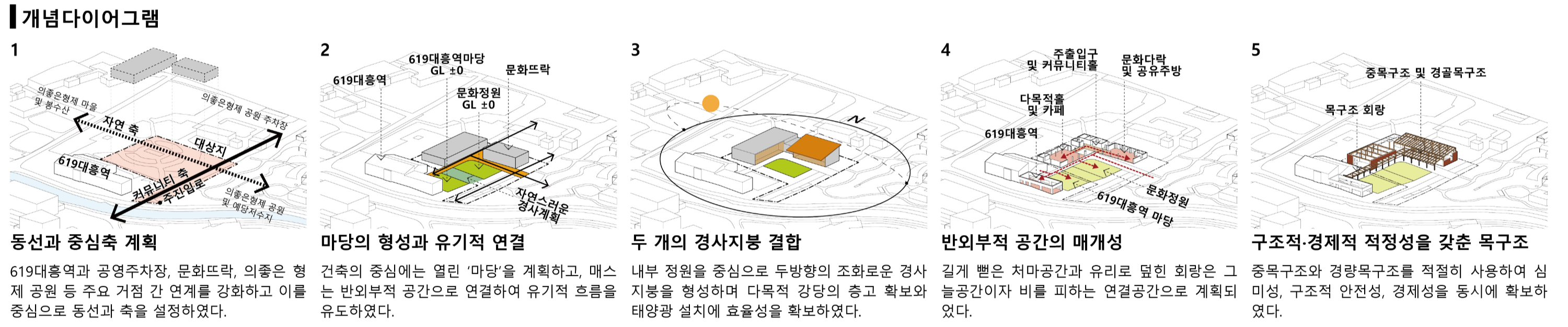 계획 개념은 크게 다섯 가지로 정리된다. 첫째, 동선과 중심축을 설정하여 대흥역과 의좋은 형제공원, 공영주차장, 문화뜨락을 하나의 흐름으로 연결하였다. 이 축은 단순한 이동 통로를 넘어 생활의 동선이자 경험의 경로로 기능하며, 이용자는 단절 없이 이동하고 주민은 일상 속에서 공원과 문화시설을 손쉽게 오갈 수 있다. 둘째, 건축의 중심에 열린 마당을 배치하고 이를 둘러싼 회랑과 깊은 처마를 통해 내부와 외부가 자연스럽게 이어지도록 하였다. 이러한 공간 구성은 문화뜨락 이용자와 공원을 찾는 주민이 머무르며 소통할 수 있는 유기적 장을 형성한다. 셋째, 두 개의 경사지붕을 결합한 건축 형태를 도입하였다. 북측 지붕은 부지의 경사와 조화를 이루고, 남측 지붕은 태양광 패널 설치에 유리한 방향으로 열려 있다. 두 지붕은 서로 기대듯 어울리며 친환경성과 맥락성을 동시에 실현한다. 넷째, 넓은 처마 아래 반외부 공간을 두어 내부와 외부를 매끄럽게 연결하고, 문화정원과 실내 프로그램 사이를 매개하는 완충지대로 활용하였다. 다섯째, 중목구조와 경골목구조를 결합한 합리적 목구조 시스템을 적용하여 구조적 안정성과 경제성을 확보하였다. 주요 부재를 노출시켜 목재의 물성과 구조미를 드러내고, 합리적인 치수와 접합 방식을 통해 시공 효율성과 지속가능성을 강화하였다.